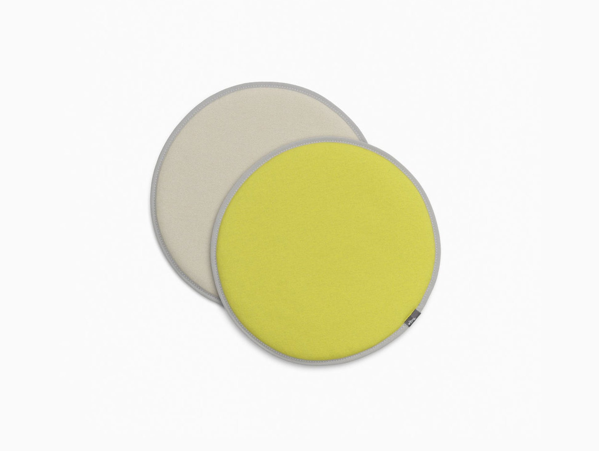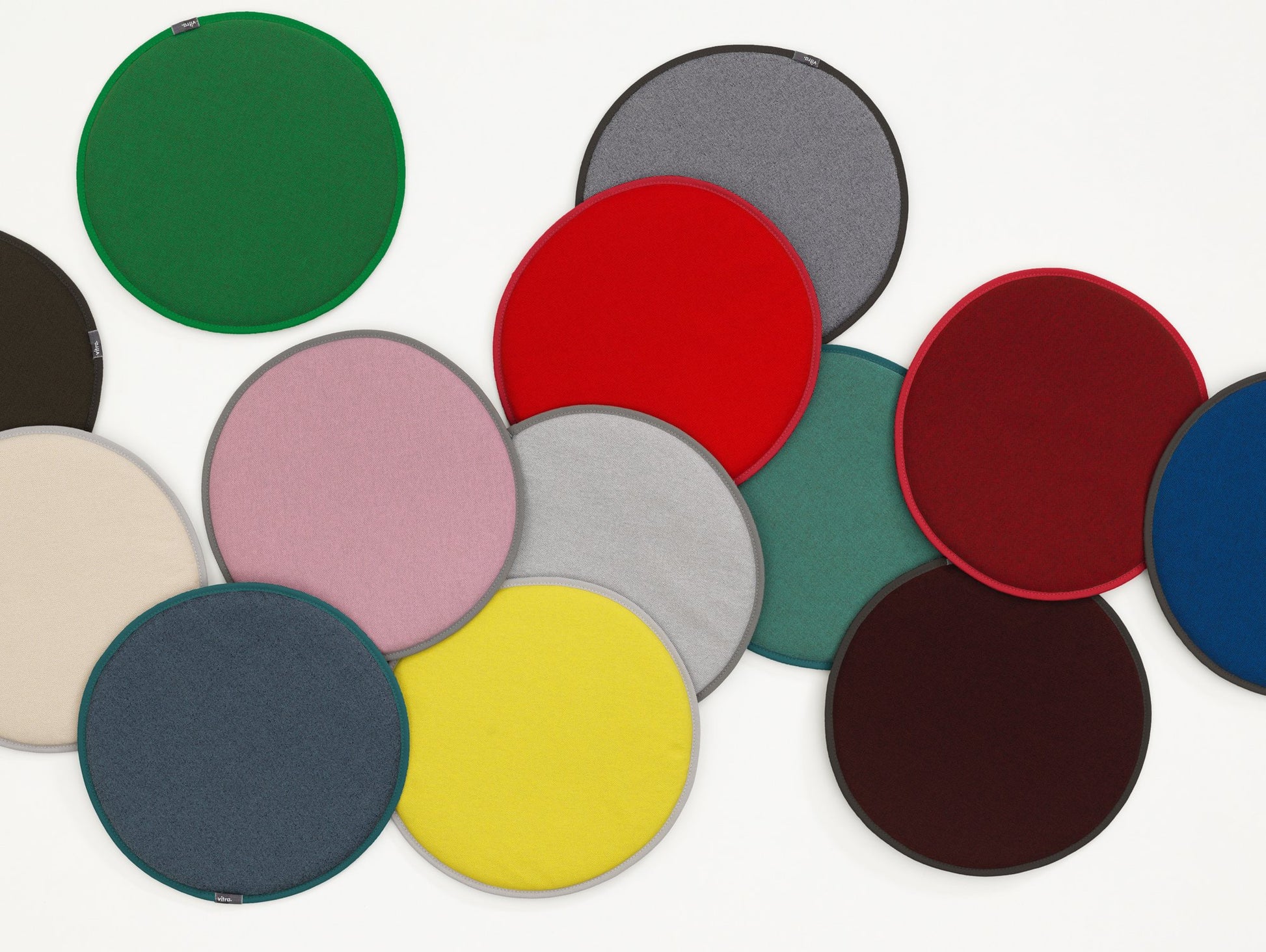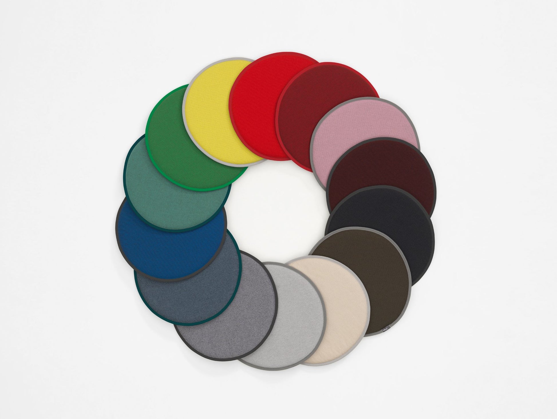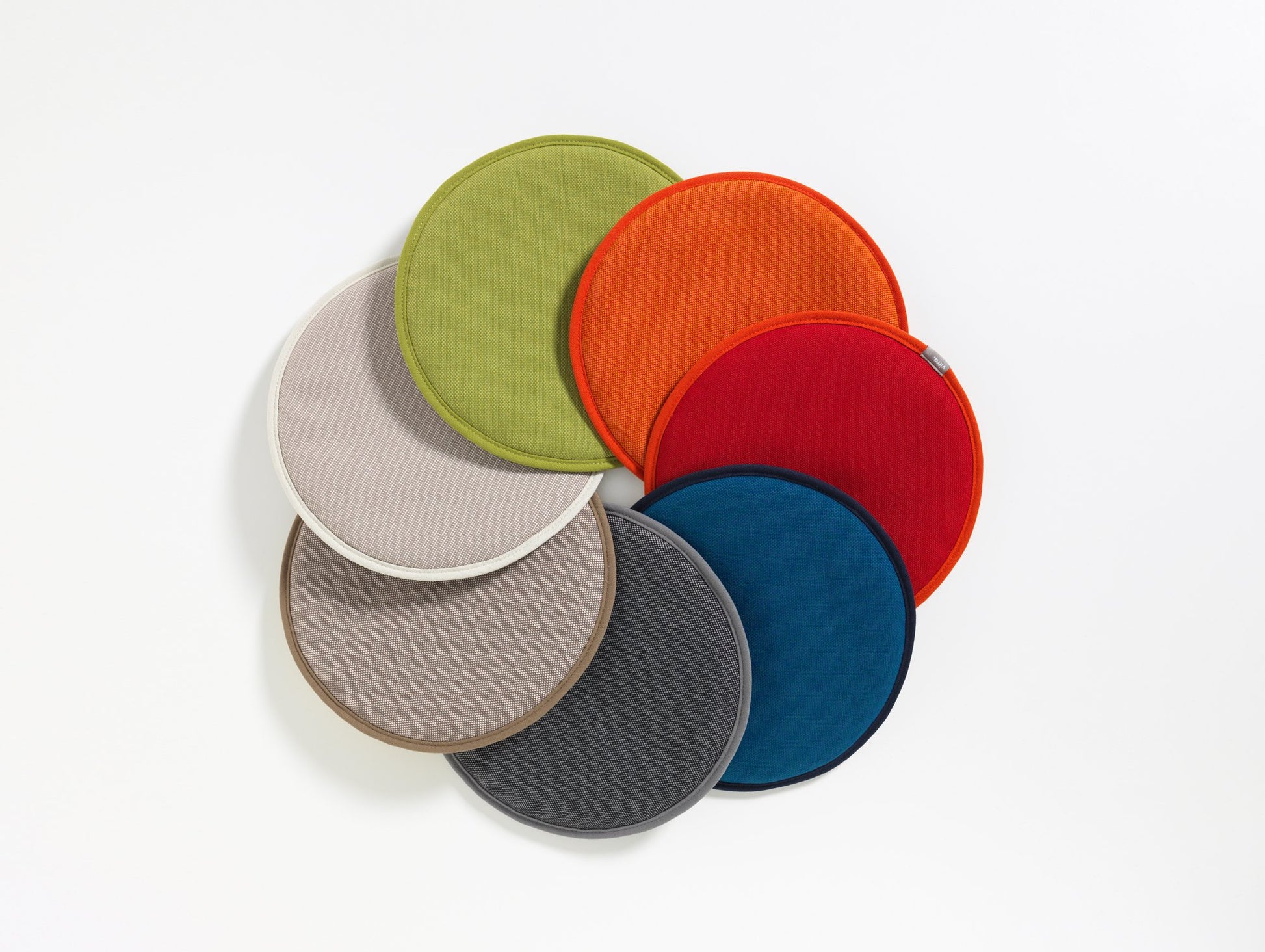 The round upholstered Seat Dot cushions offer a simple way to add comfort to chairs made of plastic, wood or metal. The different coloured faces create subtle or bold accents, which are further enhanced by the edge binding.