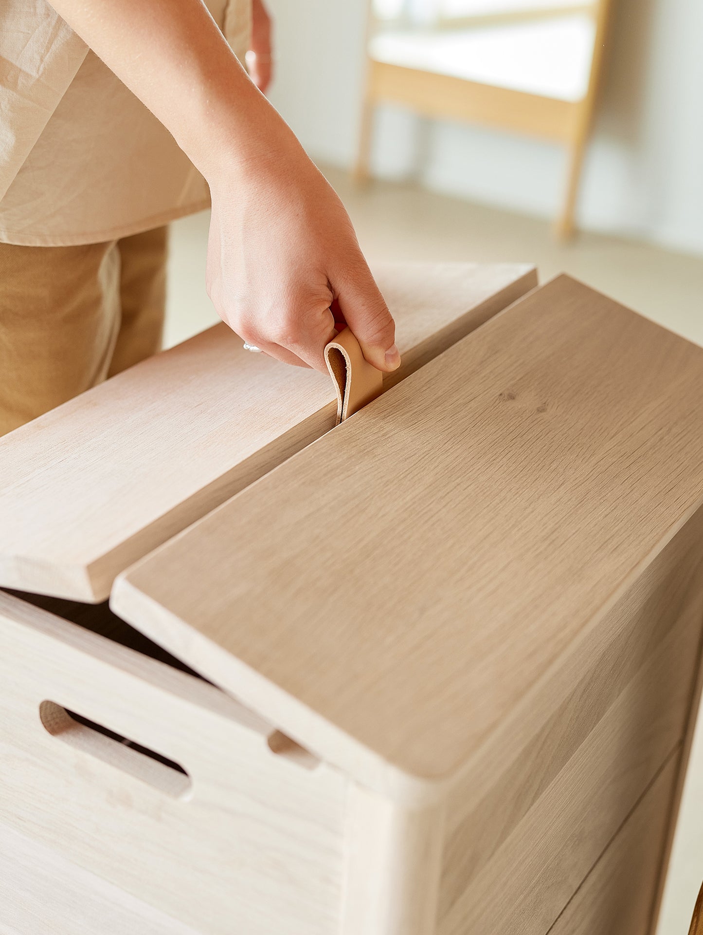 The top slides open via a natural leather pull handle and a notch in the oak construction holds the lid in place while used. Four svelte oak legs raise the box and lightens the appearance, while the overall design is solid and robust. With a weight of 12 Kg the box stays firmly in place, but it is easily moved nearer to the washing machine thanks to recessed handles on both sides. There are three gaps in the pieces of wood that make up the sides of the box, this is to allow air to circulate freely inside and prevent moisture from being trapped inside.