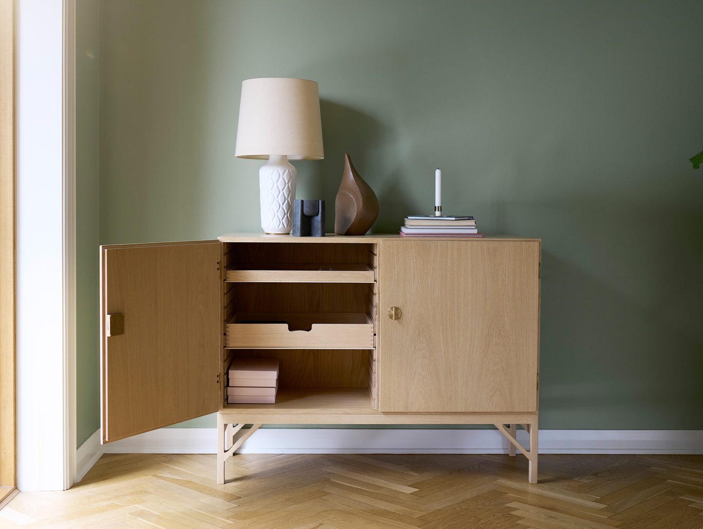 Designed by Borge Mogensen in 1964, the A232 Sideboard combines luxury and practical storage. Made from an oak veneer body with a solid oak base, the sideboard features two compartments behind the doors. The brass knobs not only enhance its natural wood finish with an elegant touch but also serve as locks to securely store your belongings.