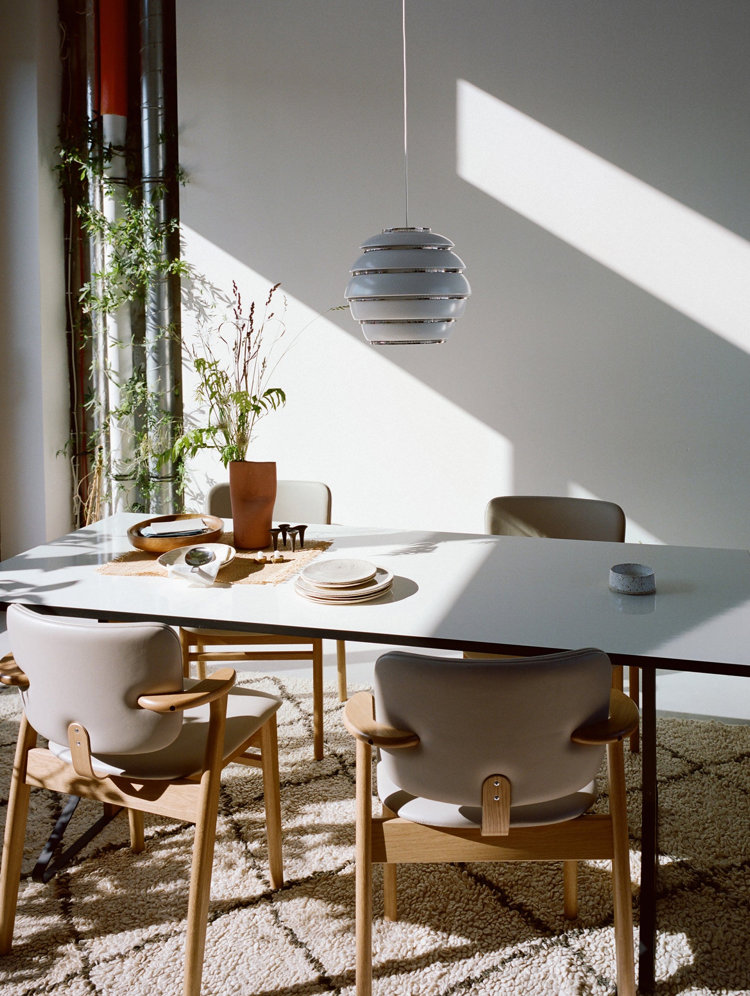 Originally designed for Finland's University of Jyväskylä in 1953, Alvar Aalto's A331 Pendant is one of his most recognisable and beloved pendant light designs. As the name suggests, the A331 Beehive light was inspired by a beehive's layered structure, which is reflected in its organic form. Featuring polished brass or chrome plated rings which filter and diffuse the light softly around the room, it conveys a sense of weightlessness and ethereal beauty reminiscent of a mobile ornament.