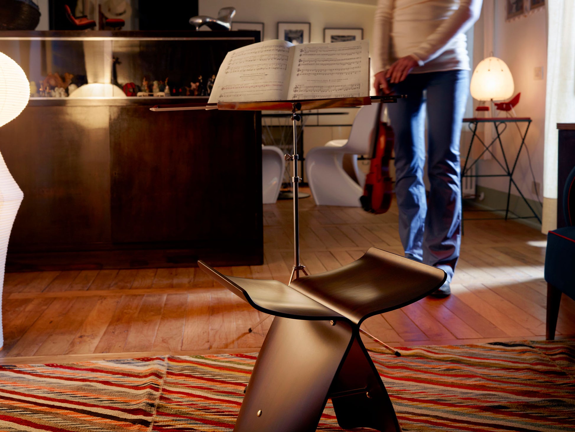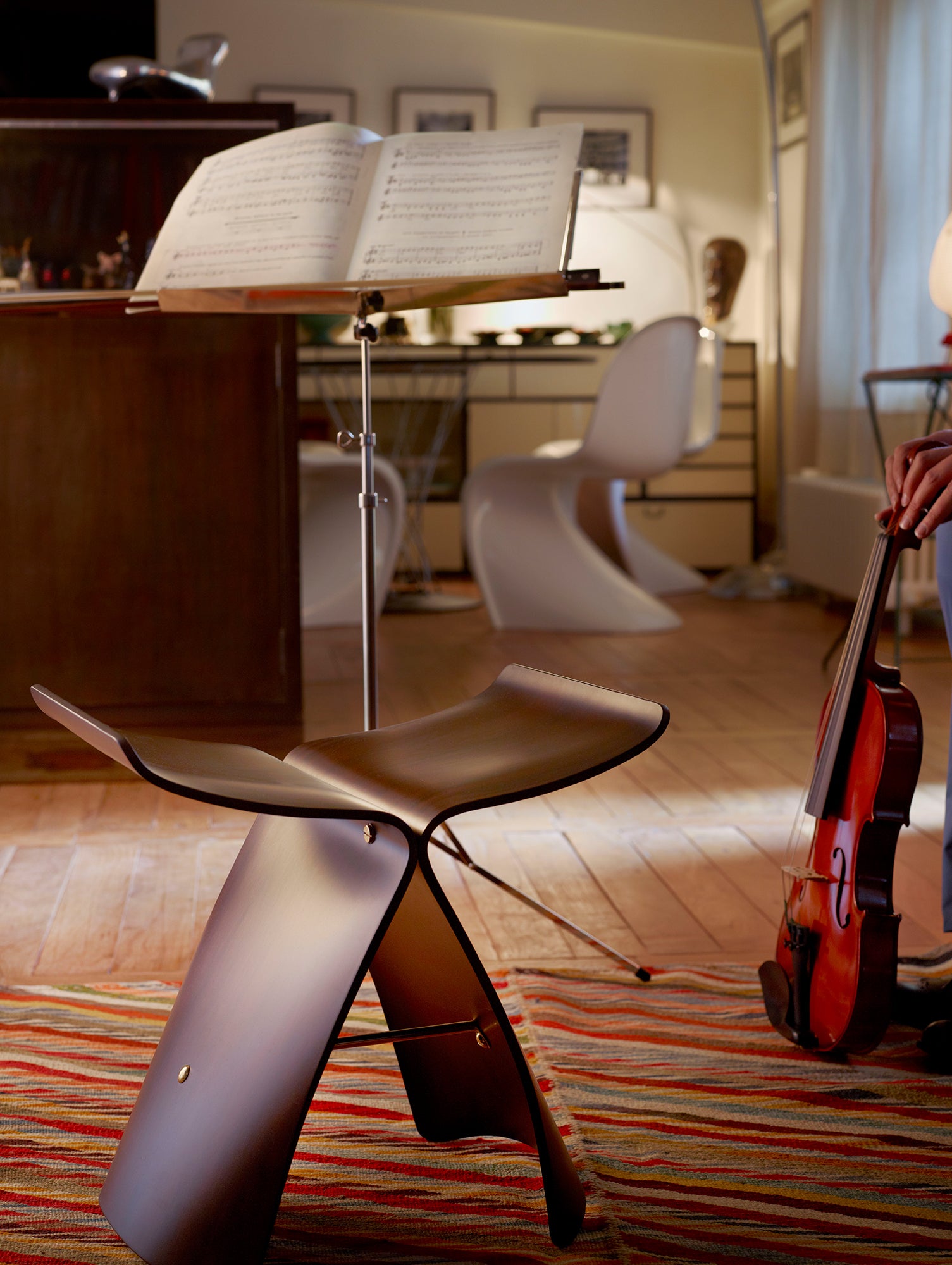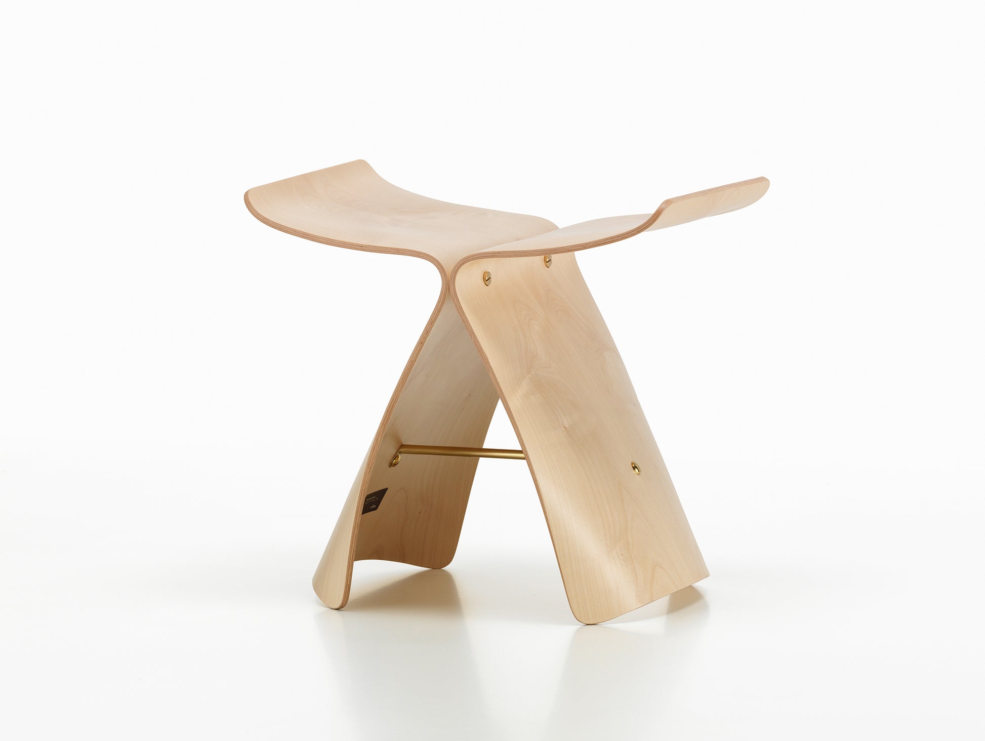 The stool's delicate yet sturdy form embodies the elegance and simplicity of Japanese art and culture. The gently curving silhouette of the twin seat shells is reminiscent of a butterfly's wings. The stool's compact dimensions make it adaptable to a wide range of environments.