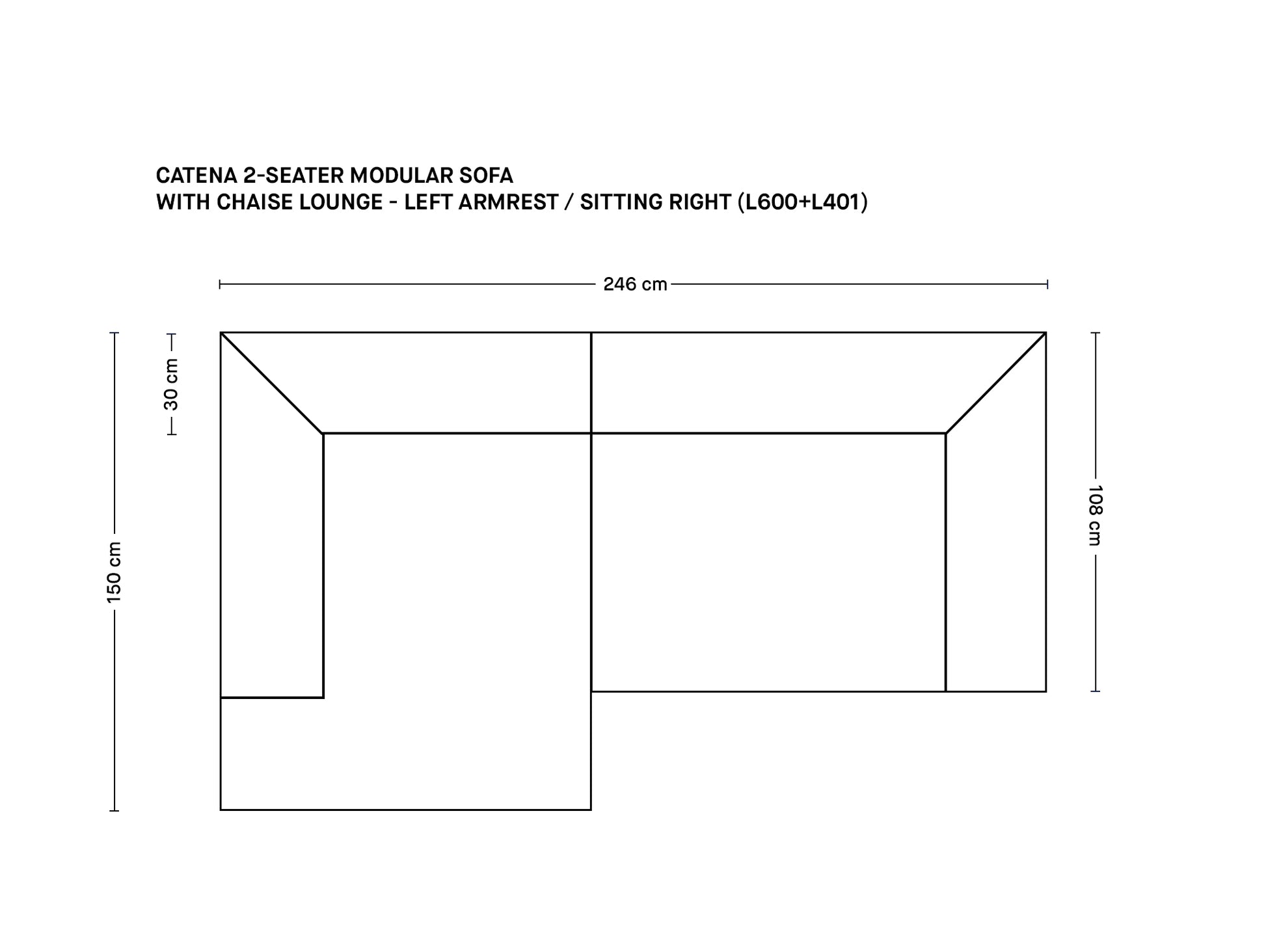2-Seater with Chaise Lounge with Armrest (available with right side armrest end module or left side armrest end module) - Width: 246 cm, Depth: 108/150 cm, Seat Depth: 78/120 cm, Height: 76 cm, Seat Height: 42 cm, Backrest Height: 34 cm