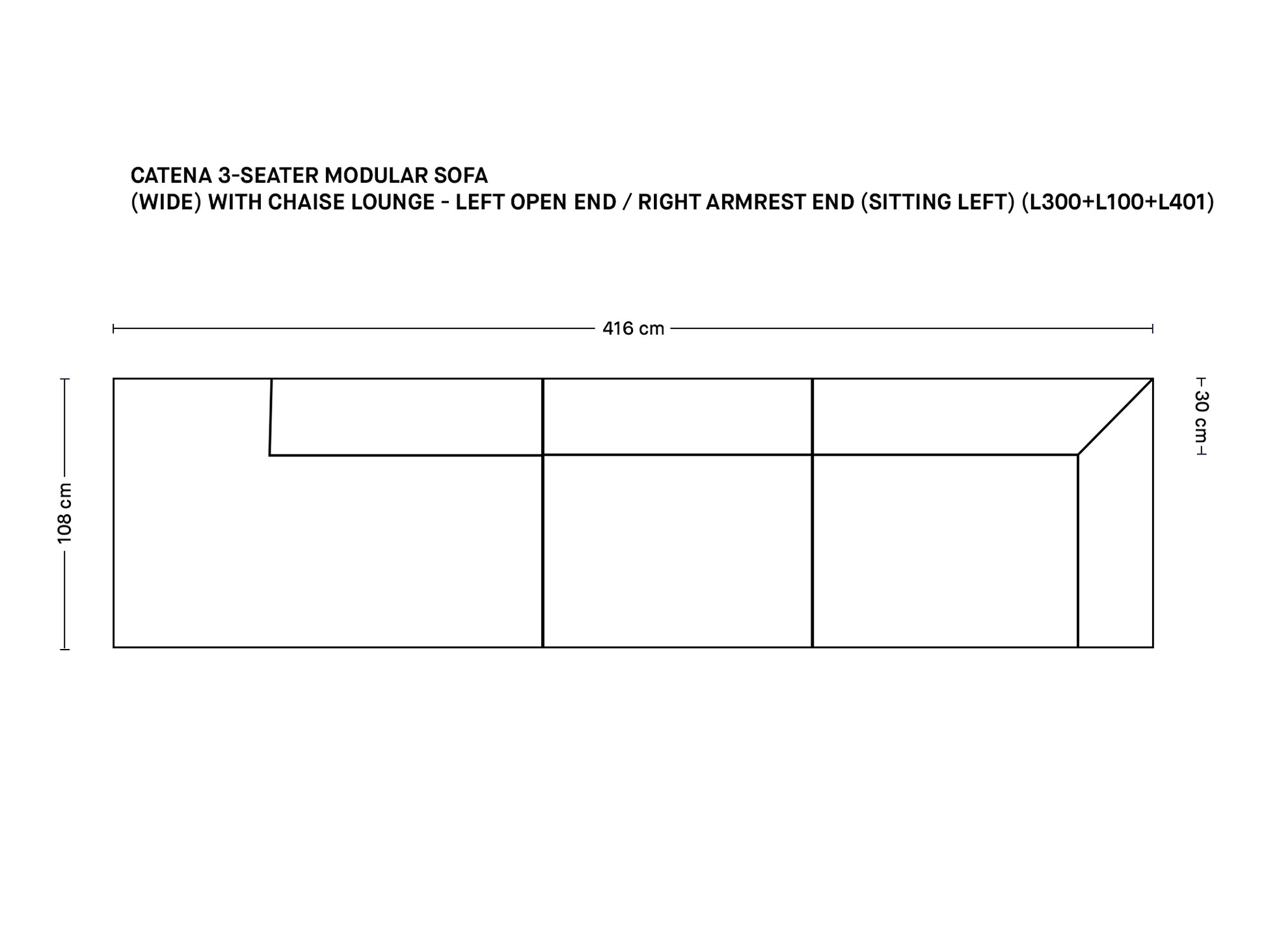 3-Seater (Wide) with Chaise Lounge (Available with right armrest end or left armrest end) - Width: 416 cm, Height: 76 cm, Seat Height: 42 cm, Depth: 108 cm, Seat Depth: 78 cm