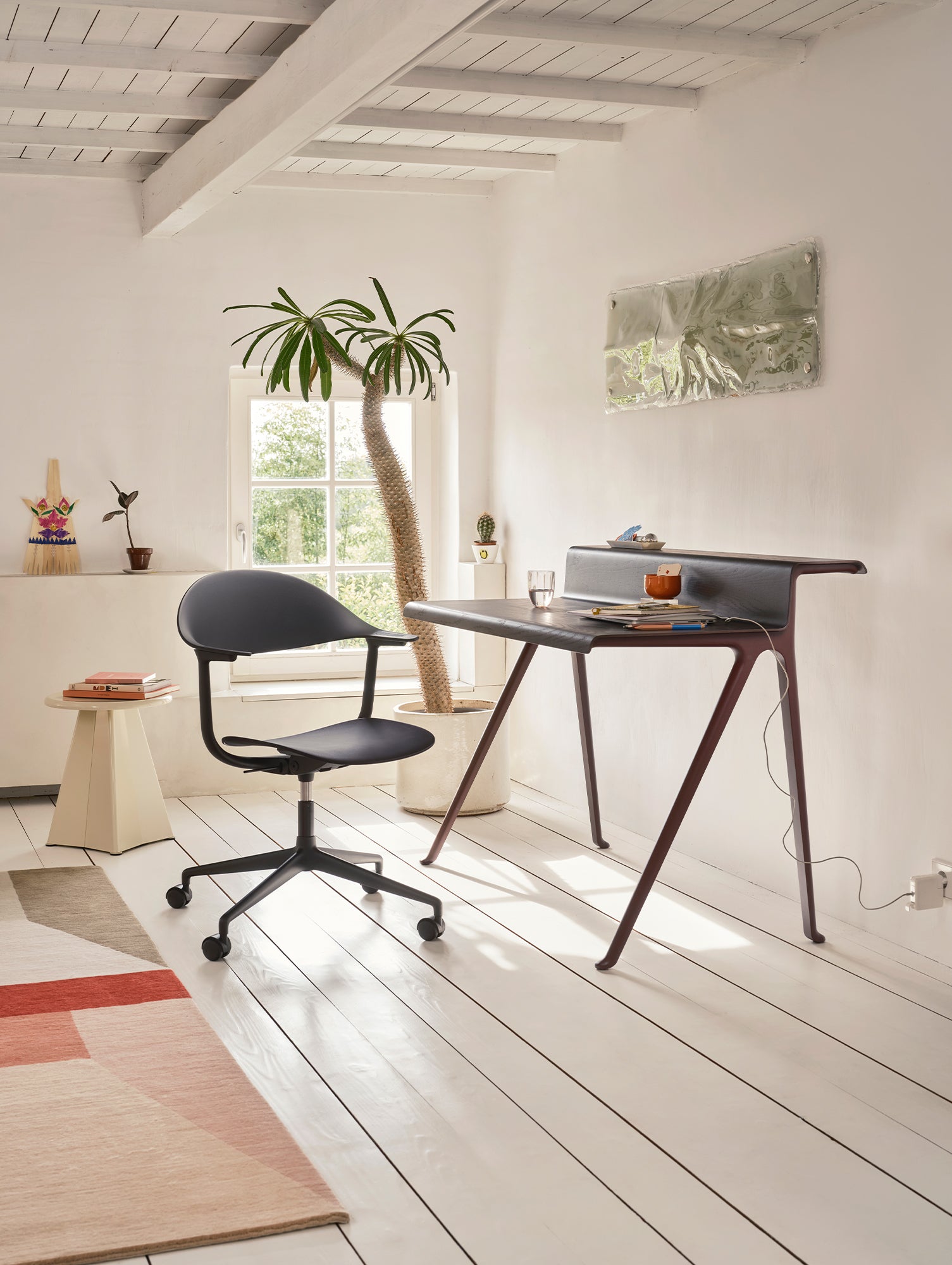 The Courier Desk is designed by French artist and designer Ronan Bouroullec. The desk's side profile resembles the form of a serif letter, which led to the name Courier as a reference to the classic serif typeface. Influenced by the iconic V-shaped legs of Jean Prouvé’s Compas Direction desk, he simplified the geometry to create a more balanced and elegant silhouette. The design reflects his creative approach and highlights his focus on form, composition and technical expertise.