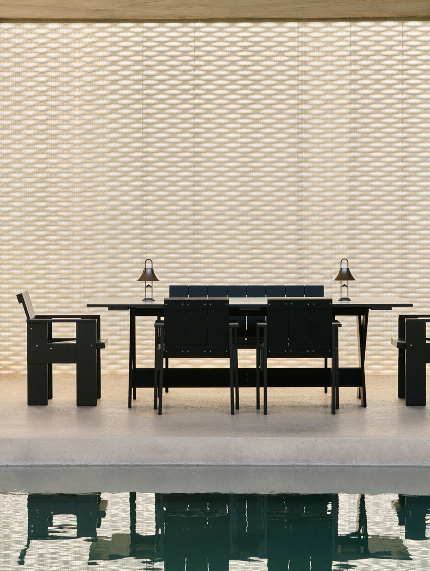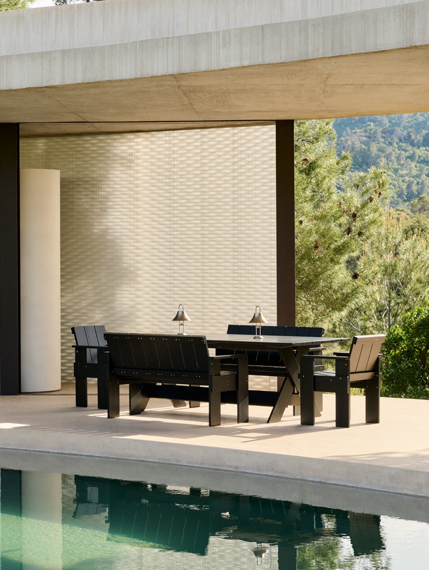 Featuring low proportions, a gently sloping back and a seat with supportive armrests, the chair's simplicity and spatial design mirror the designer's architectural style providing functionality and comfort. Crafted with FSC-certified solid pinewood with 3 layers of lacquer finish, the Crate Dining Chair is suitable for both outdoor and indoor use and the optional seat cushions provide extra comfort.