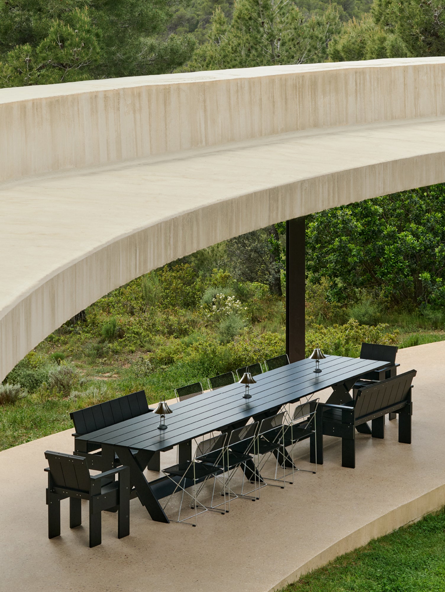 Featuring a simple flat-pack construction, the table's rectangular tabletop and diagonal crossbars add simplicity and reflect the designer's architectural style, providing functionality and perfect proportions. Crafted with FSC-certified solid pinewood and finished with three layers of lacquer, the Crate Dining Table is suitable for both outdoor and indoor use.