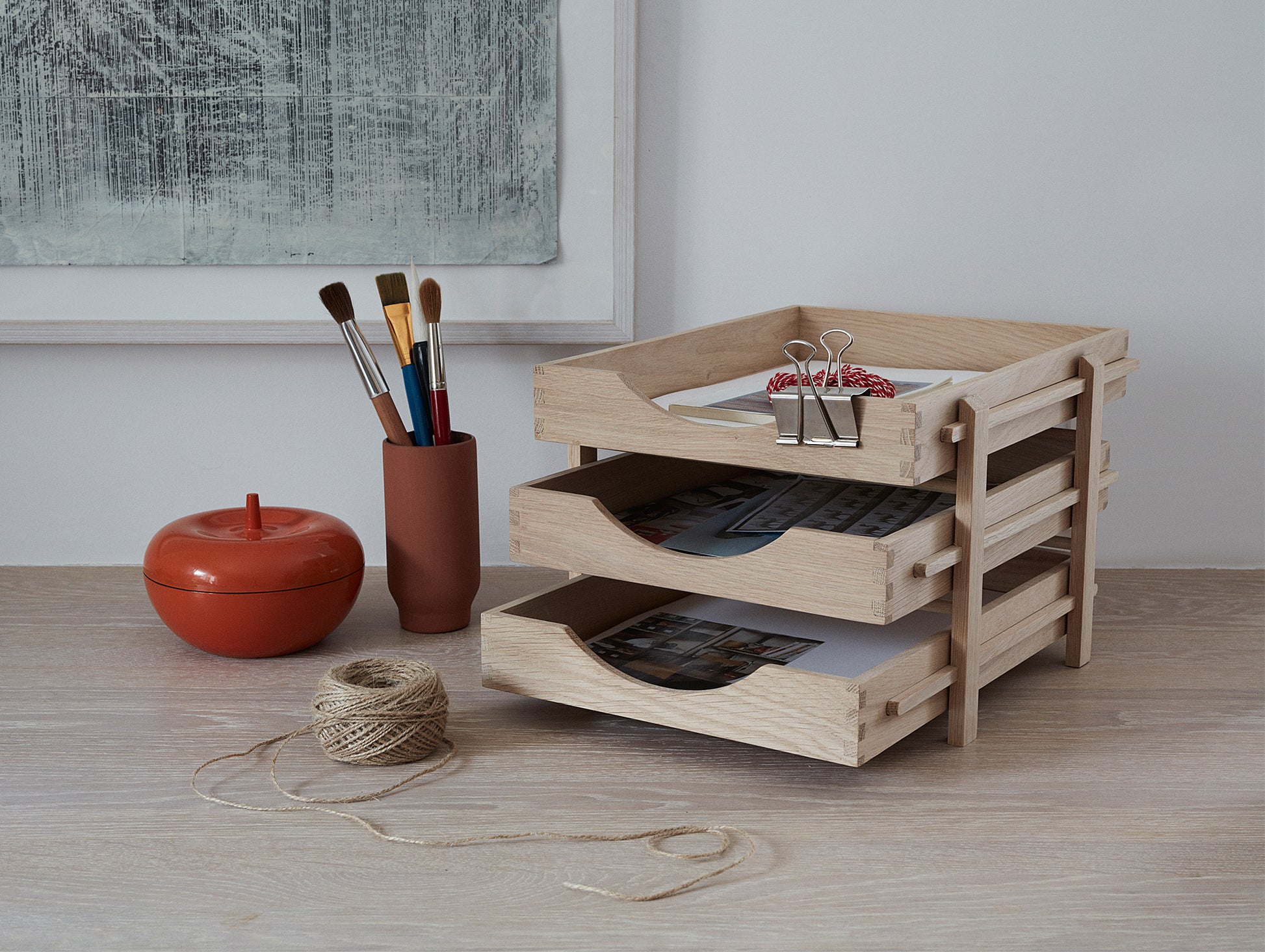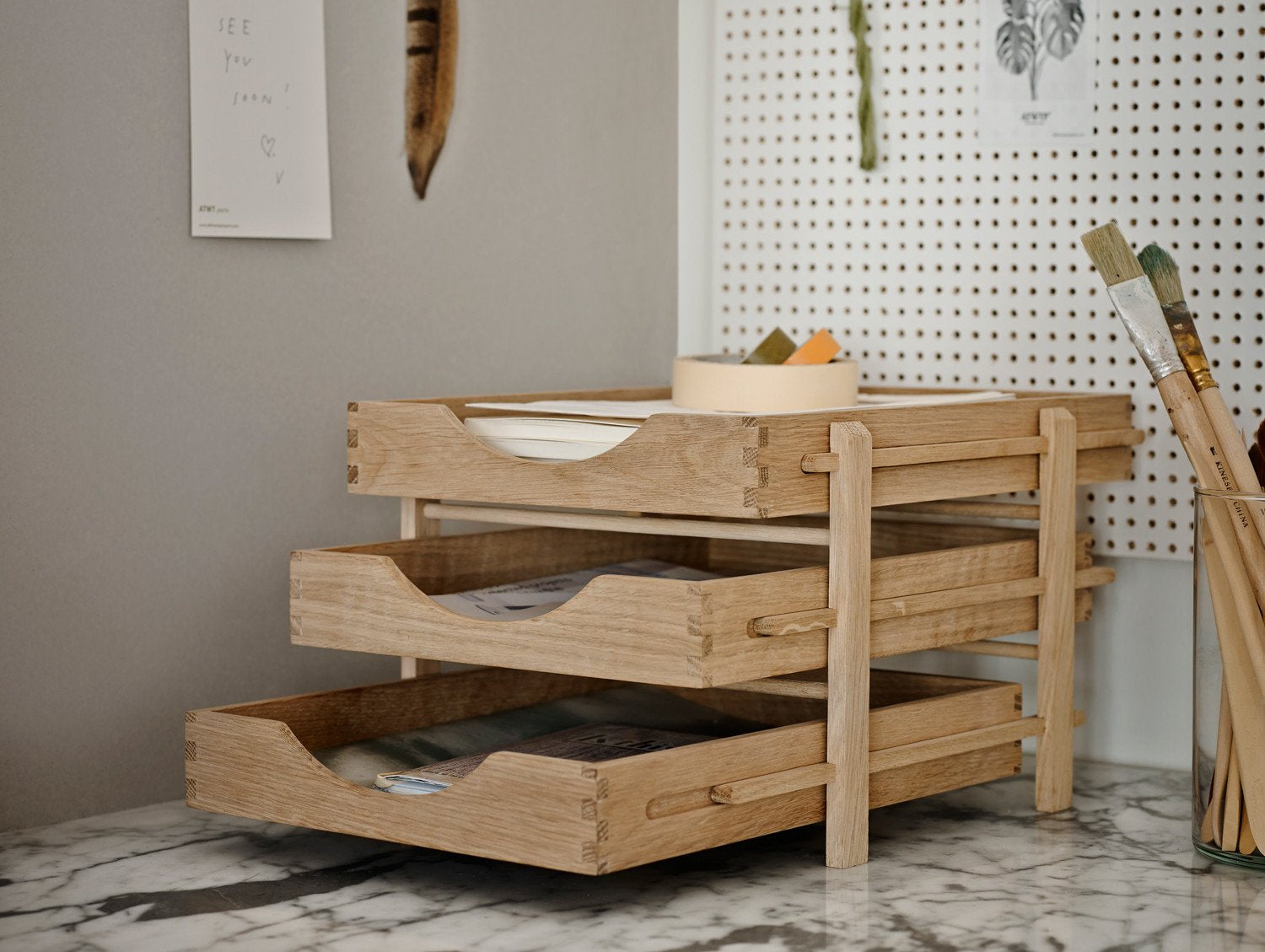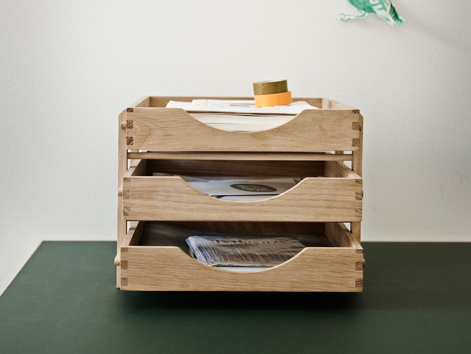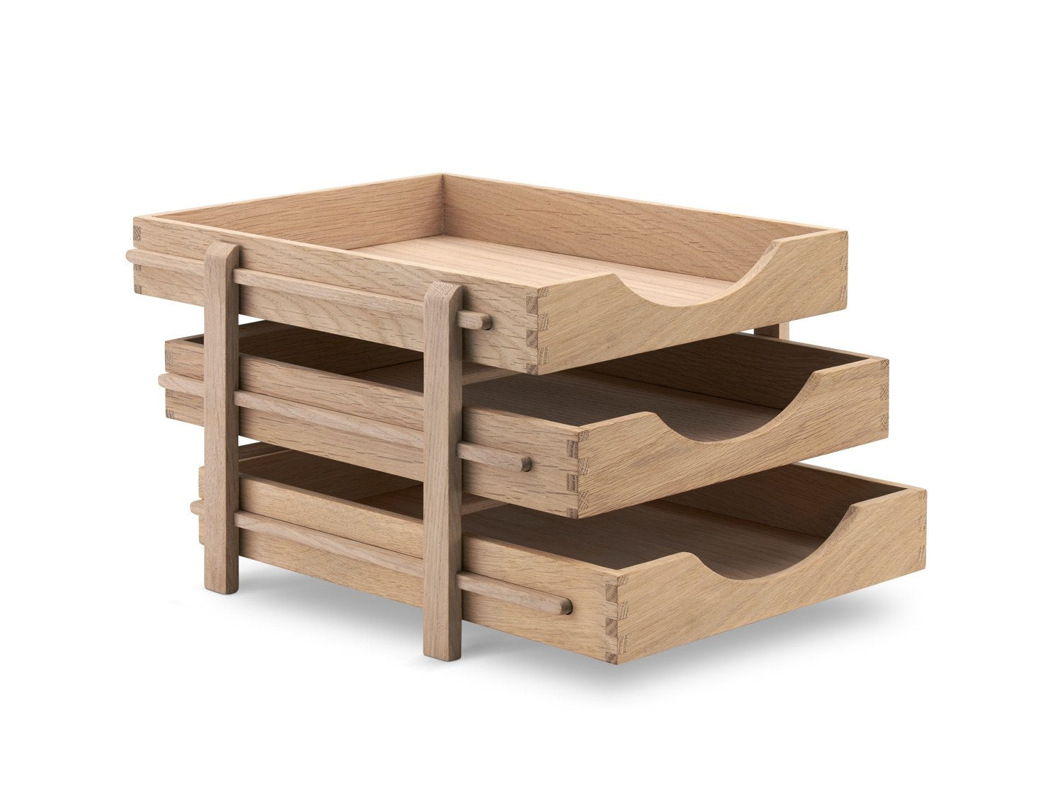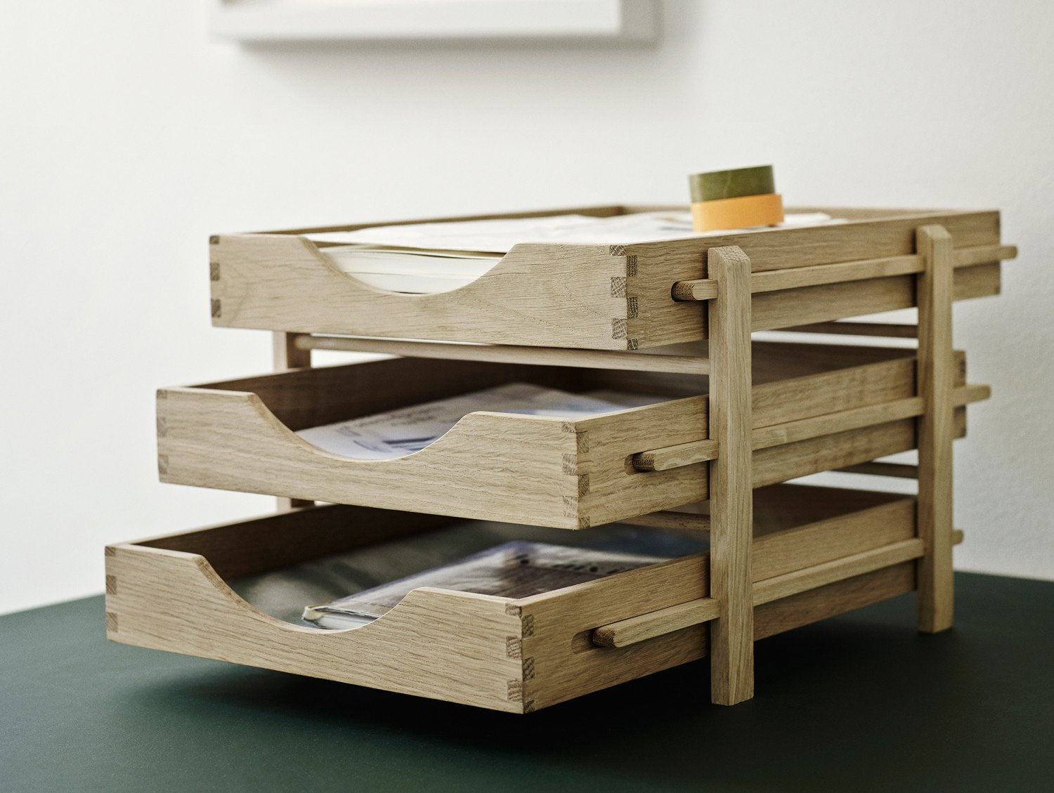 A minimal, stylish and functional letter tray with graduated levels, in a classic and recognisable office expression with three solid oak trays. For added flexibility, you can pull out each tray and take them with you when you work away from your desk.