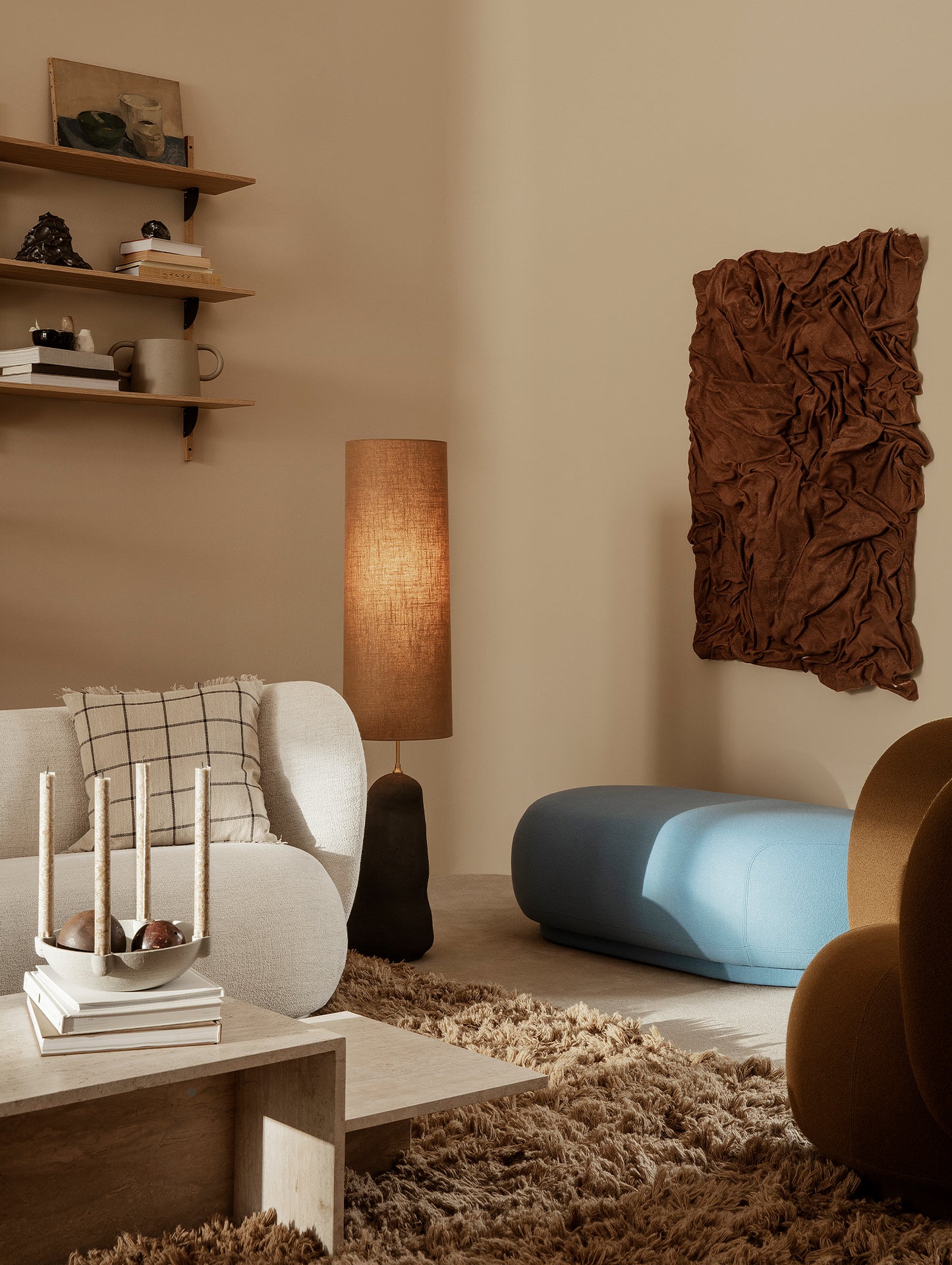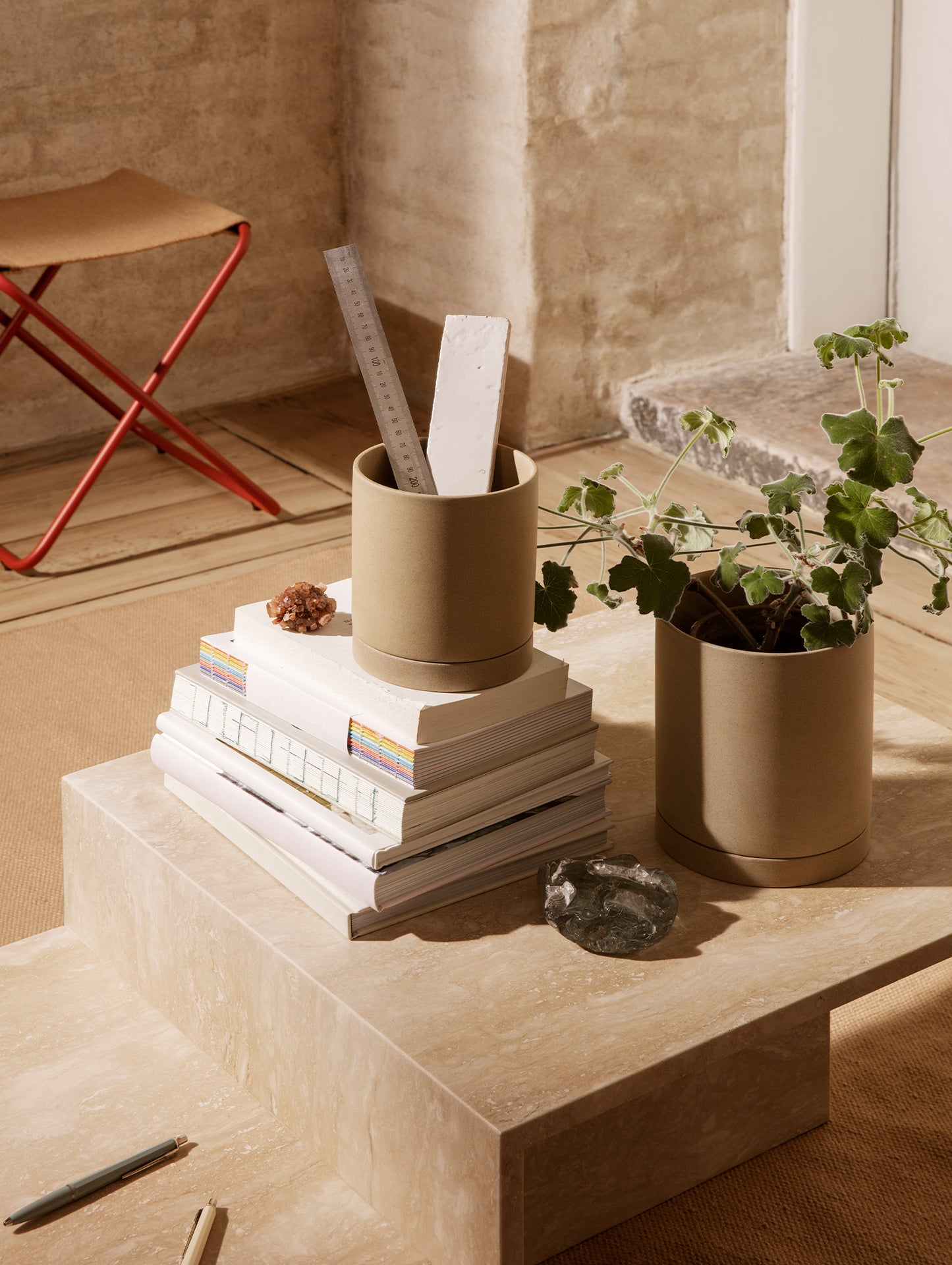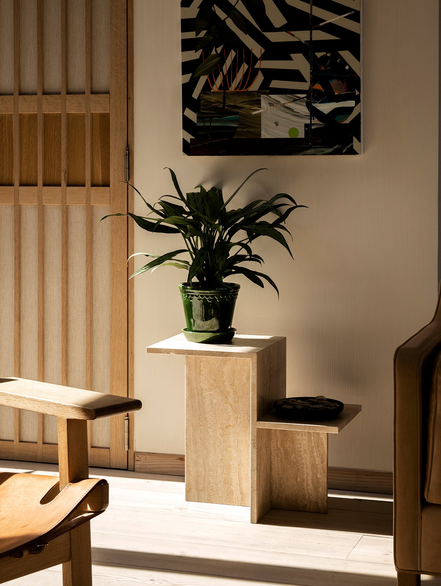 The Distinct Side and Coffee Tables are designed and produced by Ferm Living. Originally inspired by Japanese minimalism, the Distinct Tables explore the creation of complex structures based on a single element. The minimalist construction highlights the natural qualities of the materials. The sand-coloured travertine introduces richness with its earthy texture, whereas the oiled oak brings warmth and a refined organic expression. Both versions express the architectural character of the table.