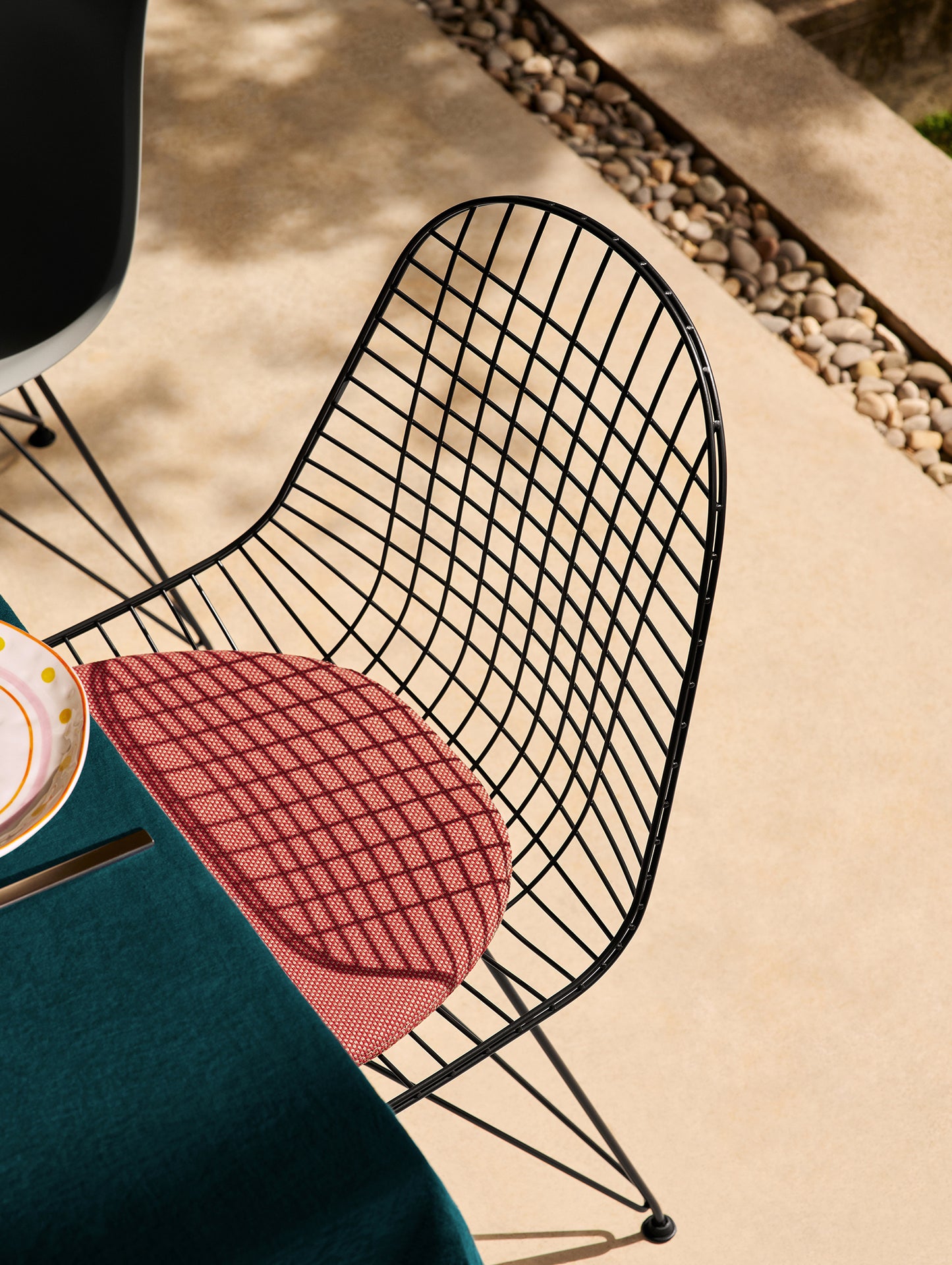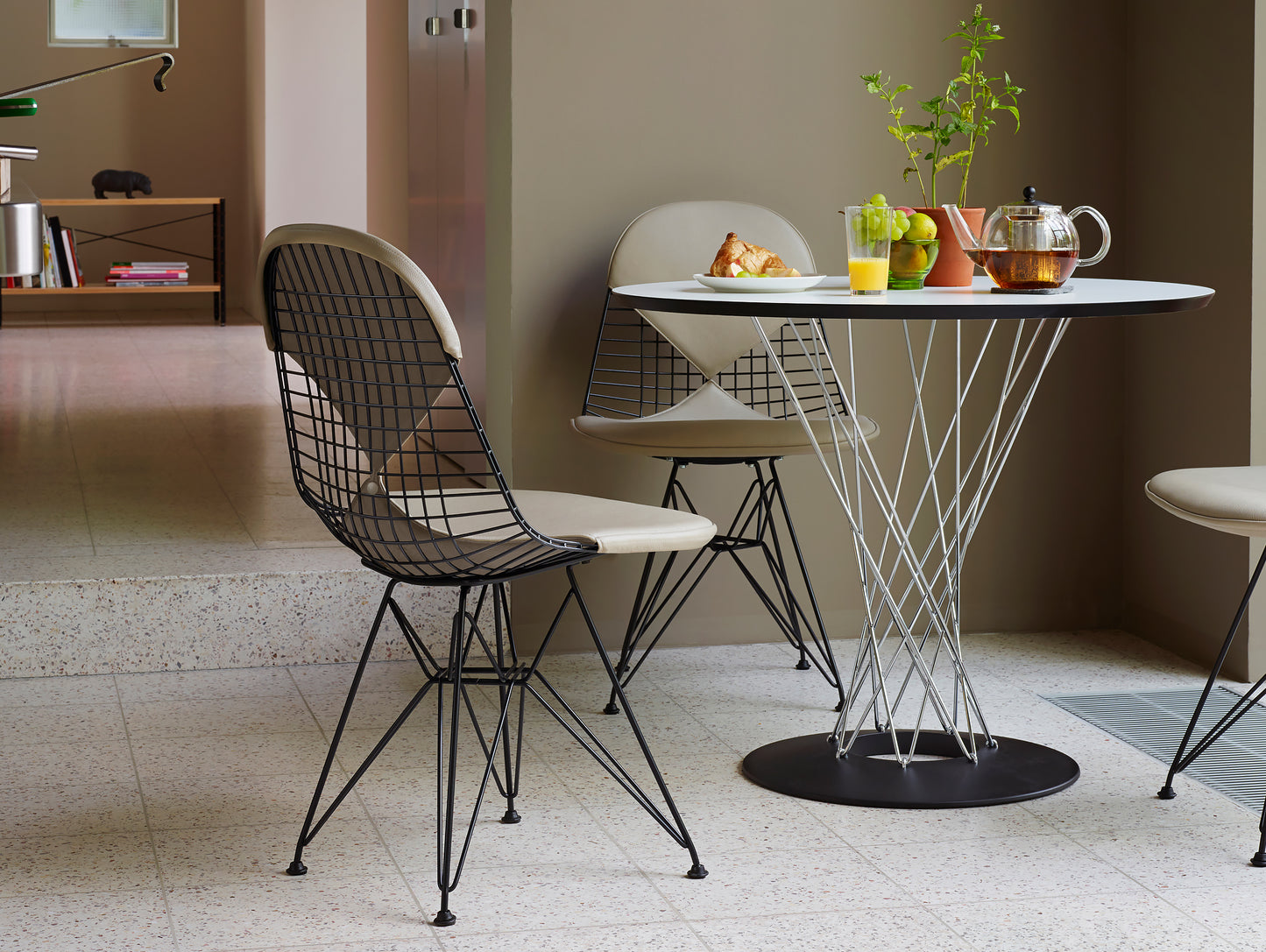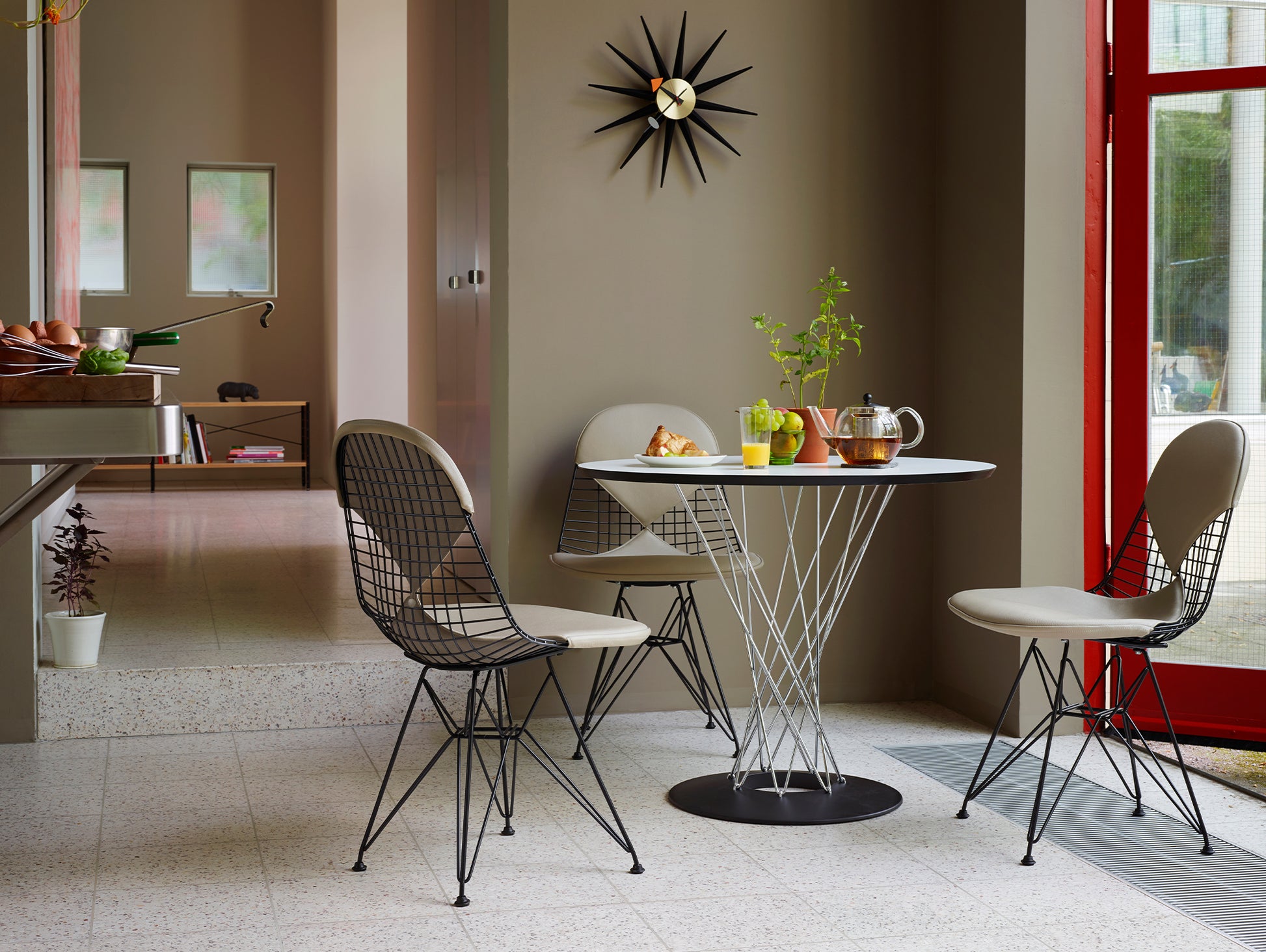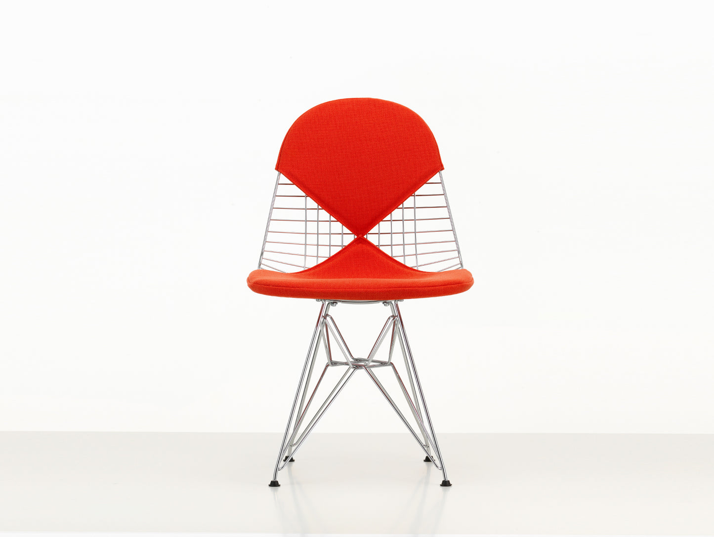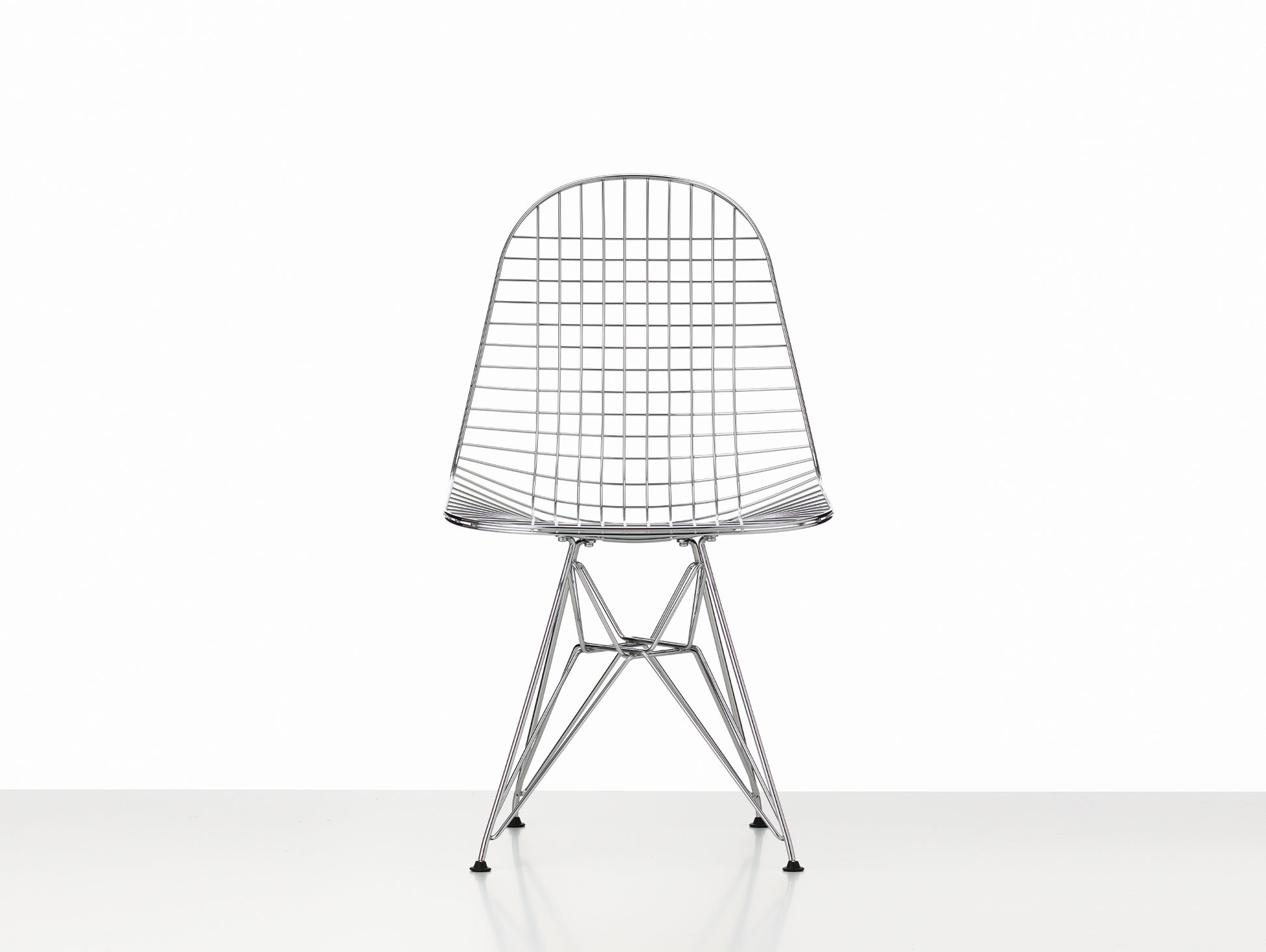 Designed in 1951, the Vitra Eames Wire Chair (DKR: Dining Knot-Wire Chair Rod-base) is a variation on the theme of the organically shaped one-piece seat shell, pairing transparent lightness with technological sophistication.