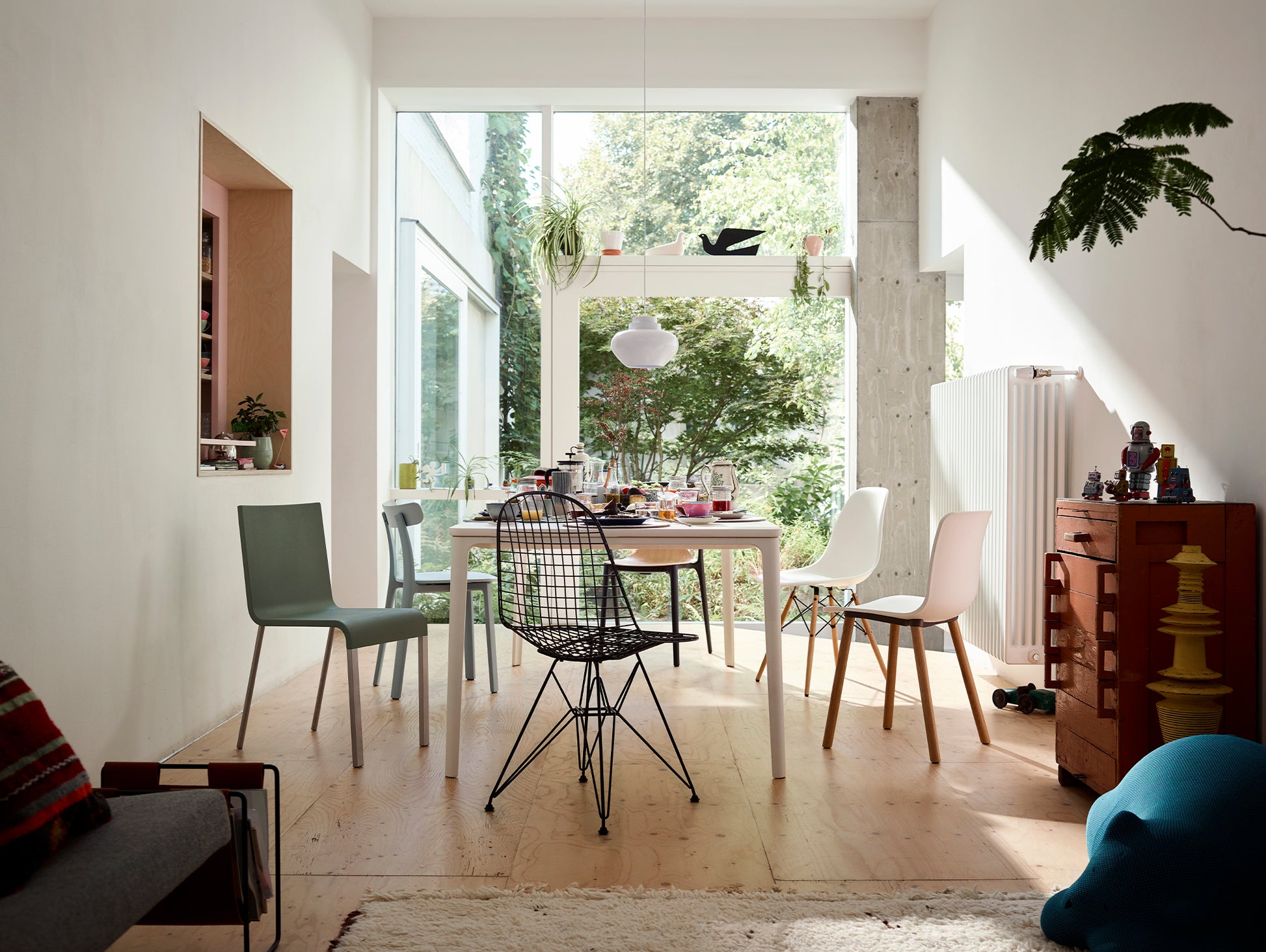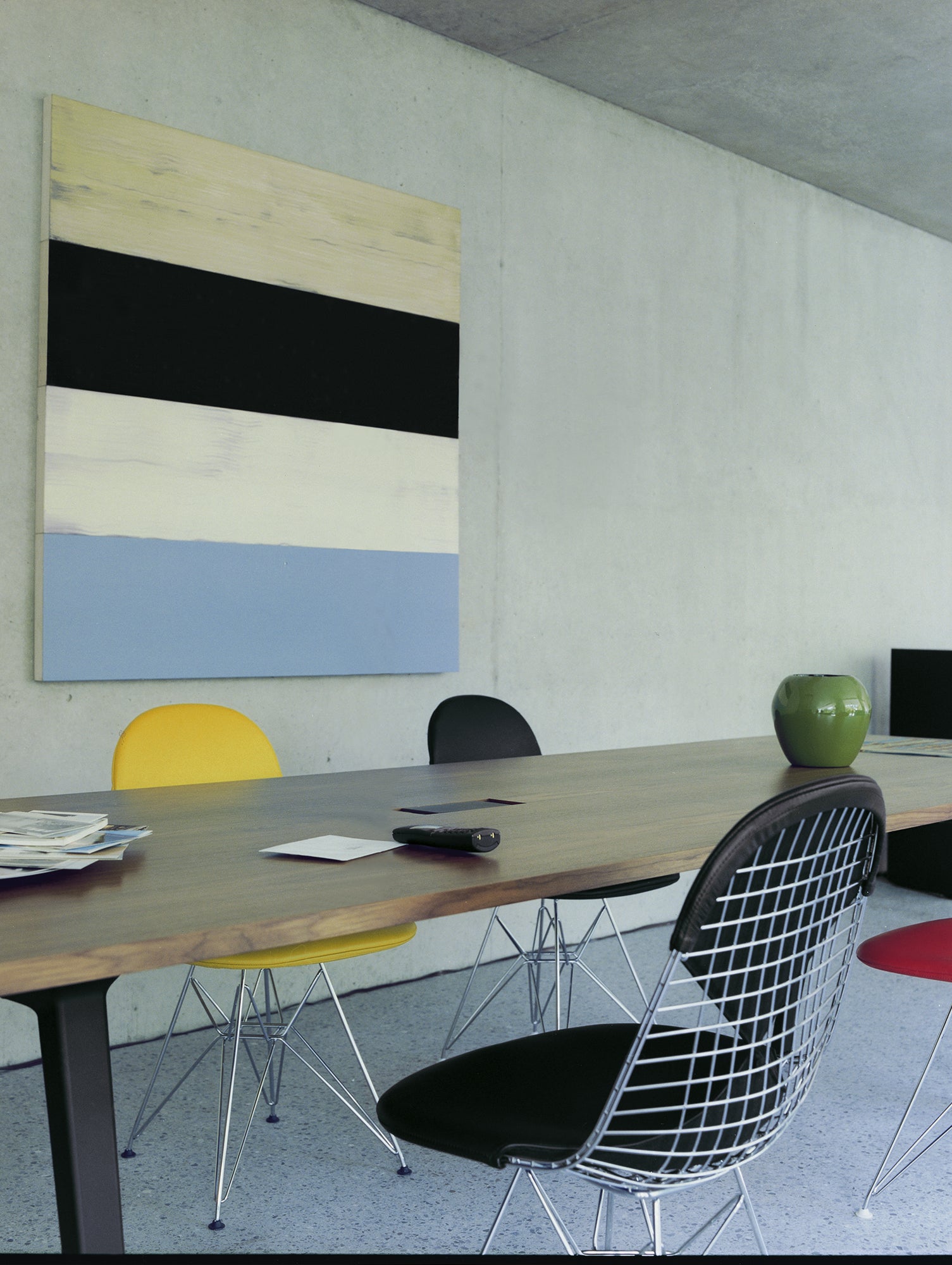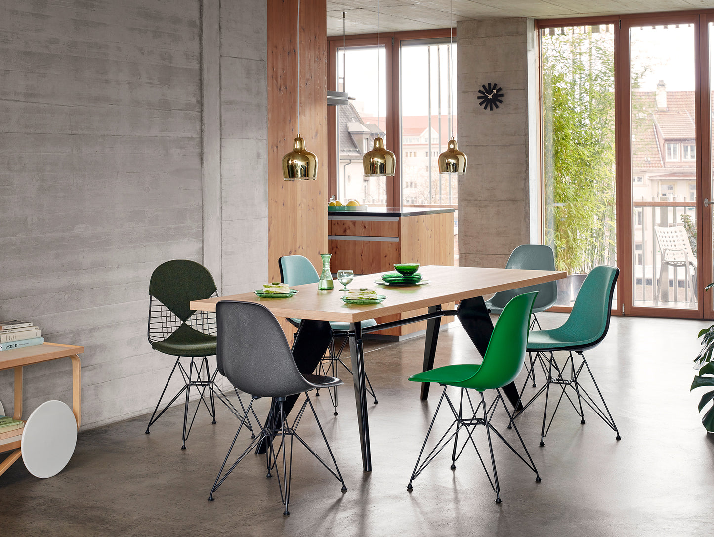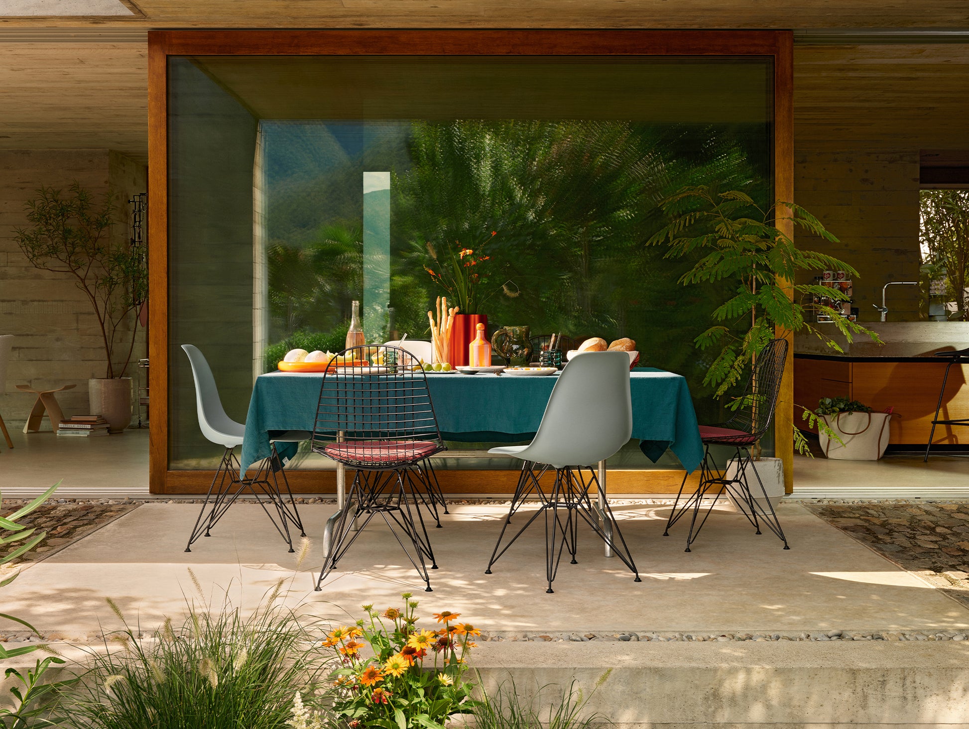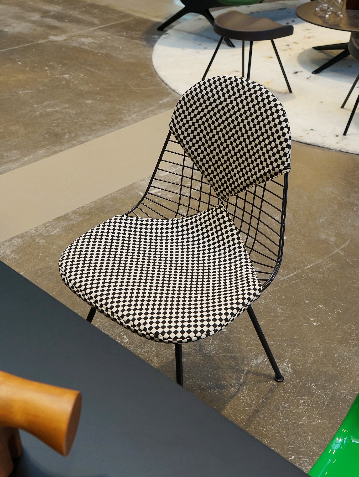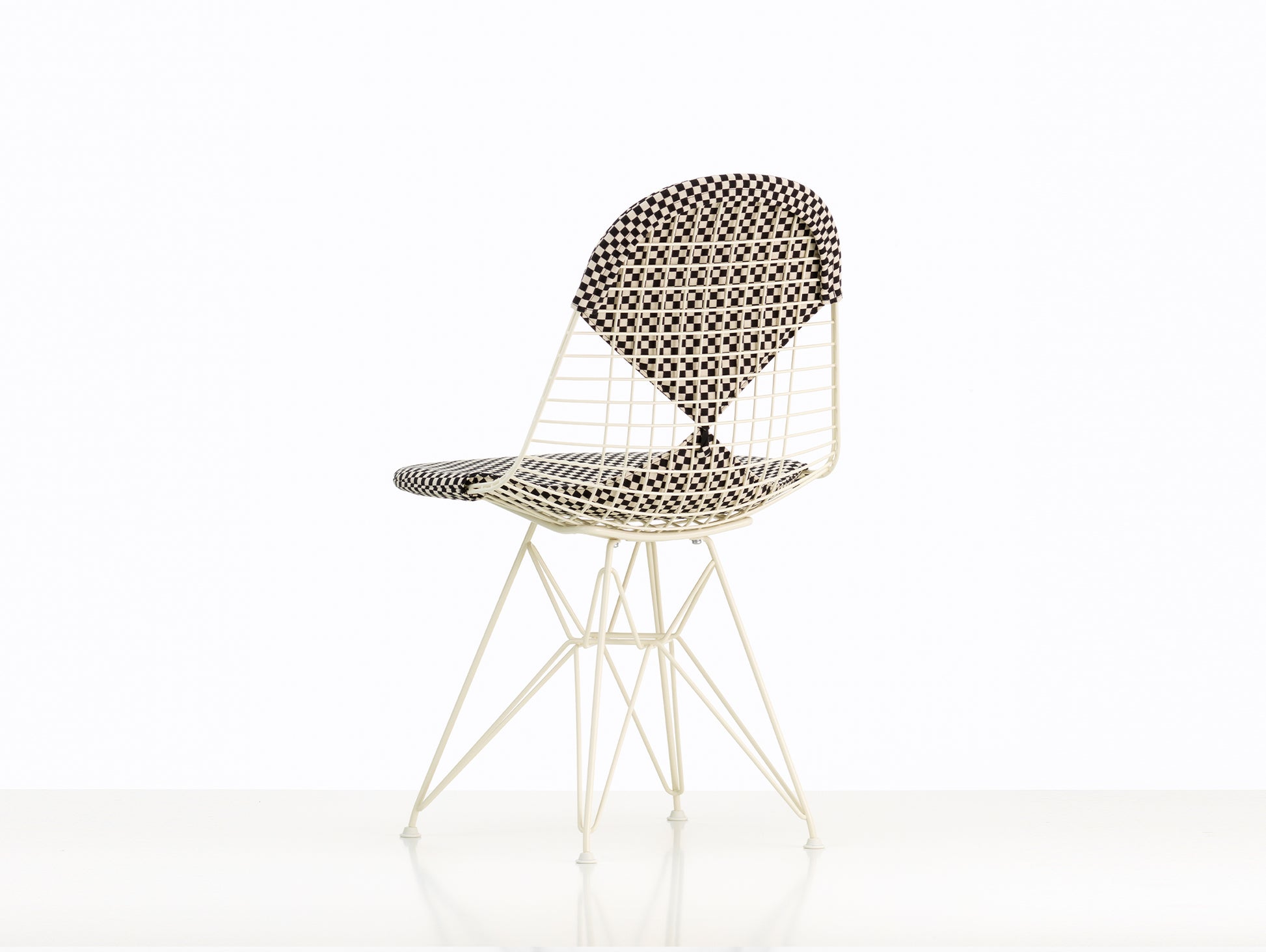 Designed in 1951, the Vitra Eames Wire Chair (DKR: Dining Knot-Wire Chair Rod-base) is a variation on the theme of the organically shaped one-piece seat shell, pairing transparent lightness with technological sophistication.