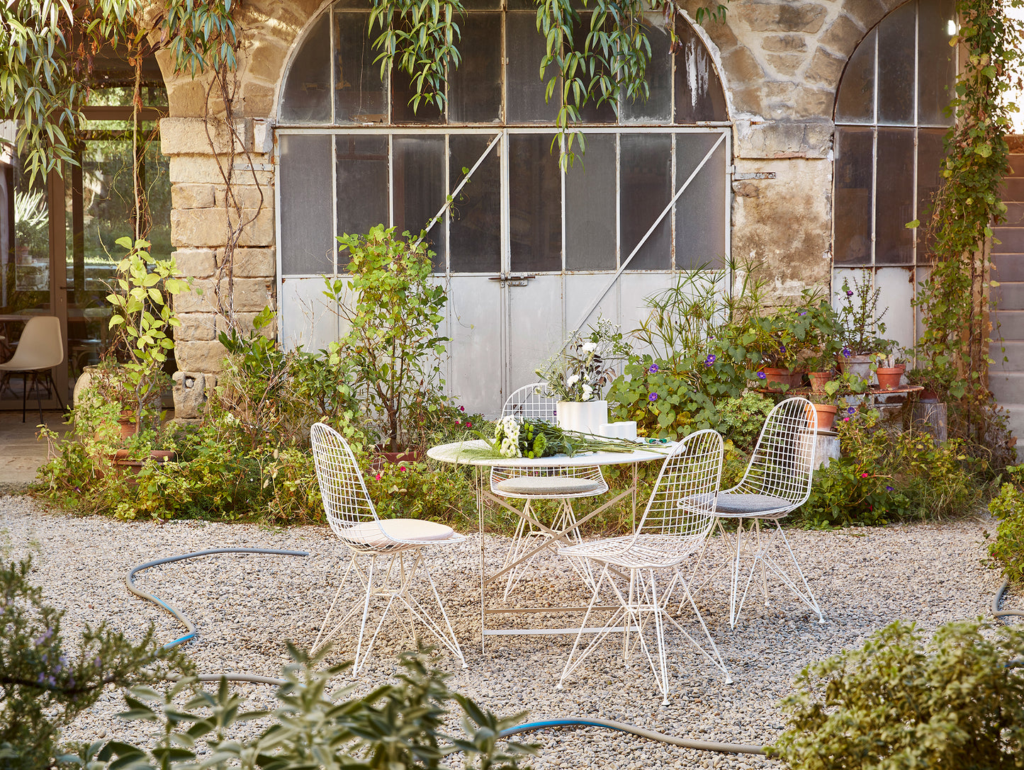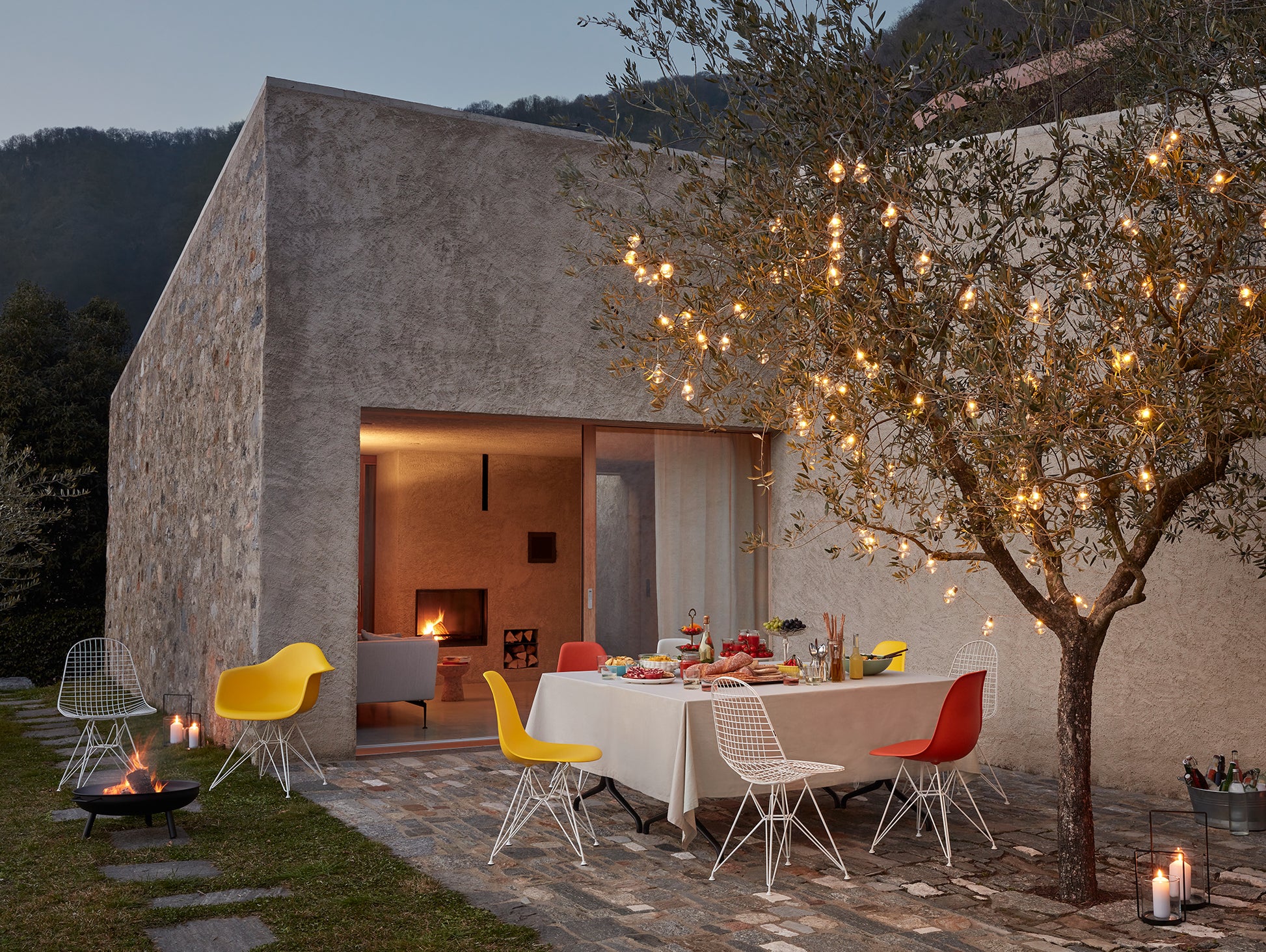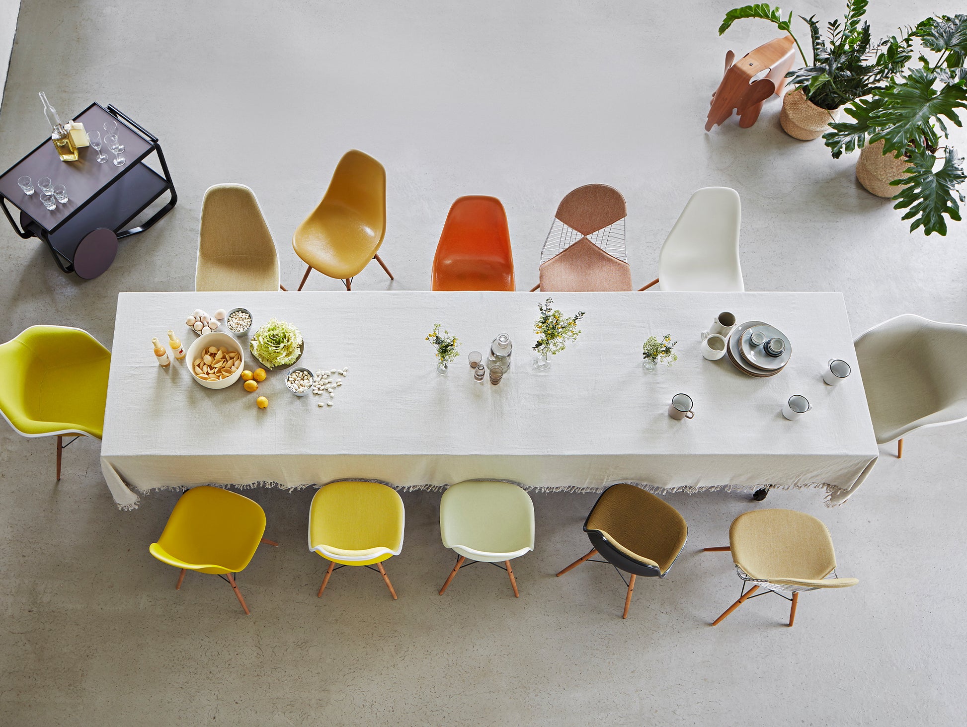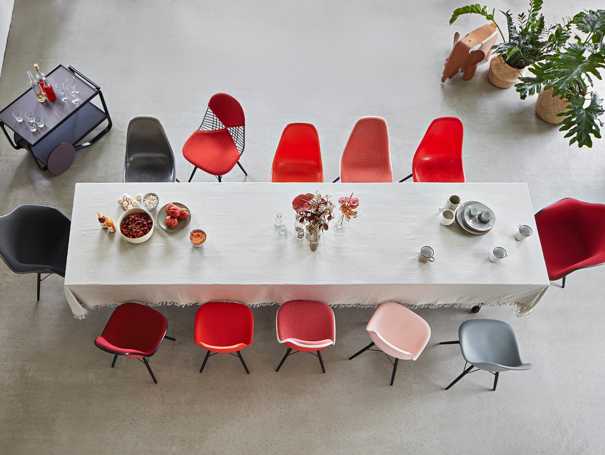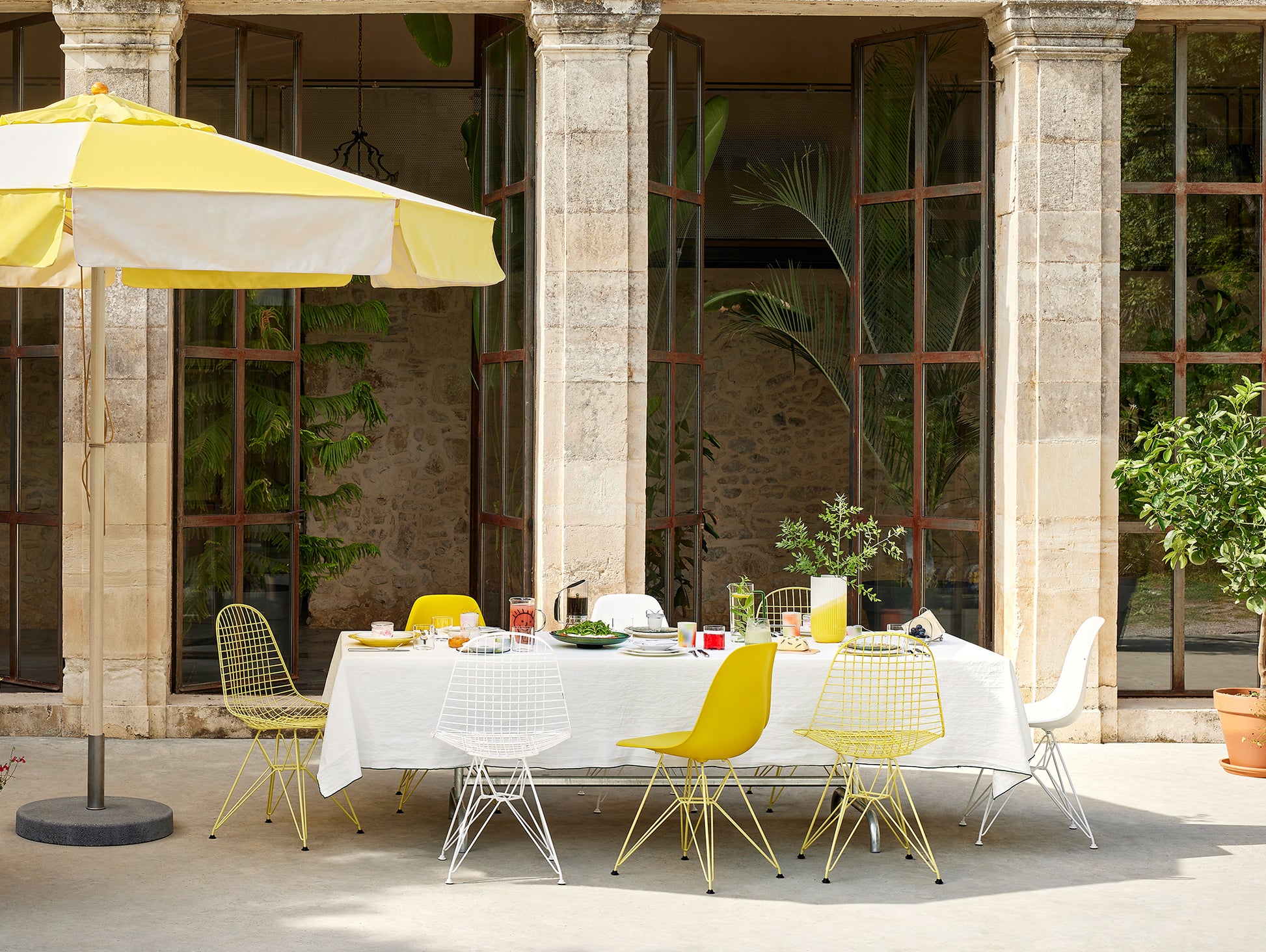 Designed in 1951, the Vitra Eames Wire Chair (DKR: Dining Knot-Wire Chair Rod-base) is a variation on the theme of the organically shaped one-piece seat shell, pairing transparent lightness with technological sophistication.