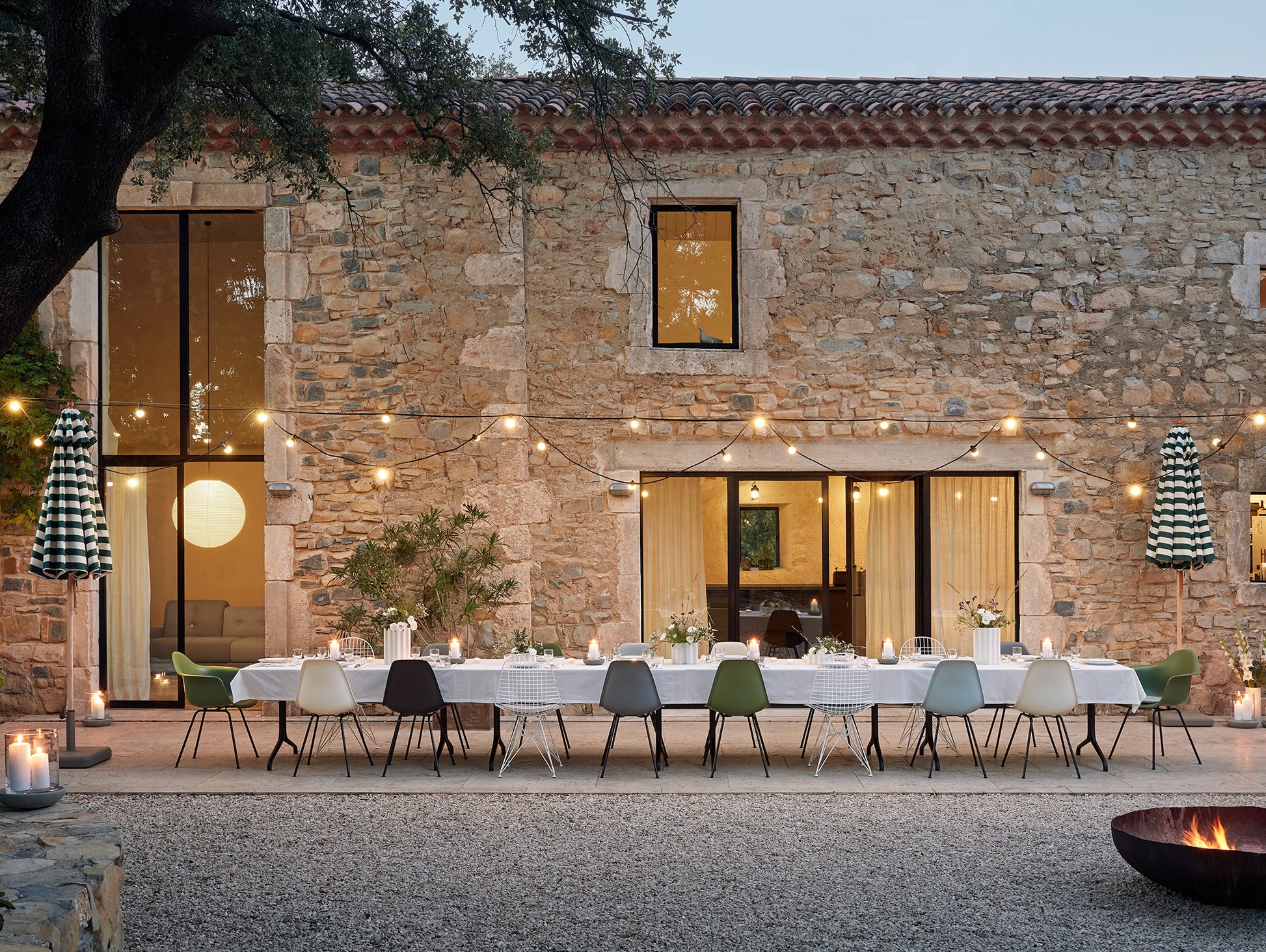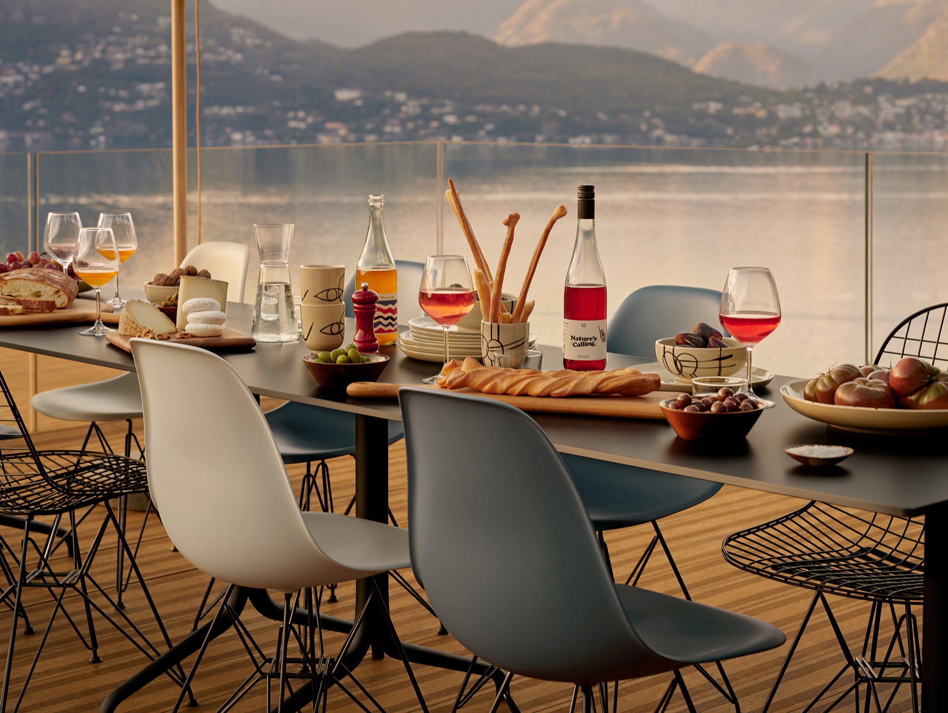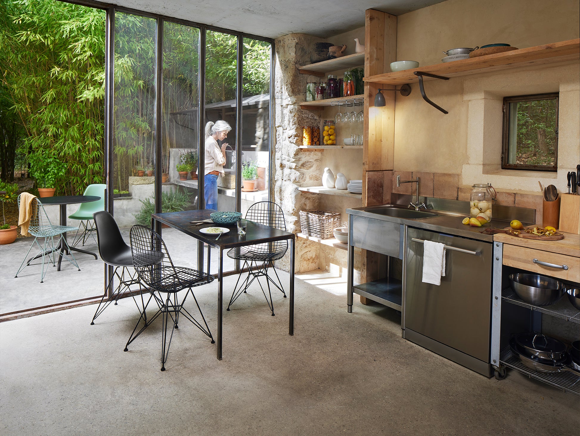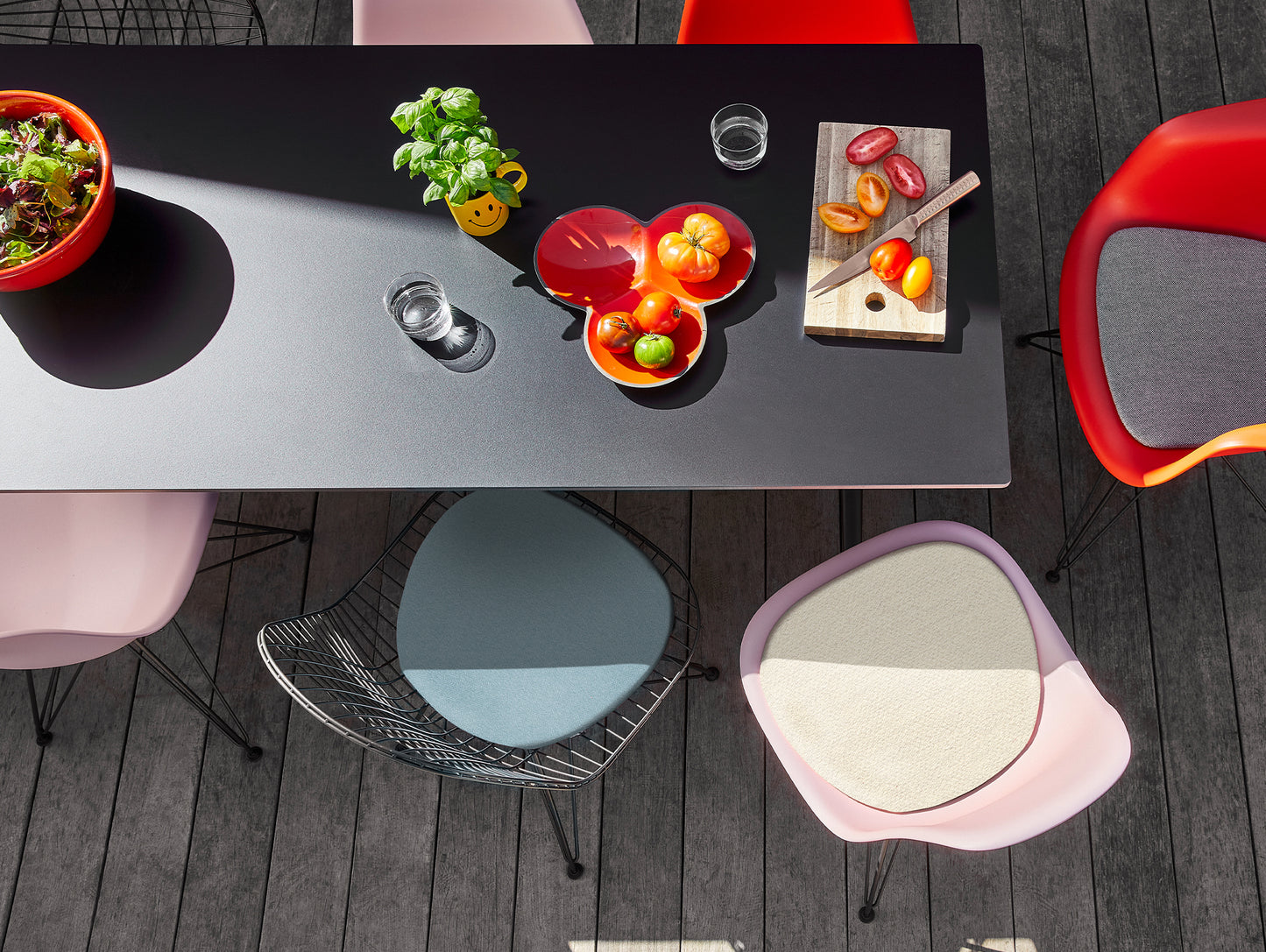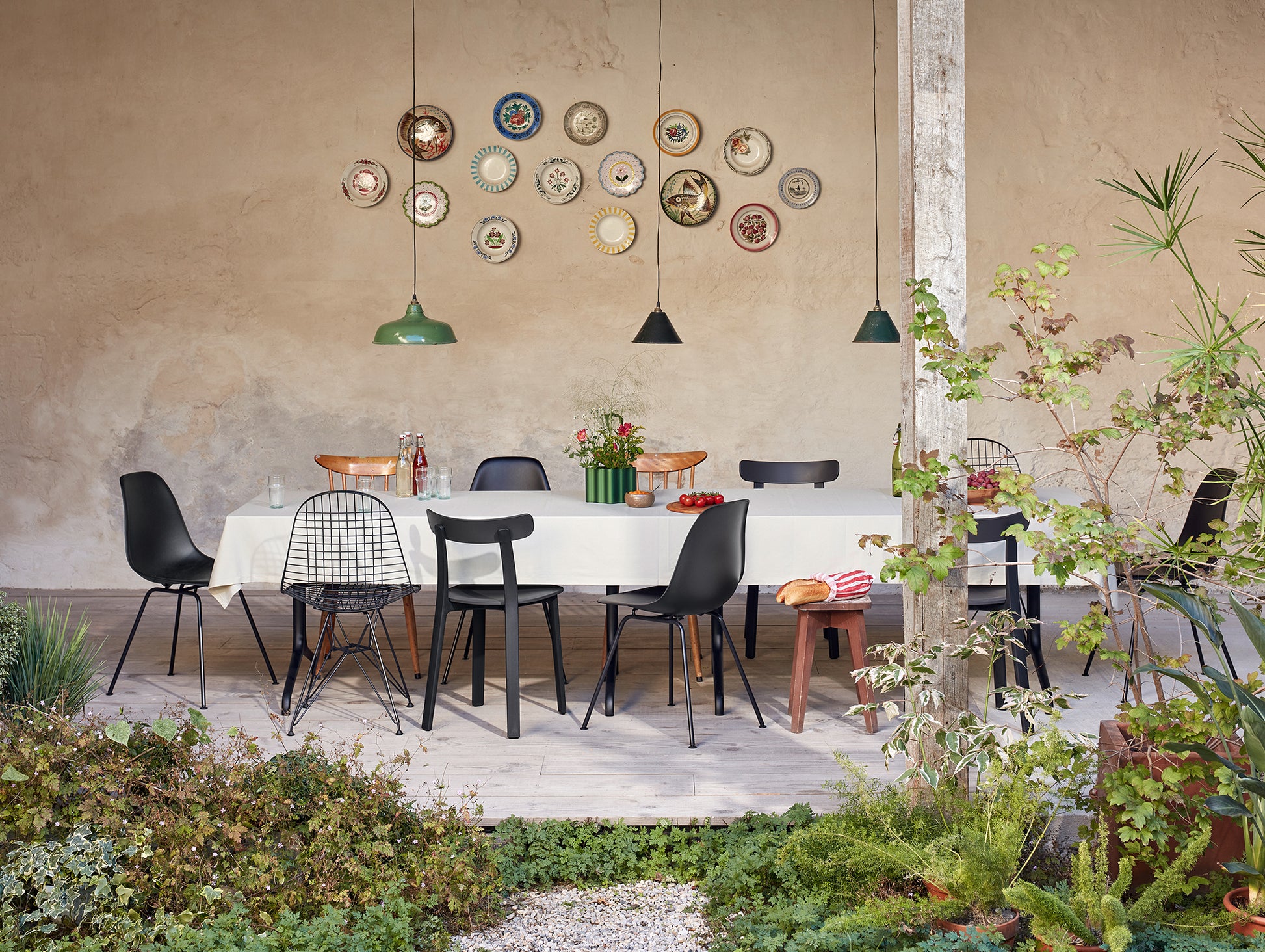 Designed in 1951, the Vitra Eames Wire Chair (DKR: Dining Knot-Wire Chair Rod-base) is a variation on the theme of the organically shaped one-piece seat shell, pairing transparent lightness with technological sophistication.