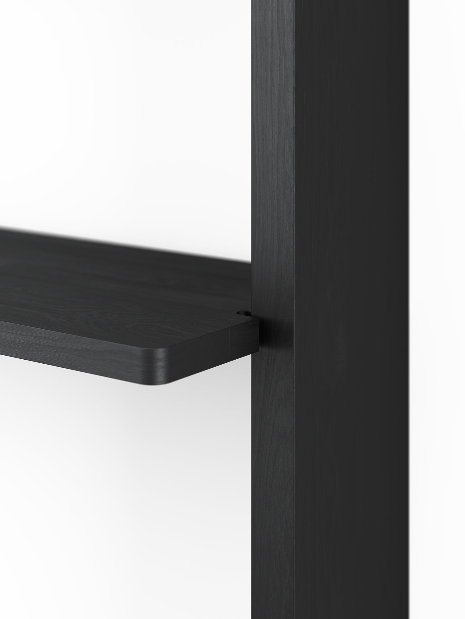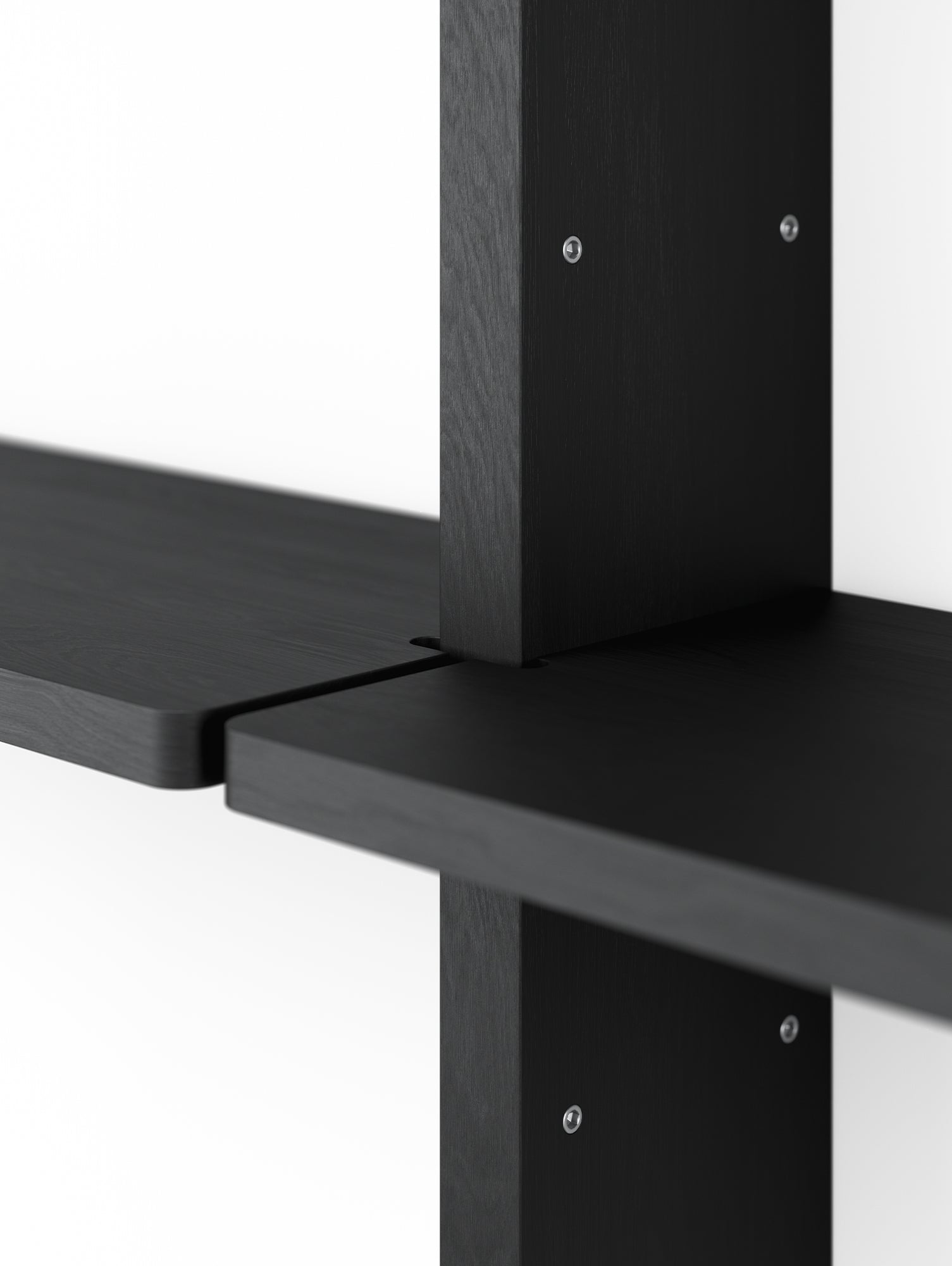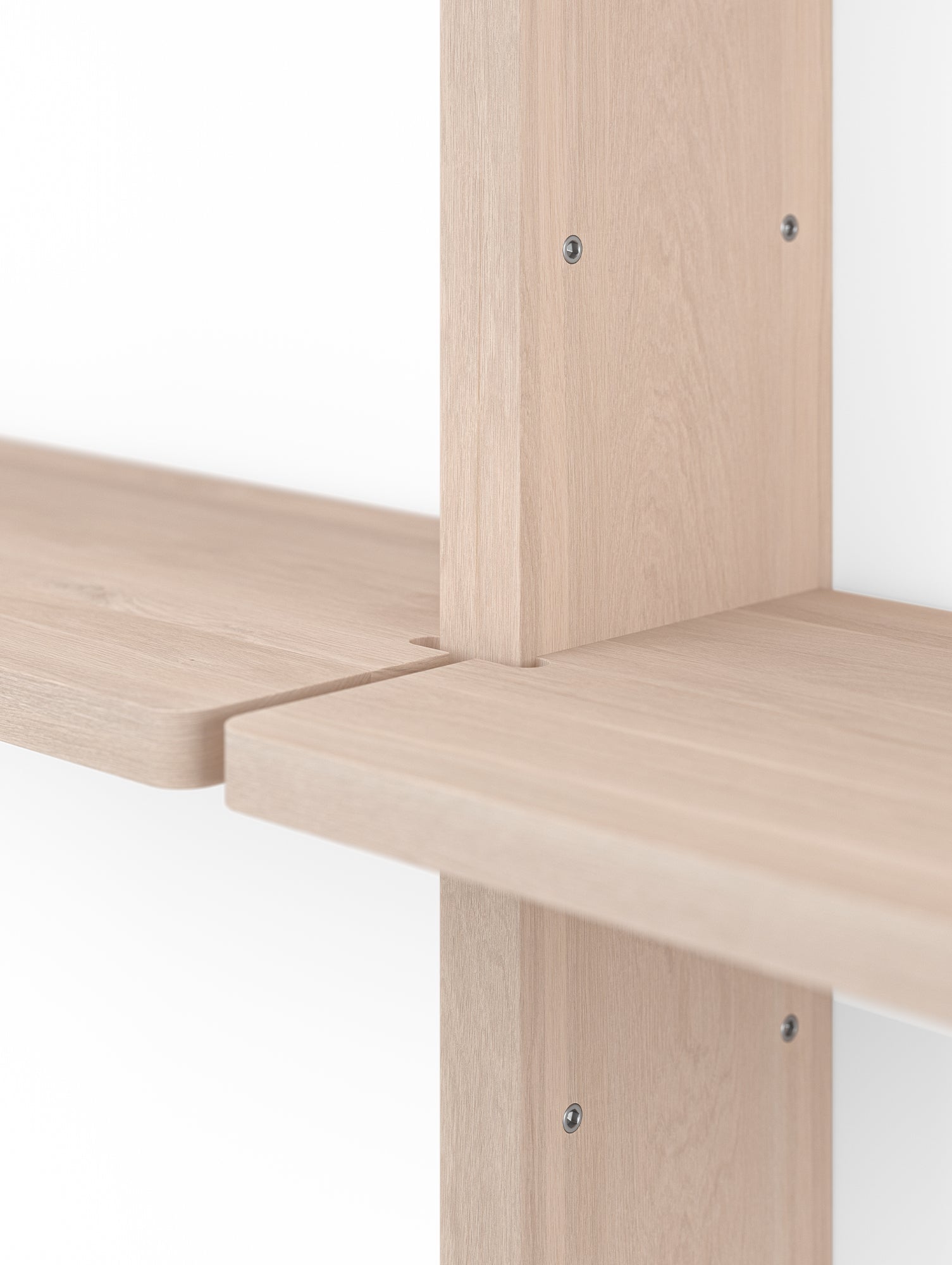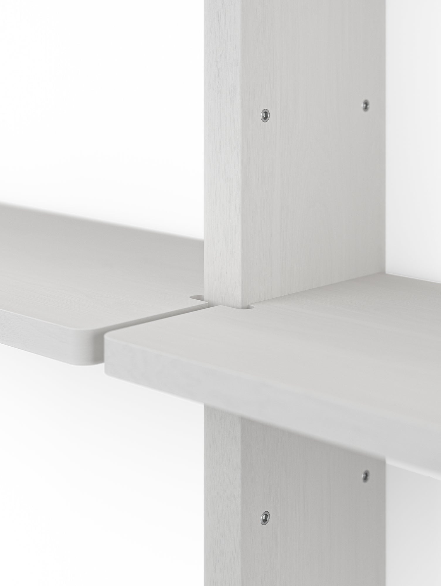Gridlock's shelves wrap-around the vertical elements, creating a harmonious shelving wall with continuous horizontal lines. The system includes clever solutions with fittings specifically designed to simplify assembly and enhance functionality: Once the shelf is slid onto the back fixings it should settle onto the front bolts with a satisfying 'clunk-click' action. This easy and smartly designed assembly enhances both the practicality and durability of the product. Thanks to its minimal and timeless design, the system integrates seamlessly into any space, serving as an architectural element rather than just a piece of furniture.