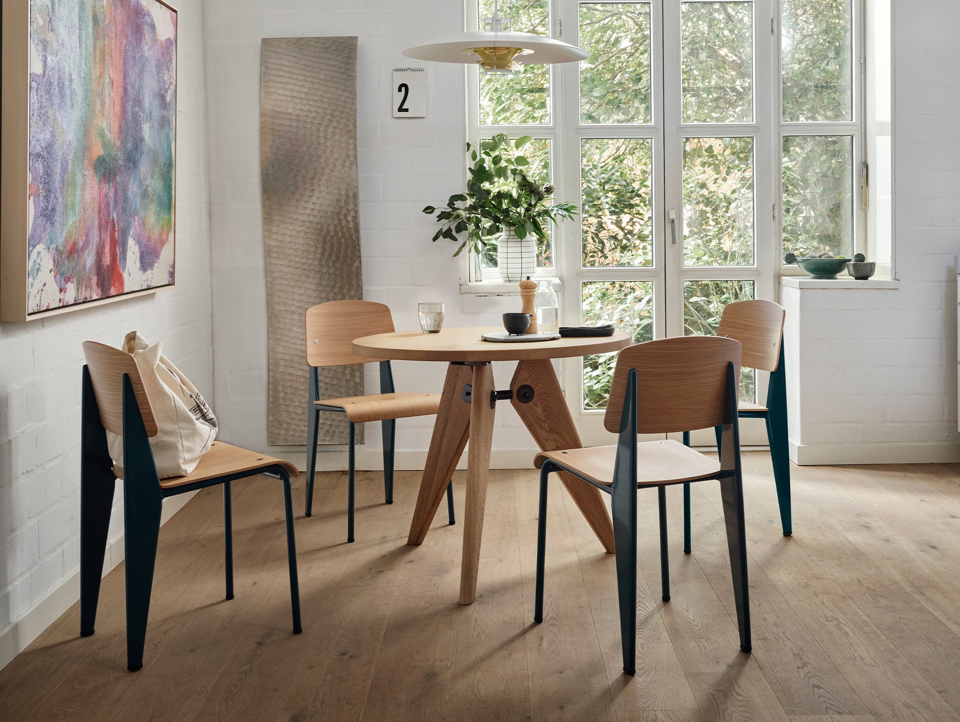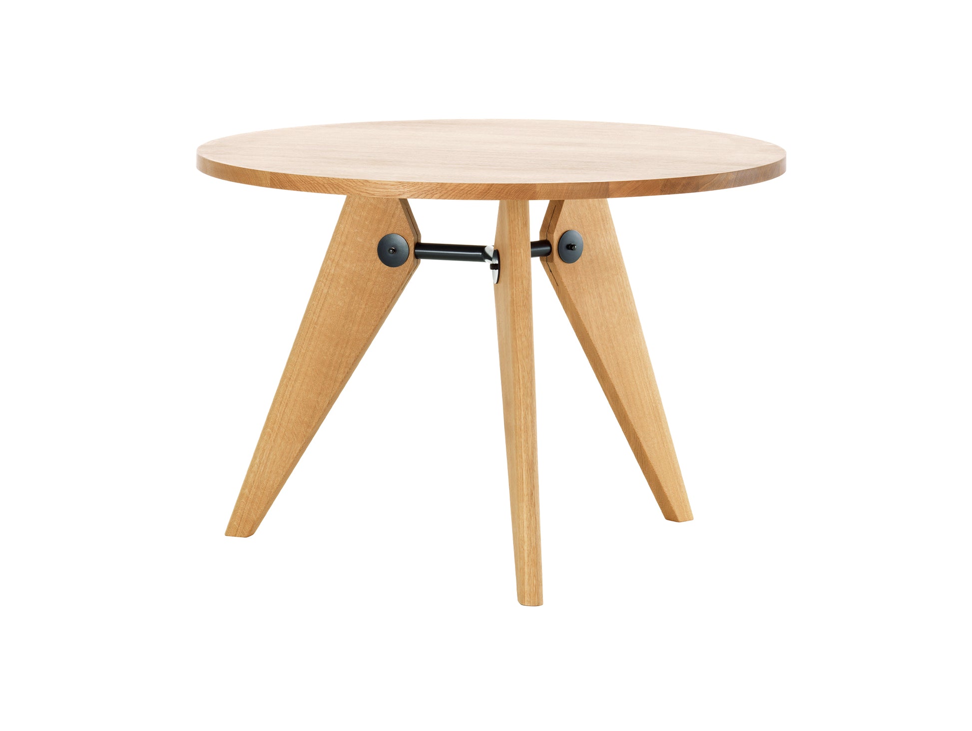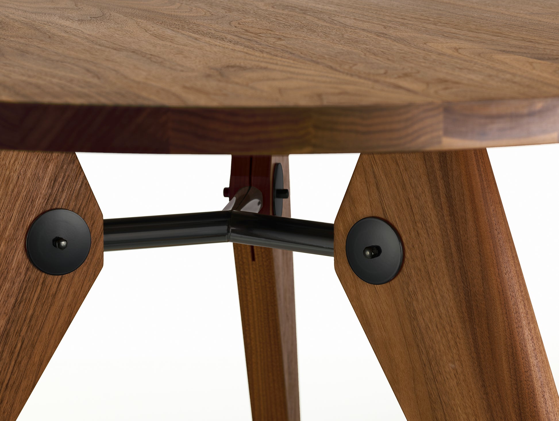 Designed by Jean Prouvé in 1944, the Gueridon Series is one of Prouvé's earliest furniture designs. In the early 1940s, Jean Prouvé began to work more extensively with wood due to the the scarcity of metal during World War II. Constructed with a tabletop in solid oak or American walnut and accompanied by Prouvé's signature curved legs in the same wood with bent sheet metal construction, the Gueridon Table is a sturdy and durable furniture piece. Despite the mainly wood construction, the central element of the steel structural ties makes the design unmistakably Prouvé. The result is a softer table perfectly suited for domestic environments.
