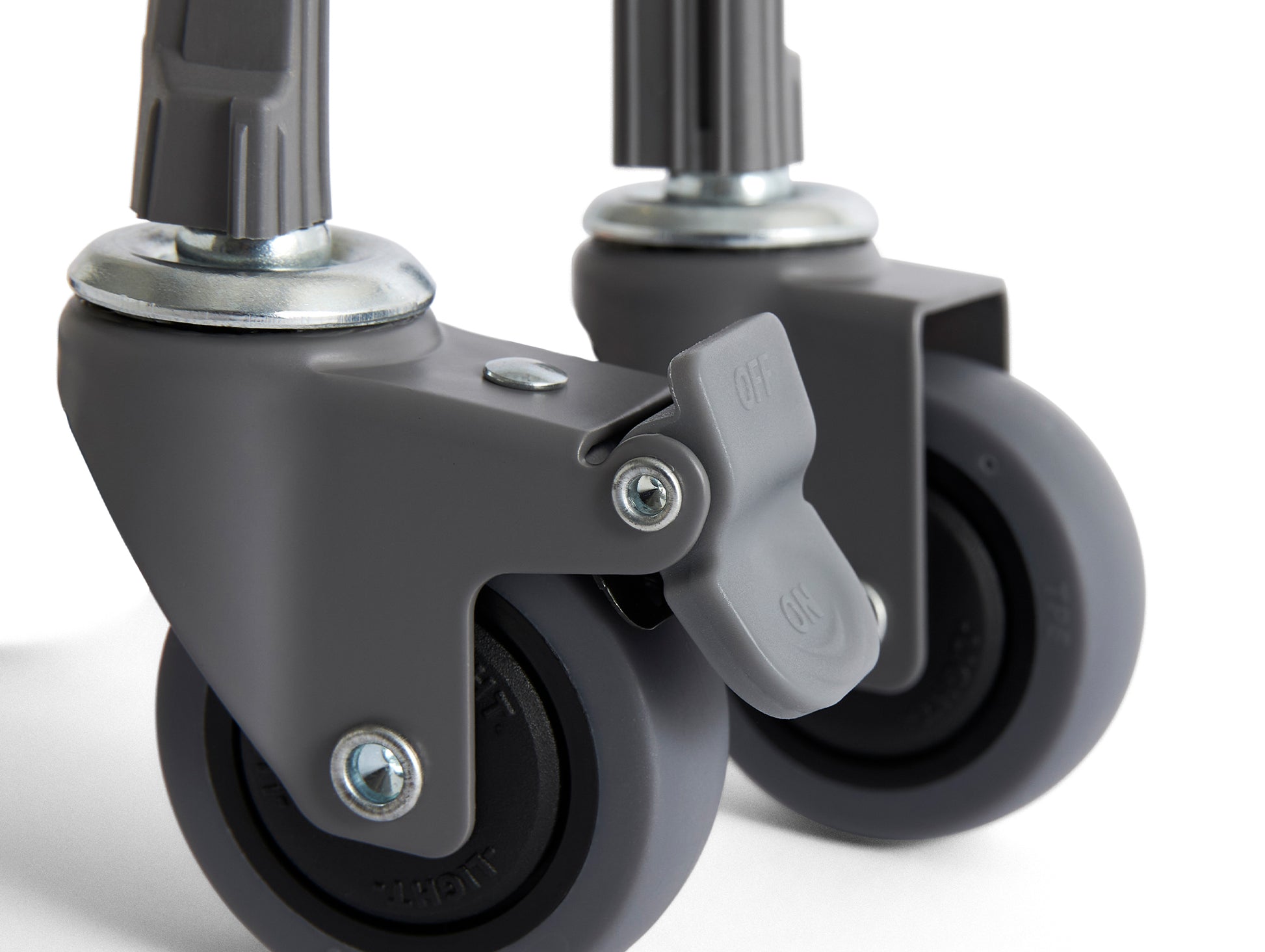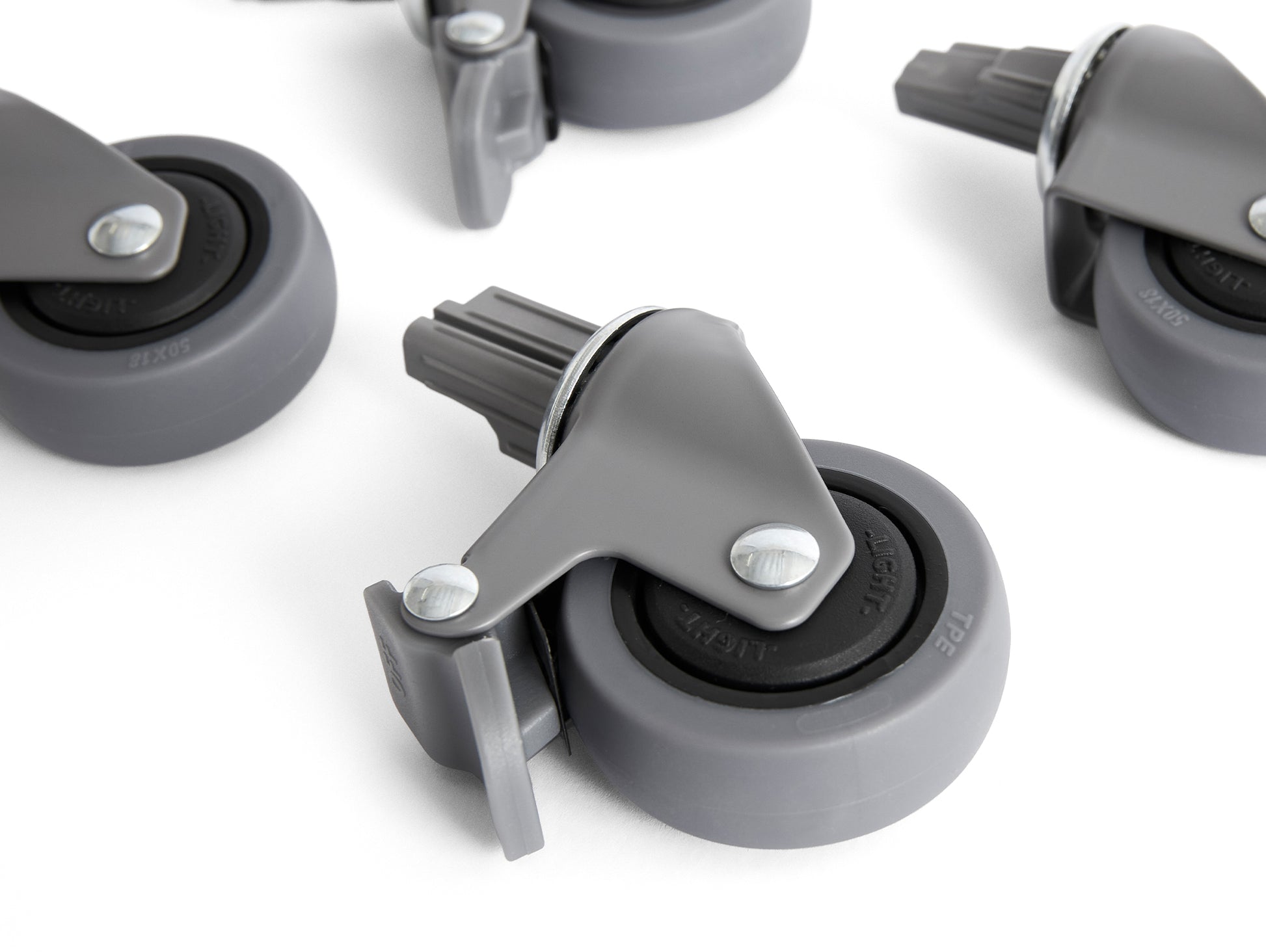 Designed for using with HAY Colour Crates, these Crate Wheels elevate the container, making it easy to move around as well as adding new functionality and storage possibilities. The Crates could, for example, in conjunction with a Colour Crate Lid create a beside table or under desk pedestal. Featuring a simple push-in design and two stopper wheels, the Colour Crate Wheels are simple to mount and effective to use.