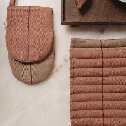 The Ito Family offers a contemporary take on classic kitchen textiles. This oven mitt, made from organic cotton and filled with recycled polyester, features a delicate stripe pattern enhanced by a two-tone twill weave. Designed for versatility, it comfortably fits both left- and right-handed users, with a padded inner lining for reliable heat protection. Stylish and functional, it brings a charming touch of colour to your kitchen while providing everyday practicality.