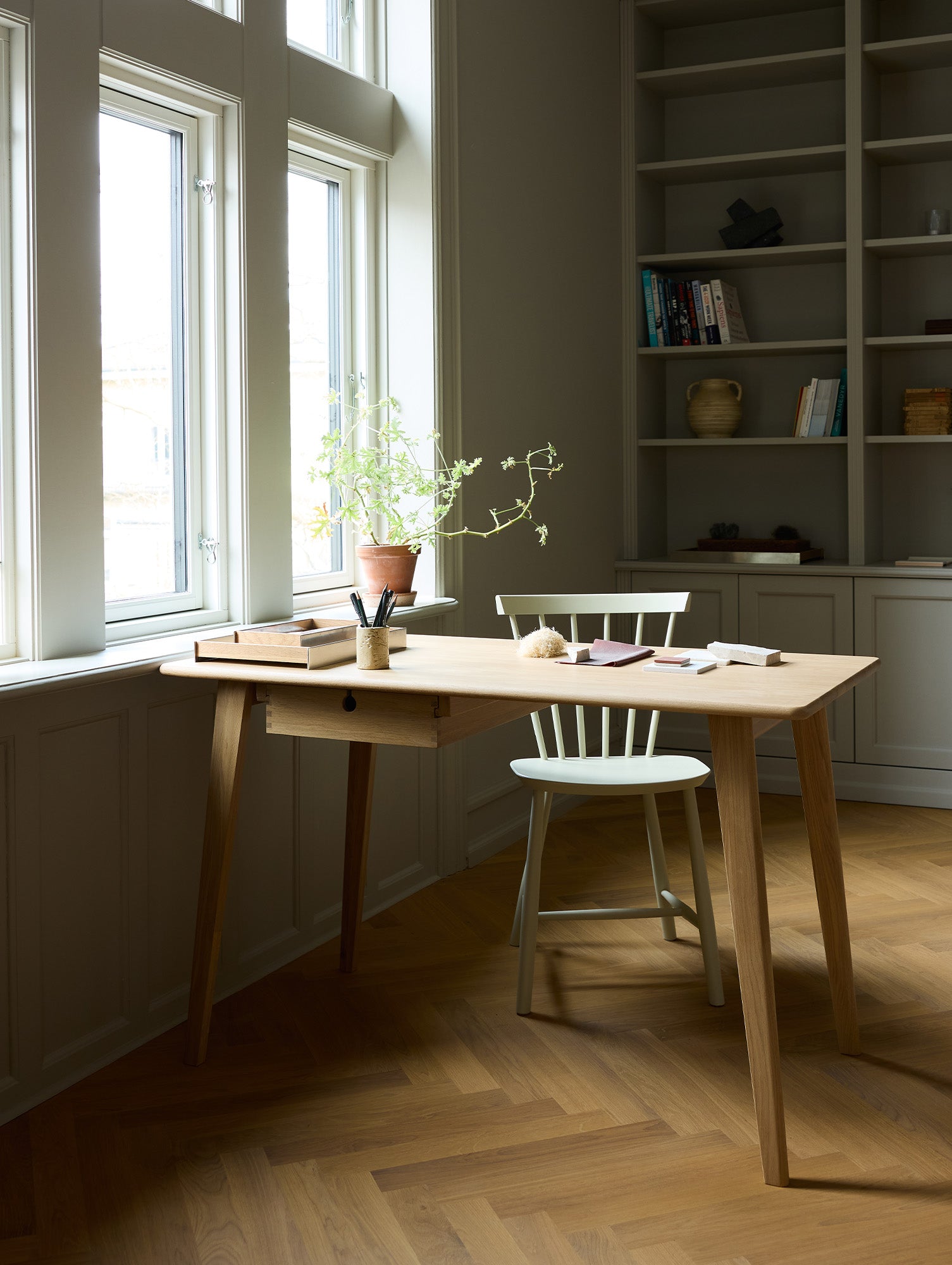Crafted with a solid beech or oak wood base and a veneer seat, the chair's classic spindle backrest provides both comfort and support, while the gently curved seat offers an inviting experience for everyday use. The J46 Chair reflects Danish design heritage, combining elegance and practicality for various interiors. Available in a range of sophisticated colours, the J46 Chair brings warmth and character to any space.