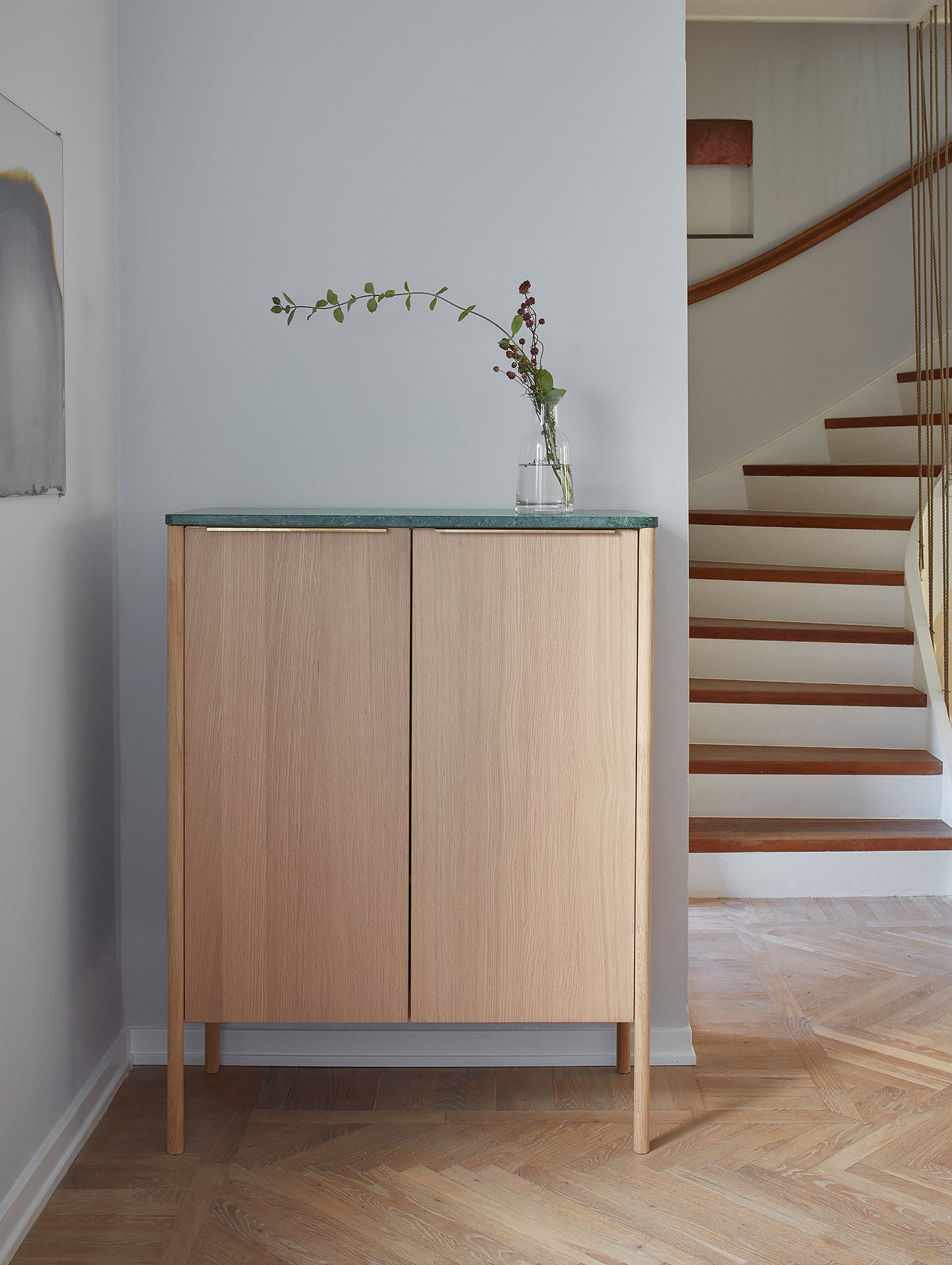 The top of the cabinet is available in three finishes - black marble, green marble or oiled oak. The high quality materials allow the top of the Jut to be used as a plinth, an elevated place for displaying sculptural pieces or a vase.