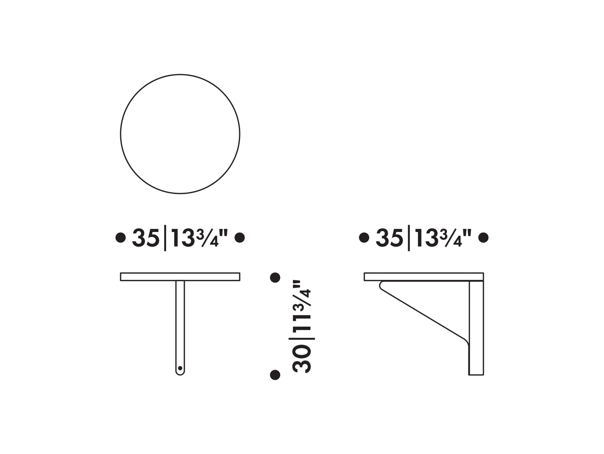 The Kaari Round Shelf can serve as a bedside table, a place for your everyday objects in an entrance area, or a platform to highlight a precious object. The shelf comprises a round panel, a vertical wall bracket, and the distinctive steel band shared by all the Kaari collection. The panel has a linoleum finish, while the wall bracket is made of oak. With a versatile and utilitarian design, the round shelf is ideal for many spaces.