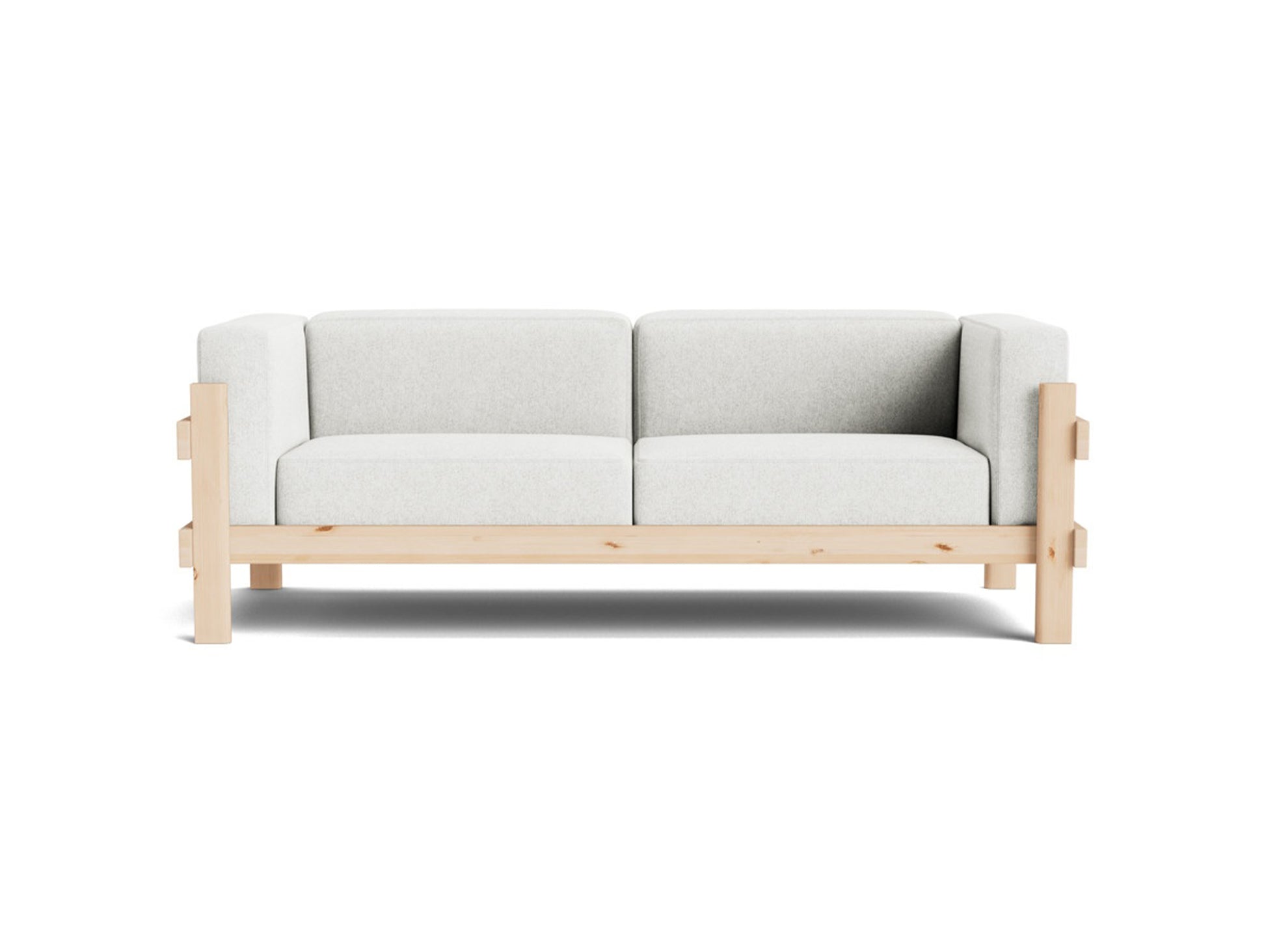 Comprised of a UV-lacquered solid pine or dark brown stained pine frame, the Kube Sofa features generously filled cushions with a blend of foam and feathers, ensuring a comfortable and inviting experience. It can be upholstered in a range of high-quality textiles or leather. Over time, the pine will develop a natural patina, adding to its unique and organic appeal. The sofa’s floating design makes it easy to clean underneath and brings a sense of visual lightness to the space.