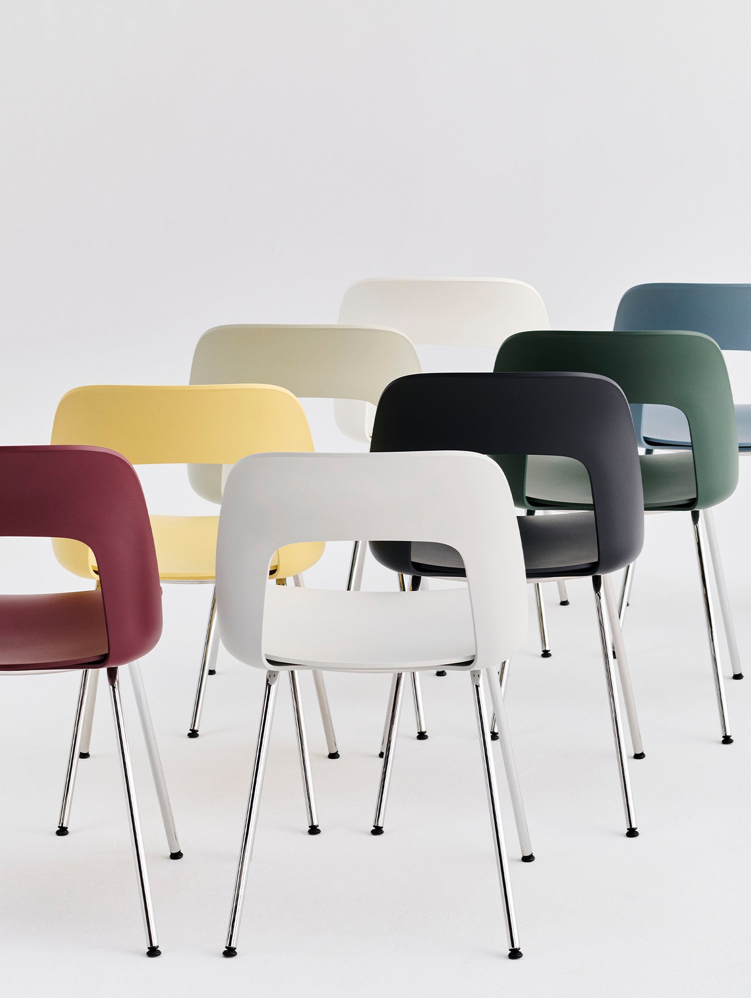 Made from a minimum of 96% post-consumer recycled plastic, the shell is available in a variety of colours and can be paired with veneered oak, black oak or walnut seat options. Crafted in black lacquered or chromed steel, the base provides strength and balance, highlighting the shell’s elegant expression and offering reliable performance over time. With its clean, minimal design, the Layout Chair is suitable for use from dining to office settings, in both home and public spaces.
