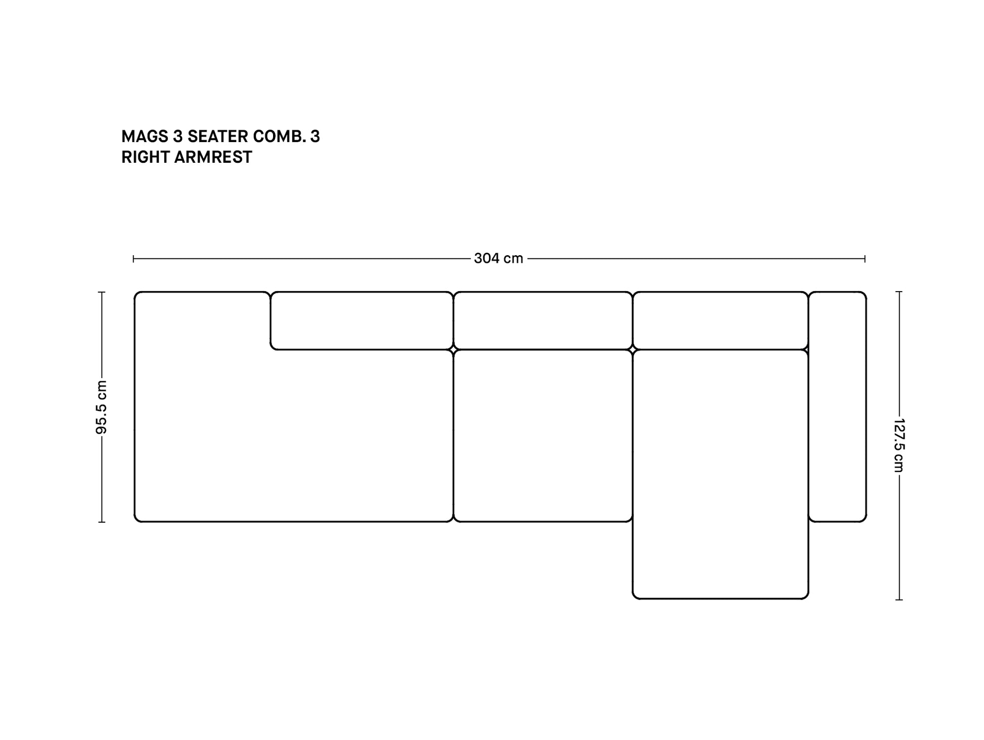 Combination 3 (Available with right side armrest or left side armrest) - Width: 304 cm, Depth: 127.5/95.5 cm, Height: 67 cm, Seat Height: 40 cm, Armrest Width: 24 cm