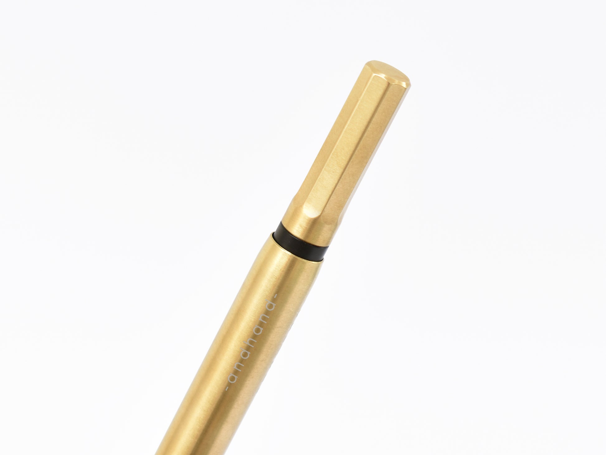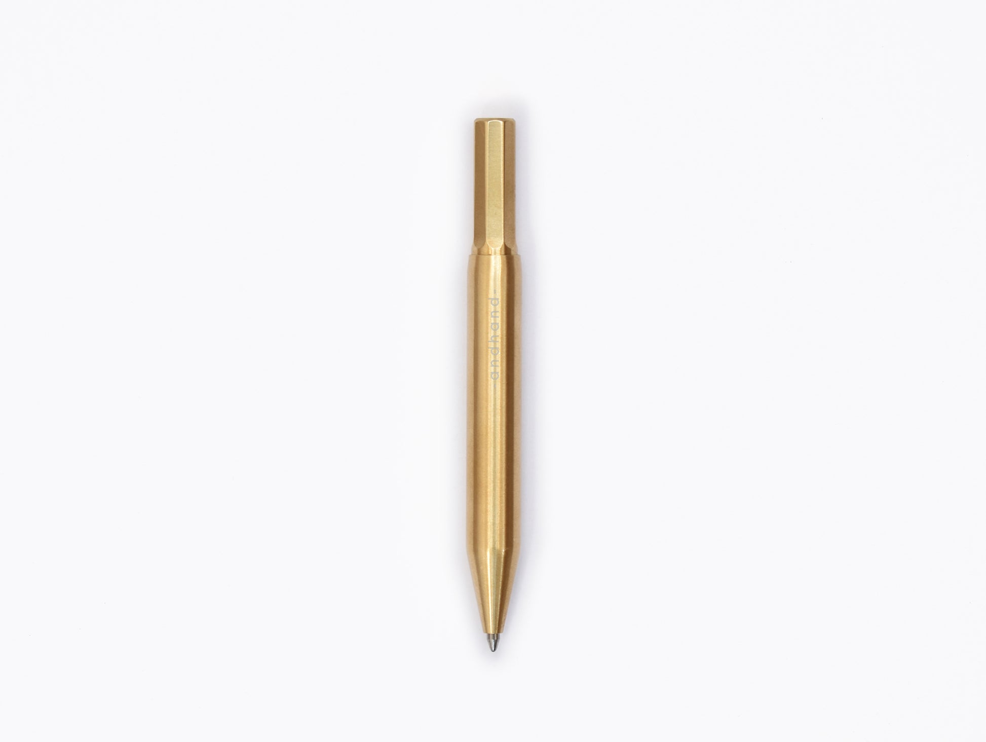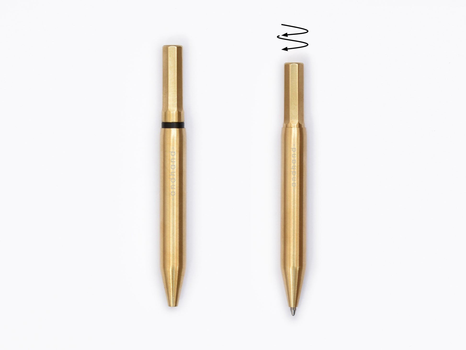 100% machined metal ballpoint pen in anodised aluminium and untreated brushed brass.