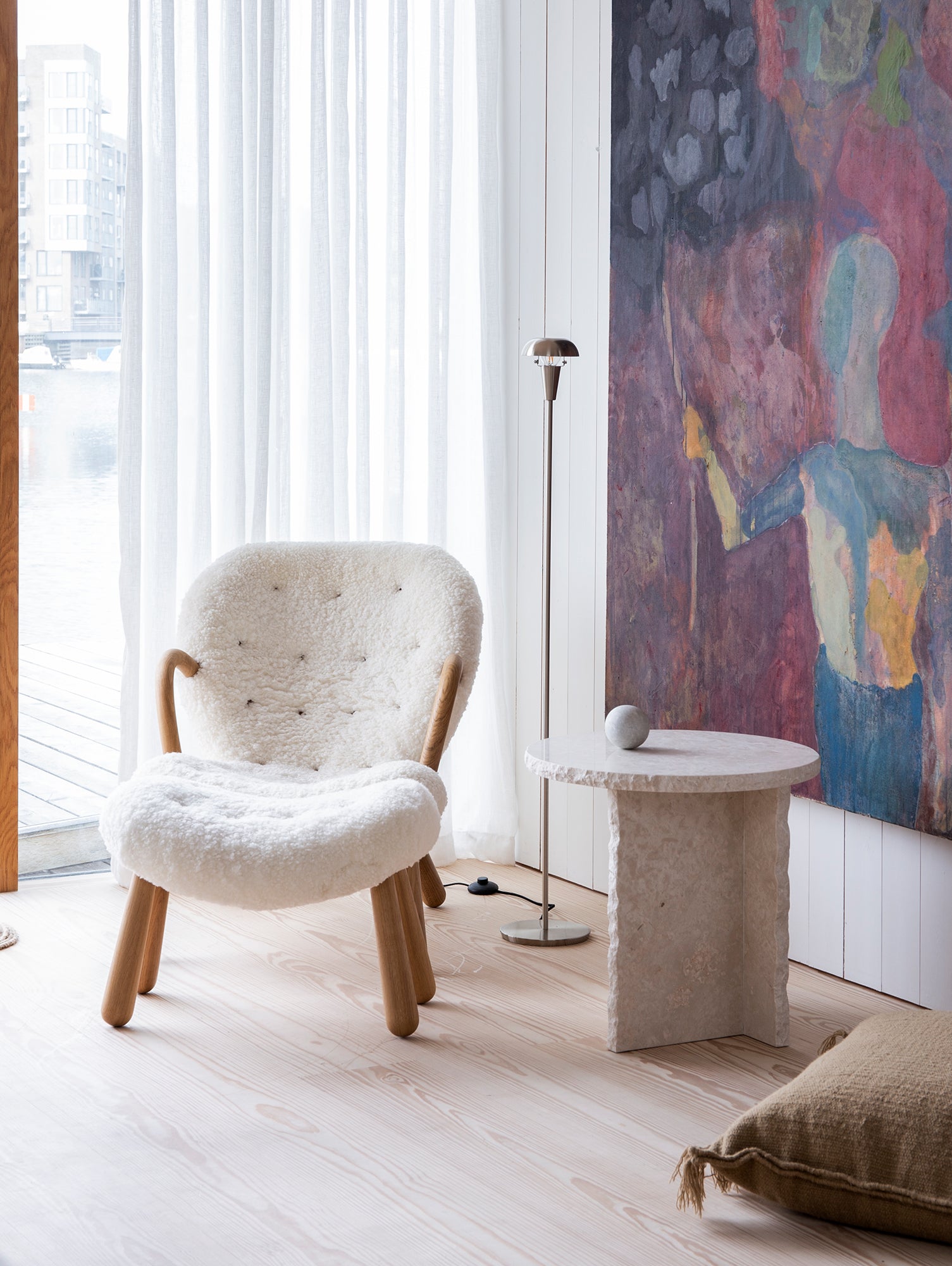 Ferm Living's Mineral Sculptural Table explores the natural beauty of marble. Made in 100% Bianco Curia marble, it is a real statement piece, and with edges that are broken by hand with a chisel, each table is unique. Characterised by its distinctive T-shape, rough edges and contrasting polished surfaces, it has a raw, brutalist expression that will spark conversation. With the natural and high quality Bianco Curia marble, it provides rawness and tangibility which highlight the architectural character of the table.