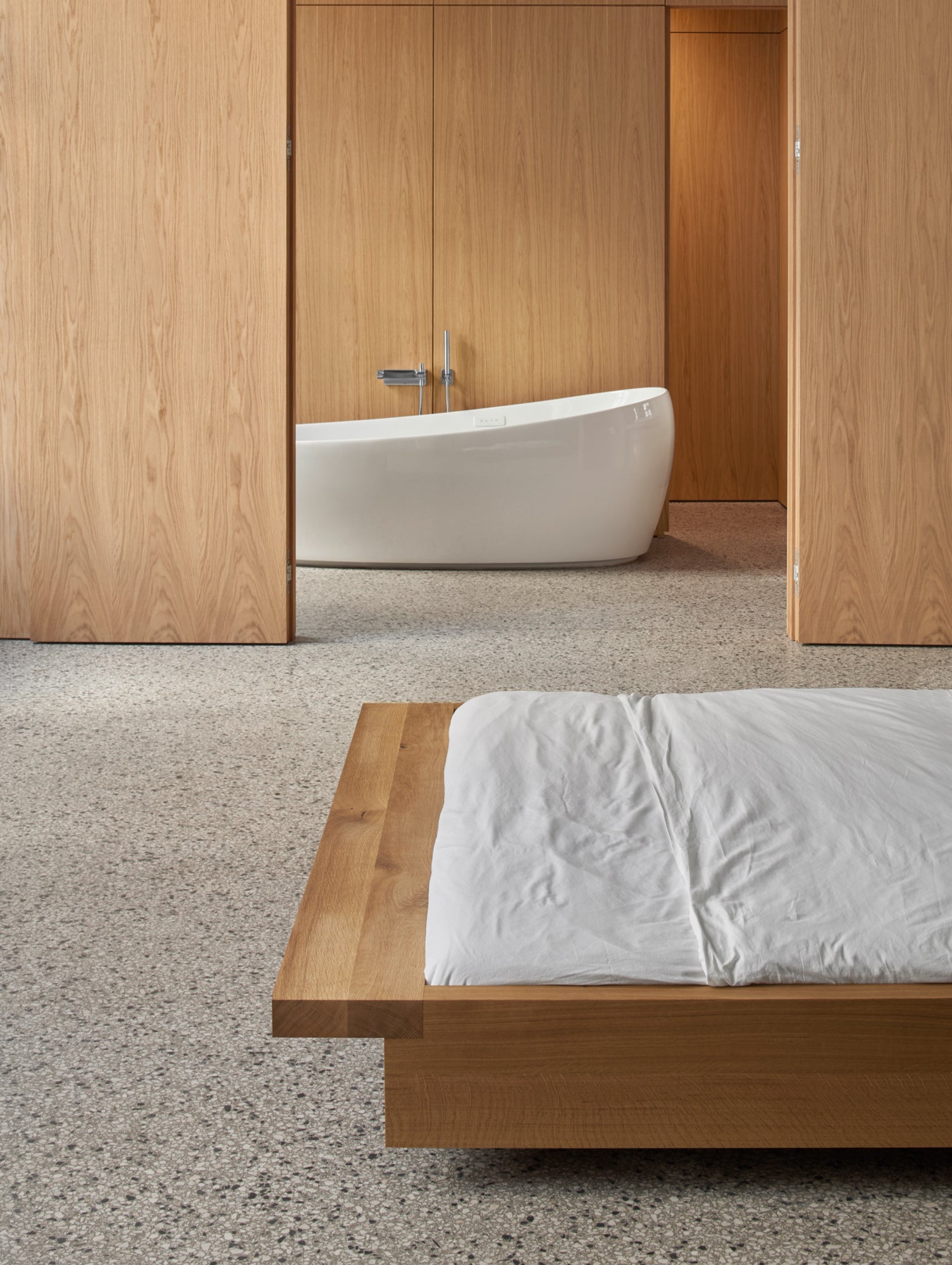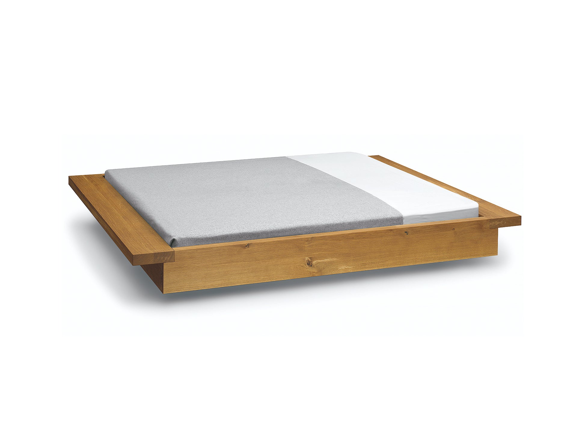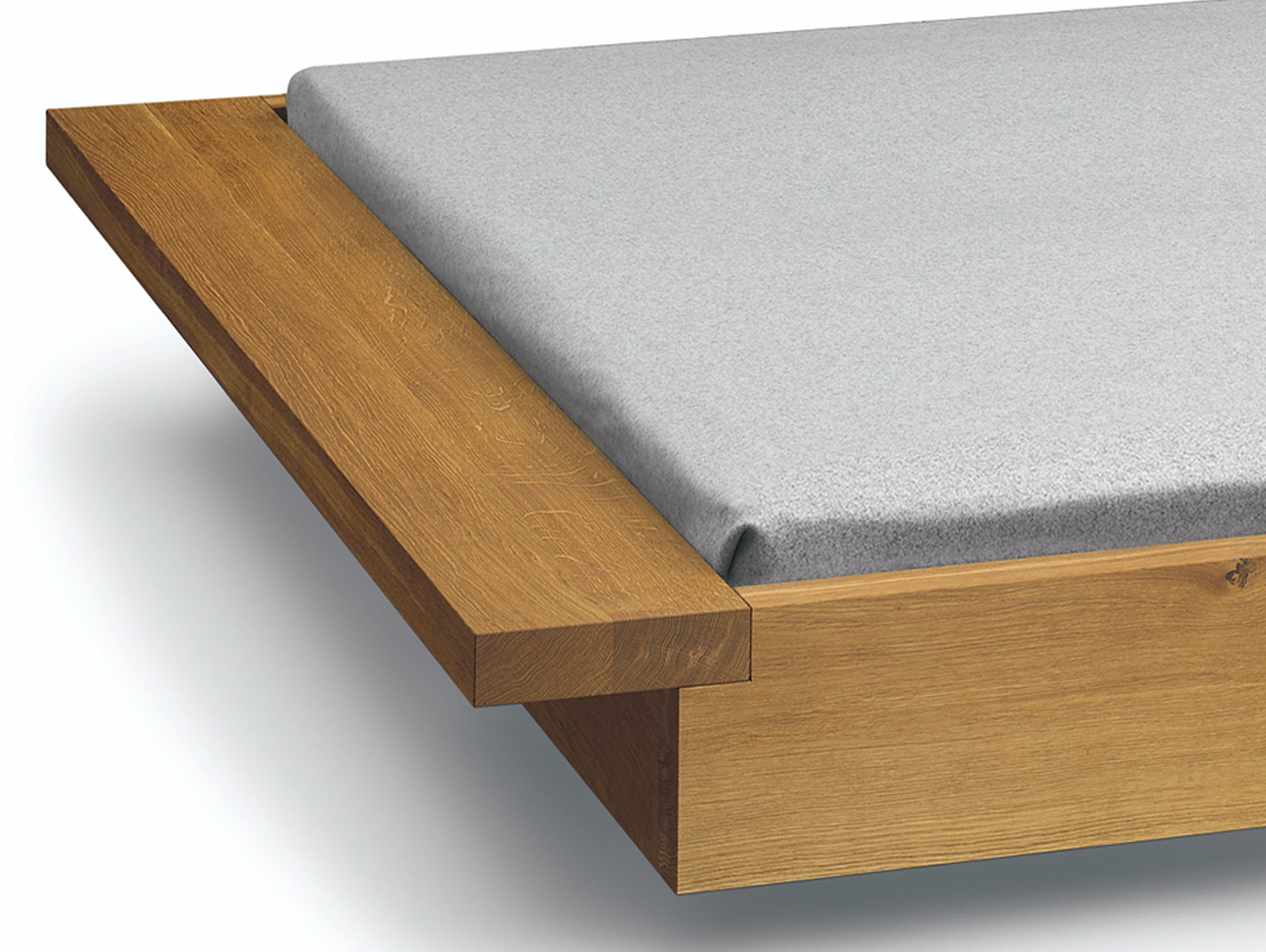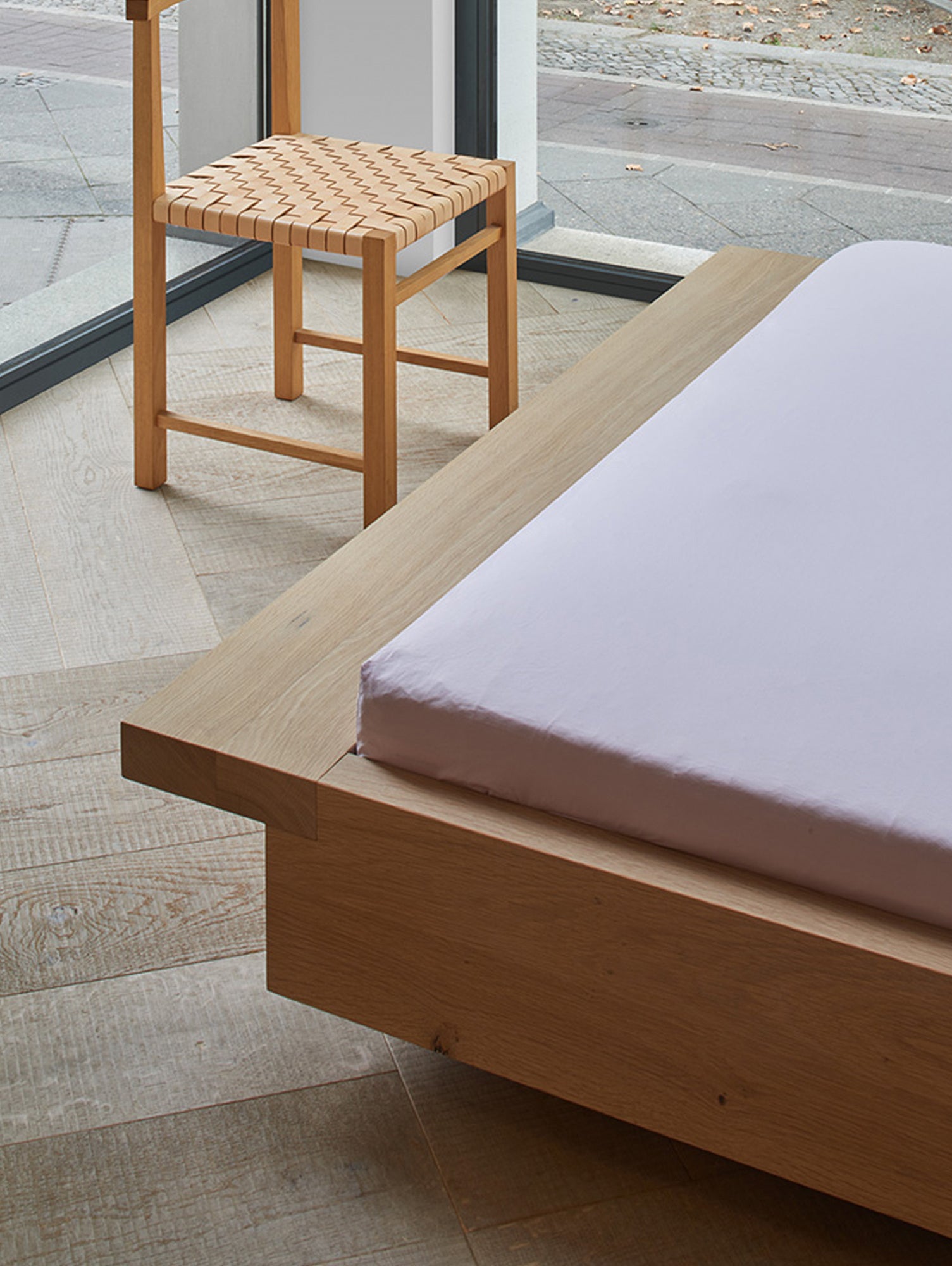 Entirely crafted with 6cm thick solid European oak with a deep recess of 19 cm, the mattress sits almost flush with the frame creating a beautiful contrast between soft and hard materials. However, the optional support brackets may be used to adjust and reduce the depth to 15cm or 11cm, if you wish for more mattress to be visible. The almost perfectly floating frame rests on runners under the base with adjustable feet.