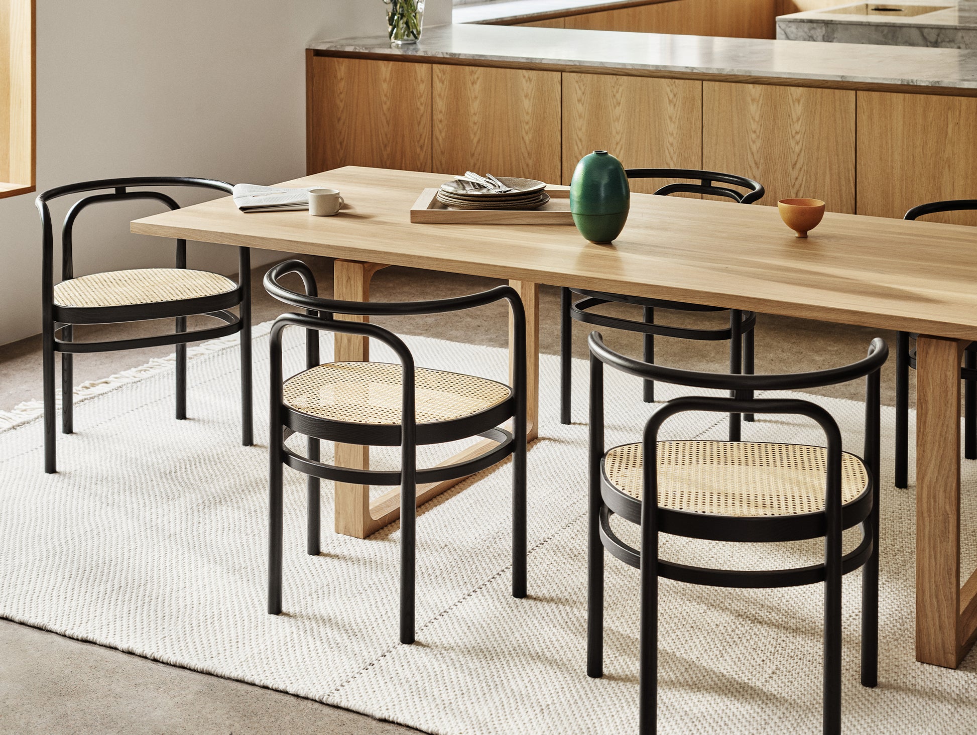The chair is mainly crafted from four continuous lengths of steam-bent treated ash and French cane, blending soft and hard elements to achieve a perfect balance of comfort and durability. This combination results in an aesthetically pleasing design that is also structurally robust. Its backrest features both linear and curved forms, complemented by straight legs. The seat is elliptical in shape, with a wide front, and French webbed wicker to add a touch of lightness. Featuring clean lines, organic shapes, and precise proportions, it is an elegant addition to any dining setting or as a statement piece on its own.