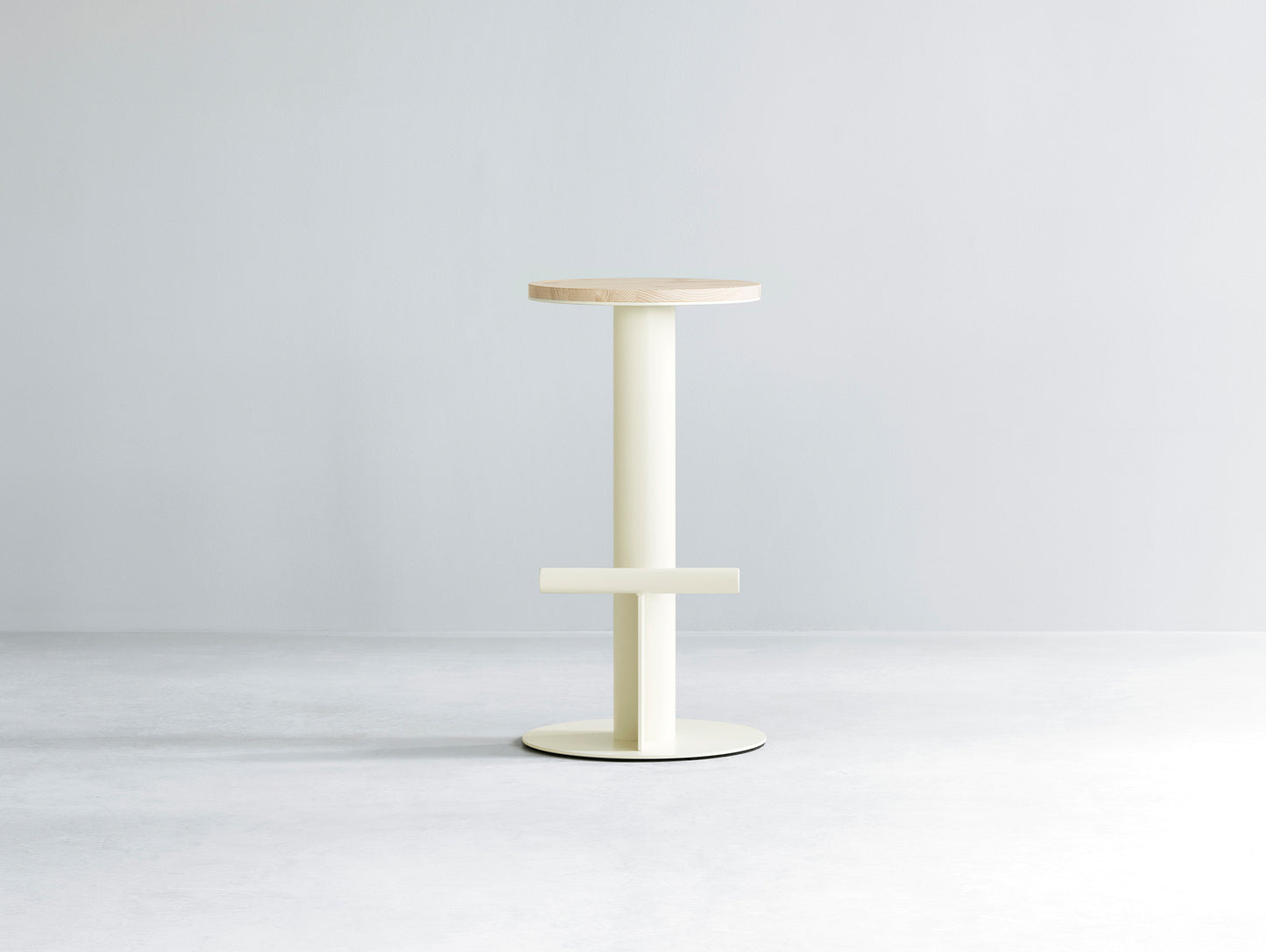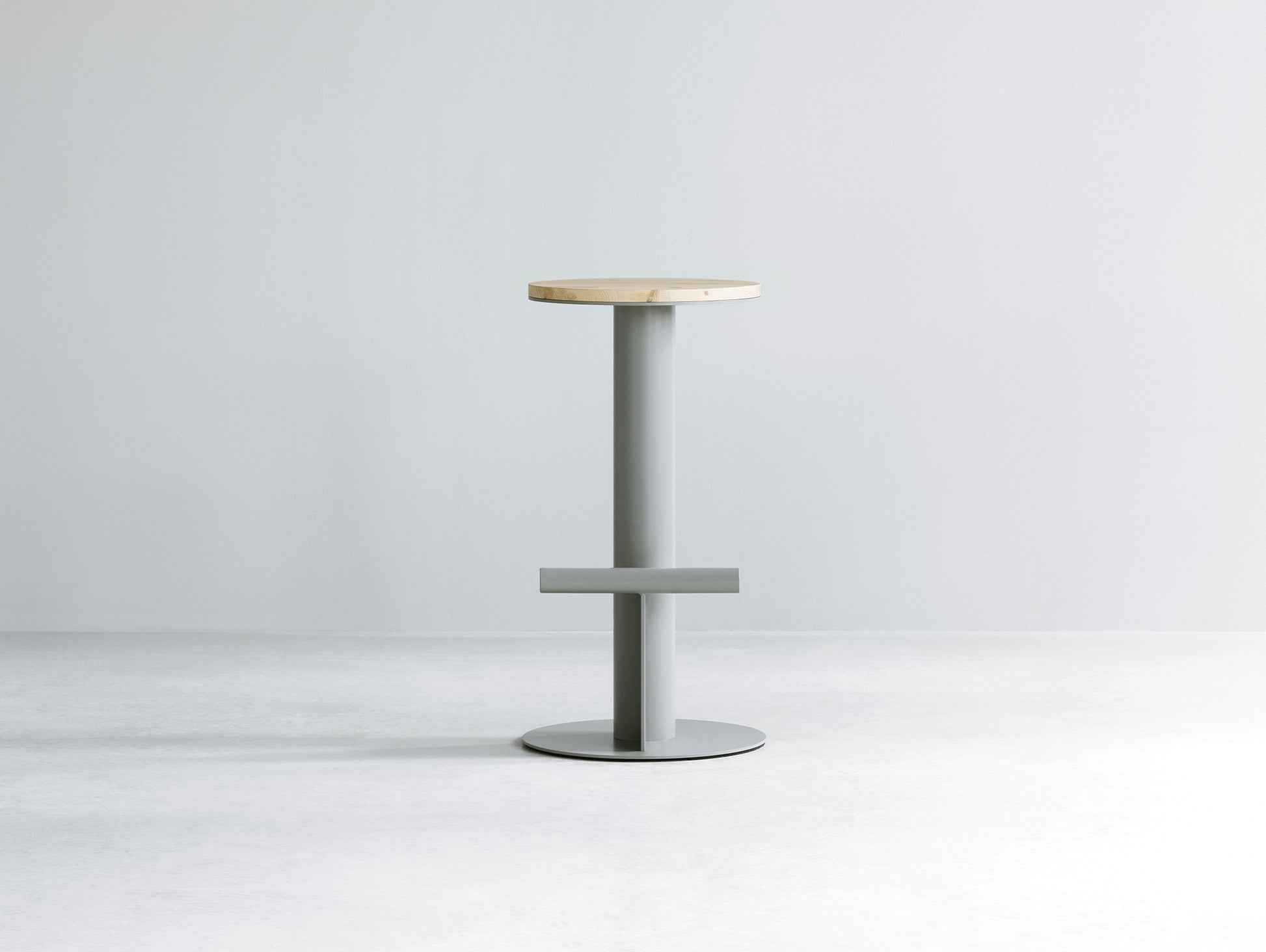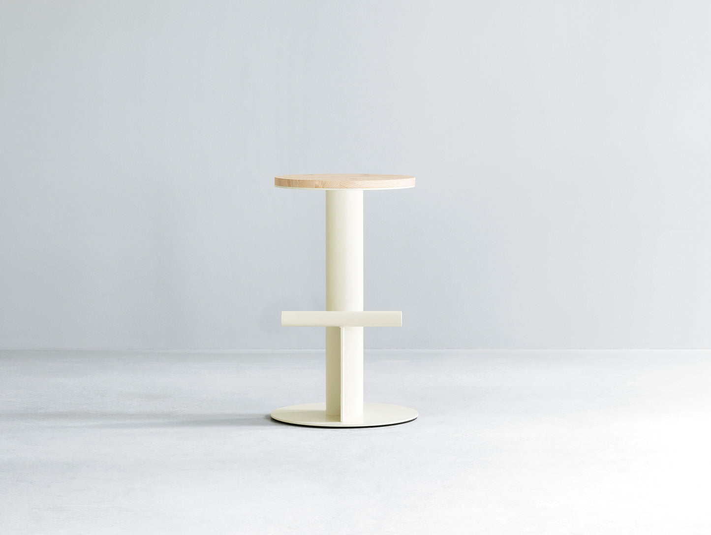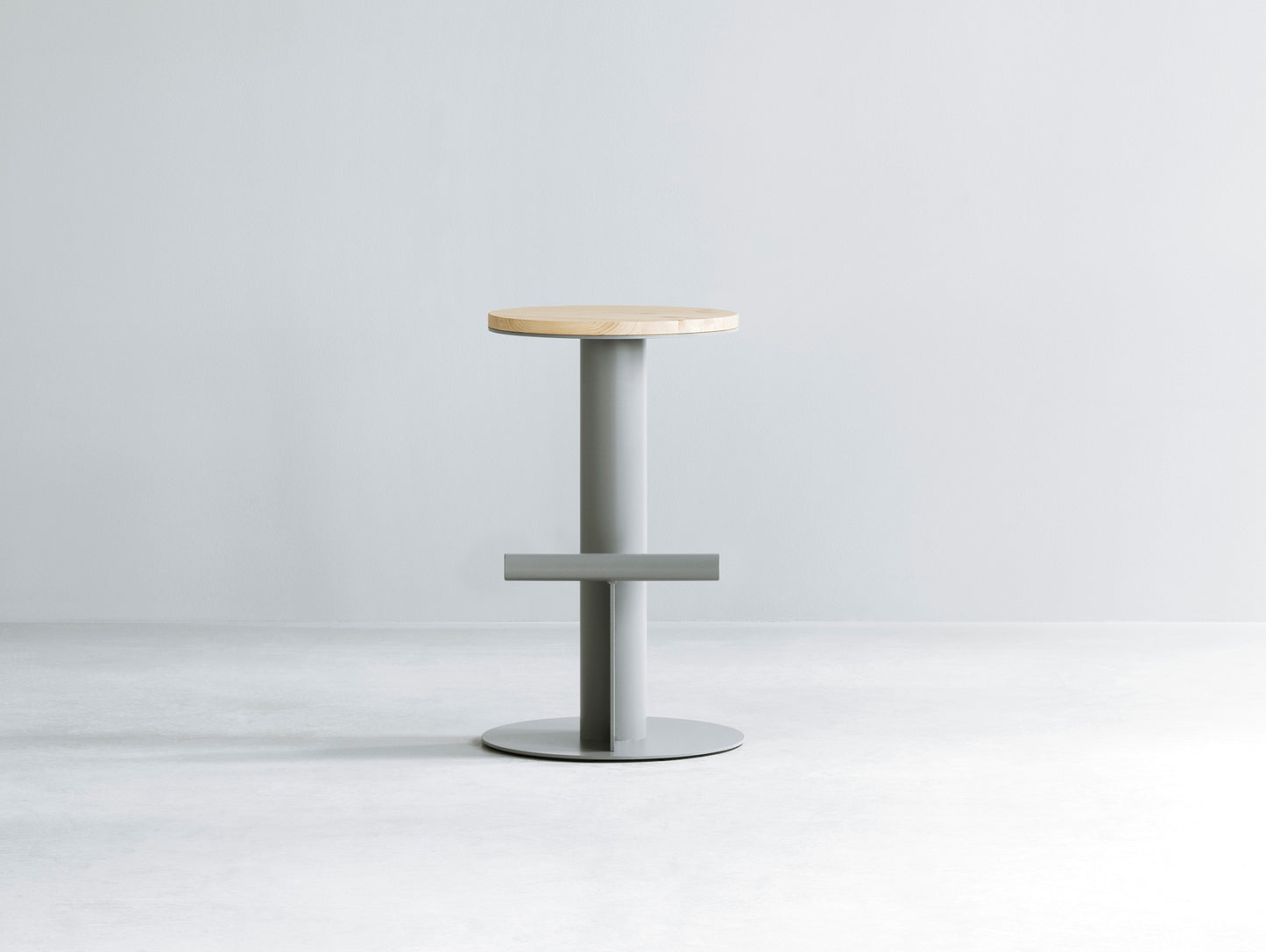The stool features a unique design with contrasting geometric elements, highlighted by a circular solid pine wood seat that rests on an unconventional base made of a powder-coated steel tube. A simple steel tube placed horizontally across the base provides a place to rest your feet, serving as both a functional and decorative element in the design.