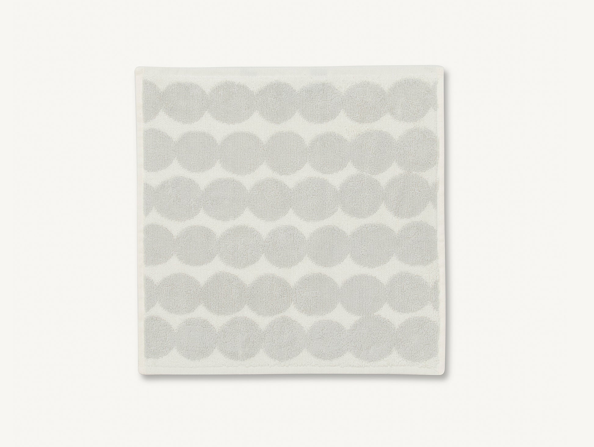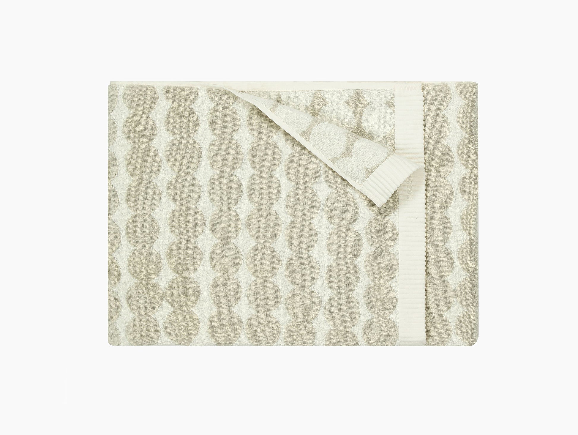 Marimekko's Räsymatto towel collection is made of soft cotton, featuring the black and white, beige and white or grey and white Räsymatto circular pattern.