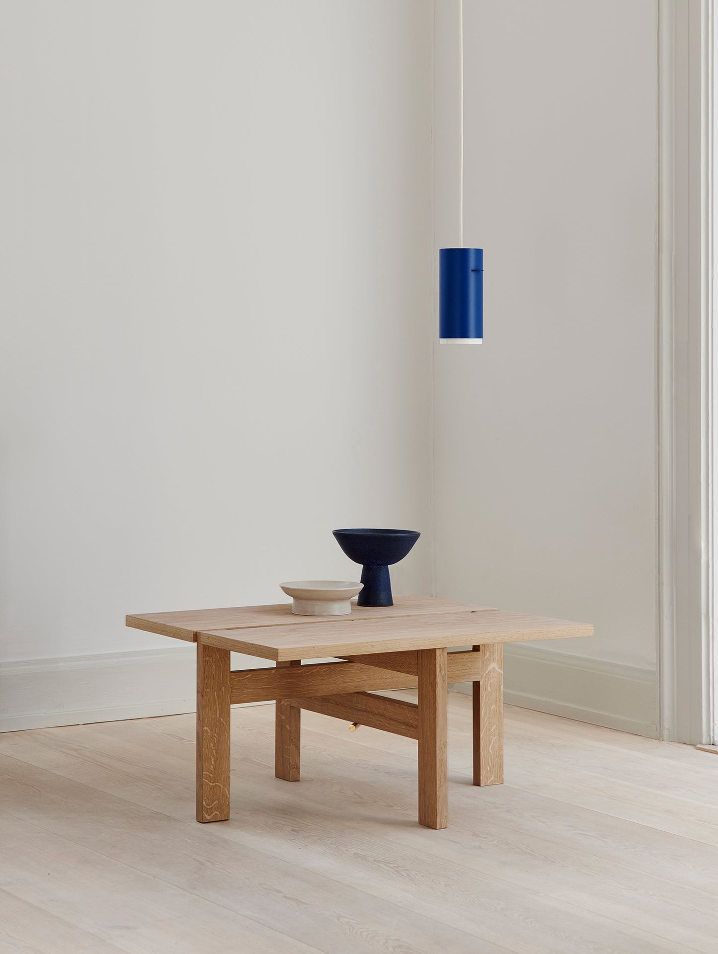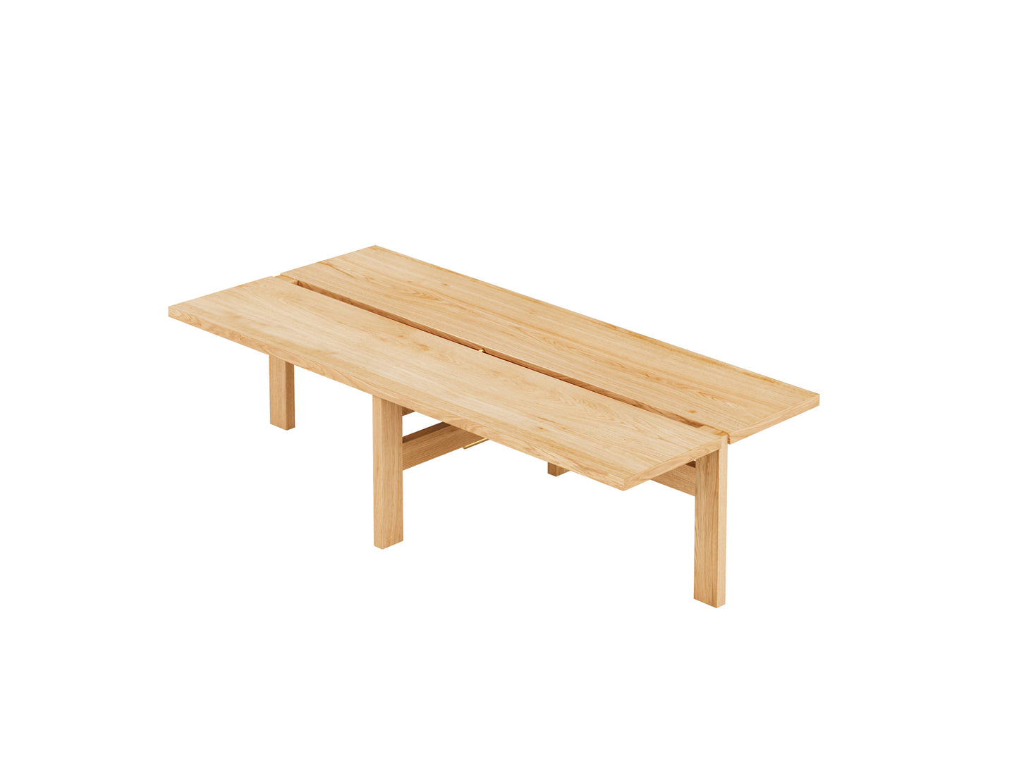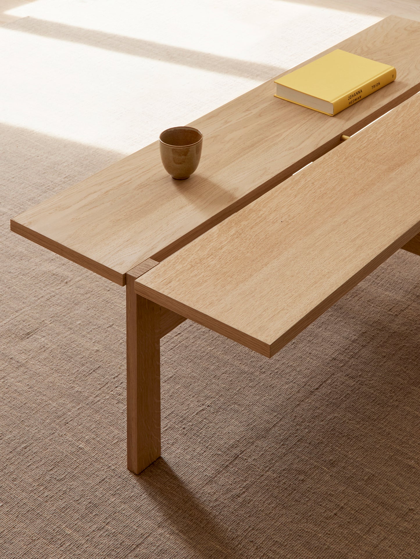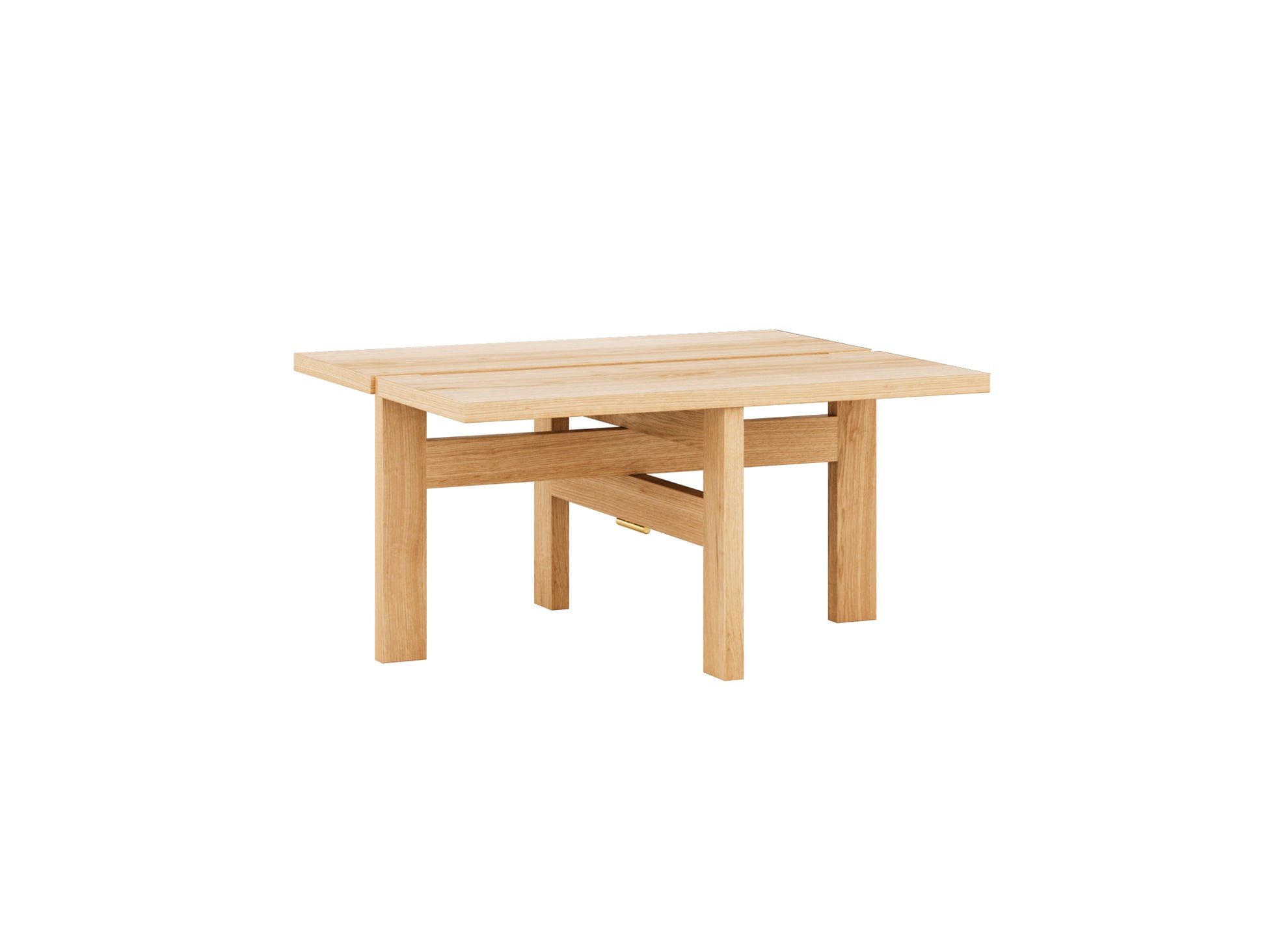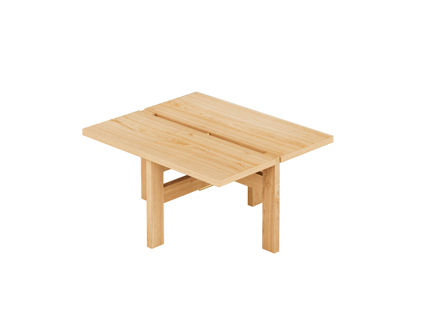 Featuring a low profile with cross-shaped legs, the table is comprised of two tabletop sections, two overlapping legs sections, dowels and brass fixings. Thanks to the thoughtful construction, the table could be easily repaired by replacing the individual parts, which means the table has the potential to last a lifetime. The clever flat-pack construction allows for simple self-assembly and a lower environmental impact through efficient shipping.