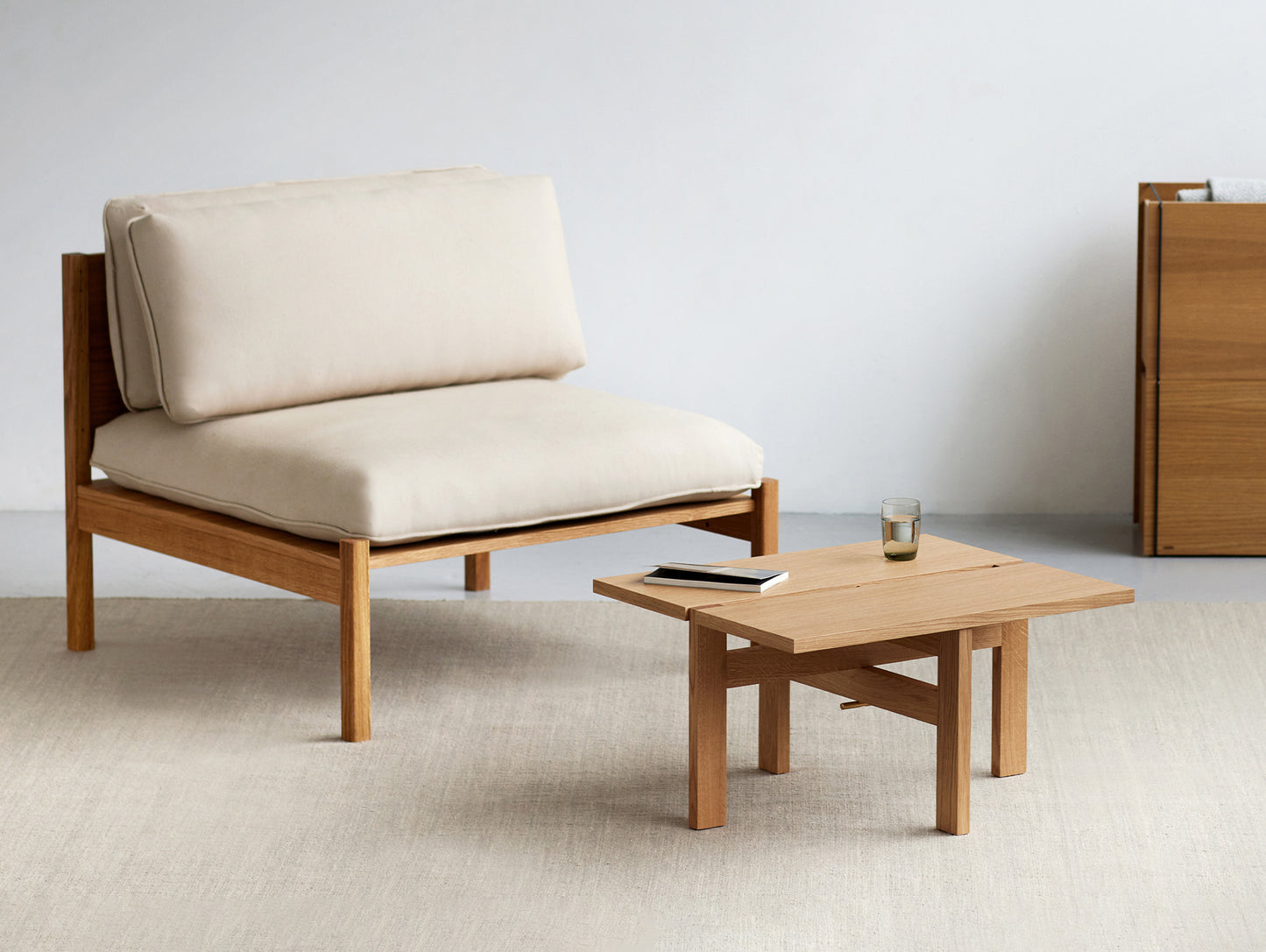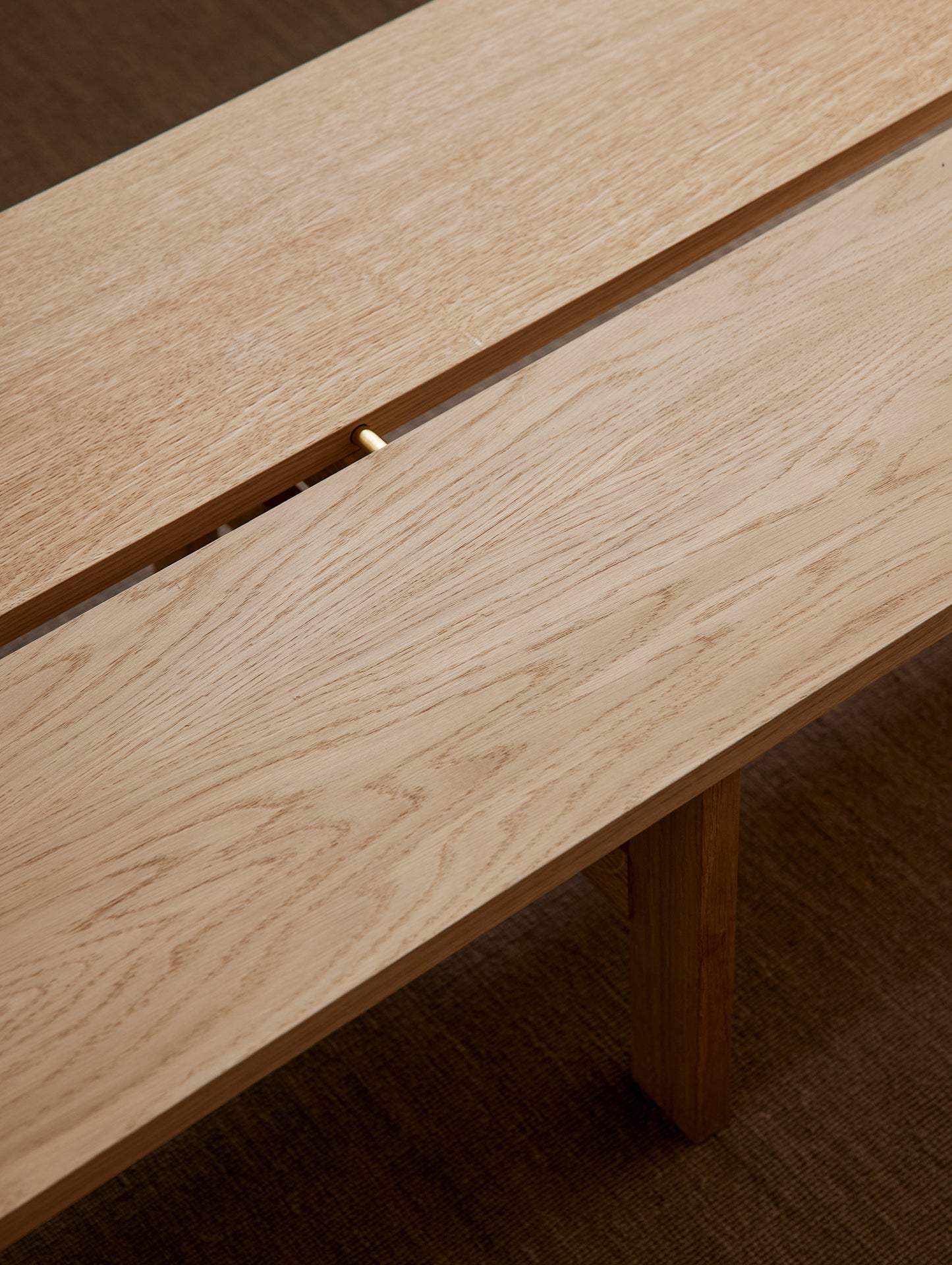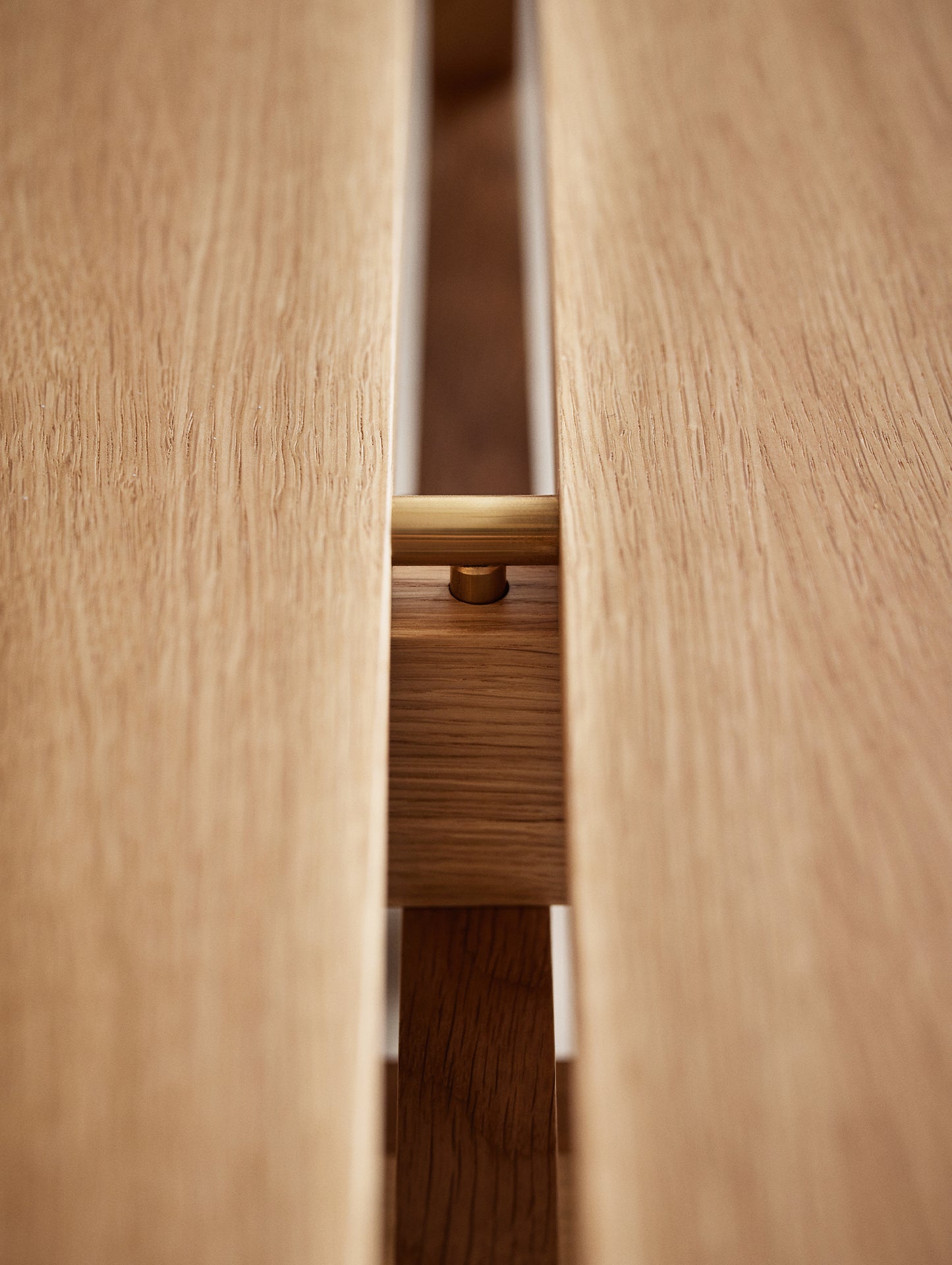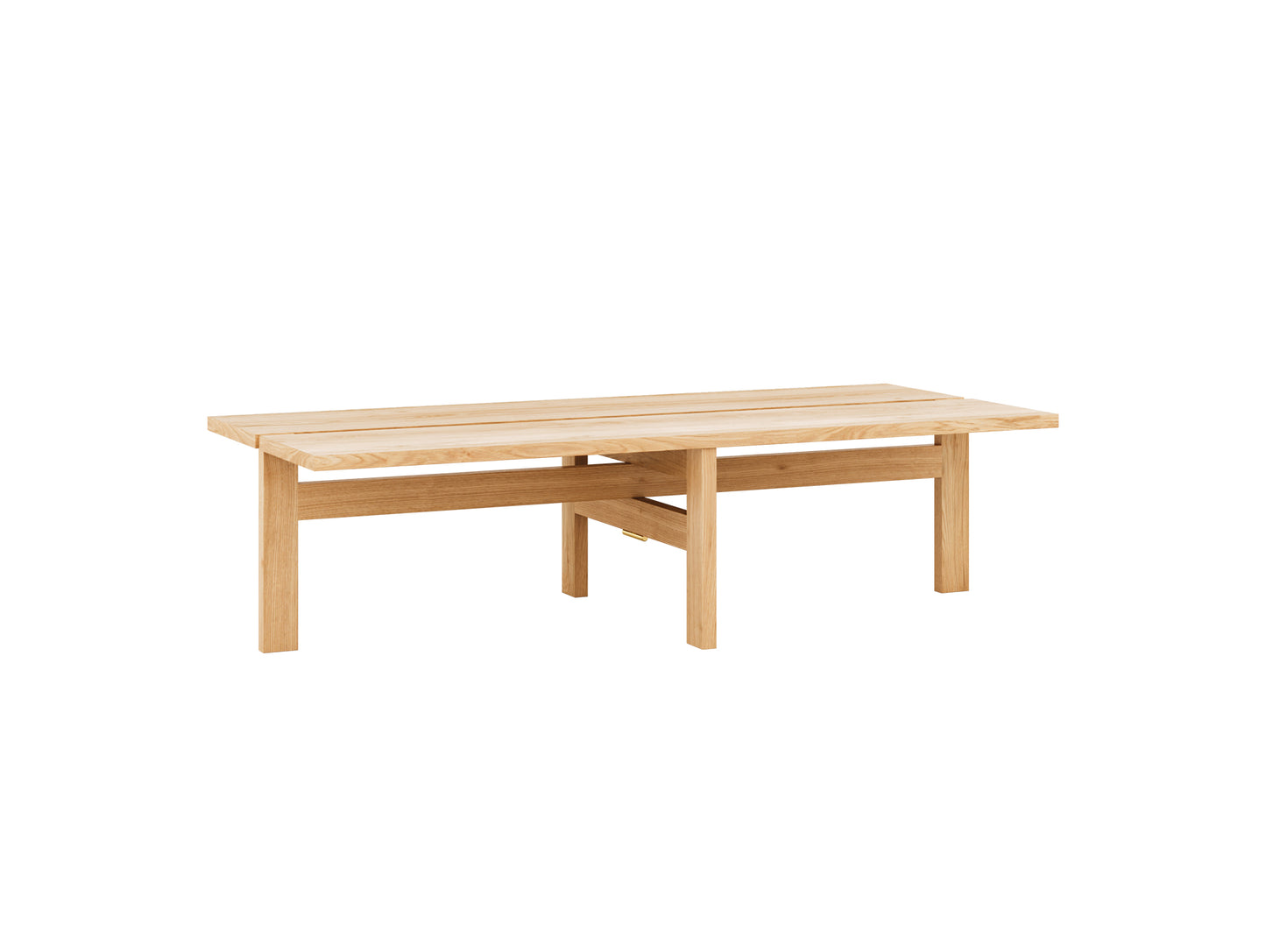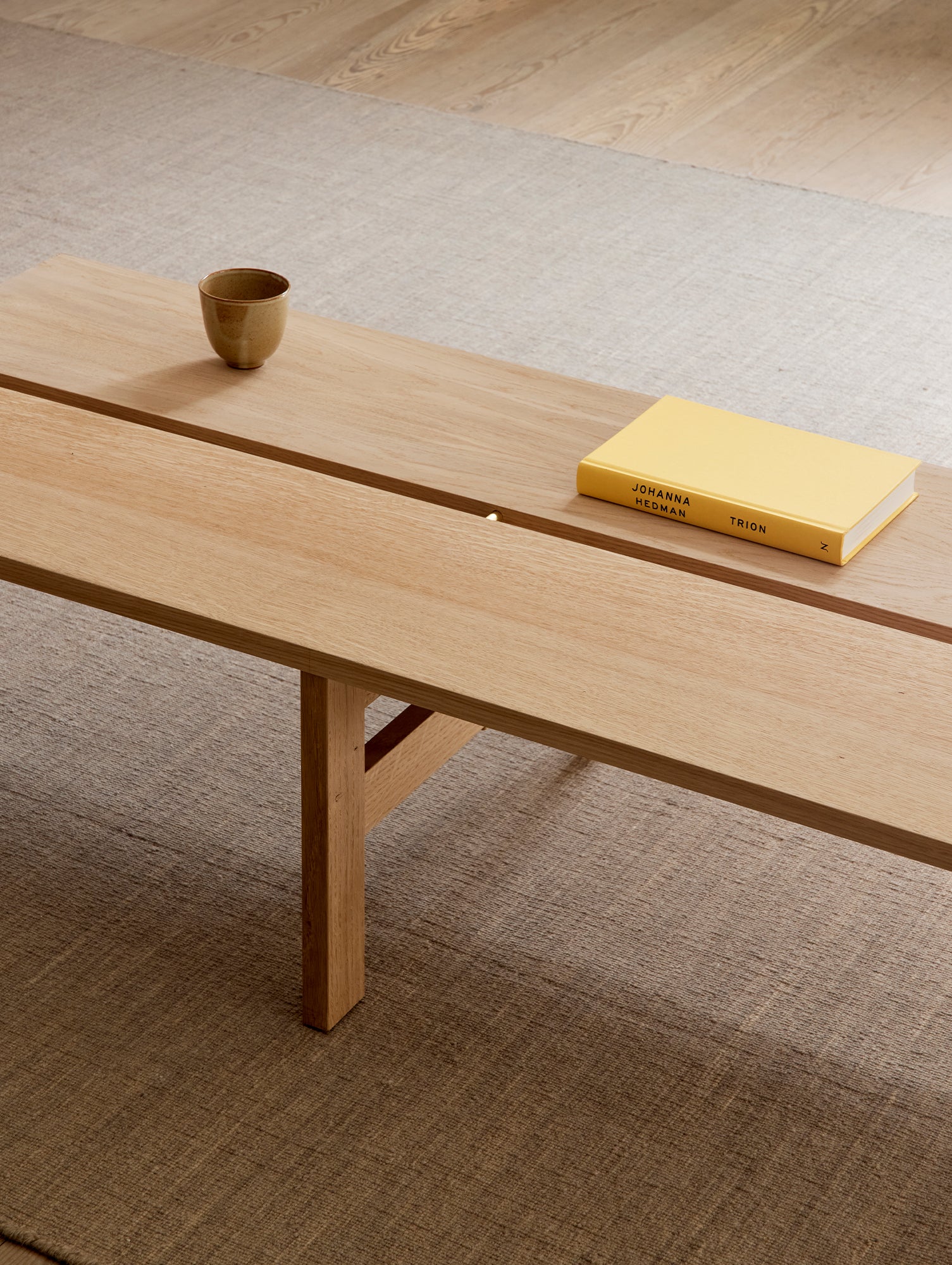 Featuring a low profile with cross-shaped legs, the table is comprised of two tabletop sections, two overlapping legs sections, dowels and brass fixings. Thanks to the thoughtful construction, the table could be easily repaired by replacing the individual parts, which means the table has the potential to last a lifetime. The clever flat-pack construction allows for simple self-assembly and a lower environmental impact through efficient shipping.