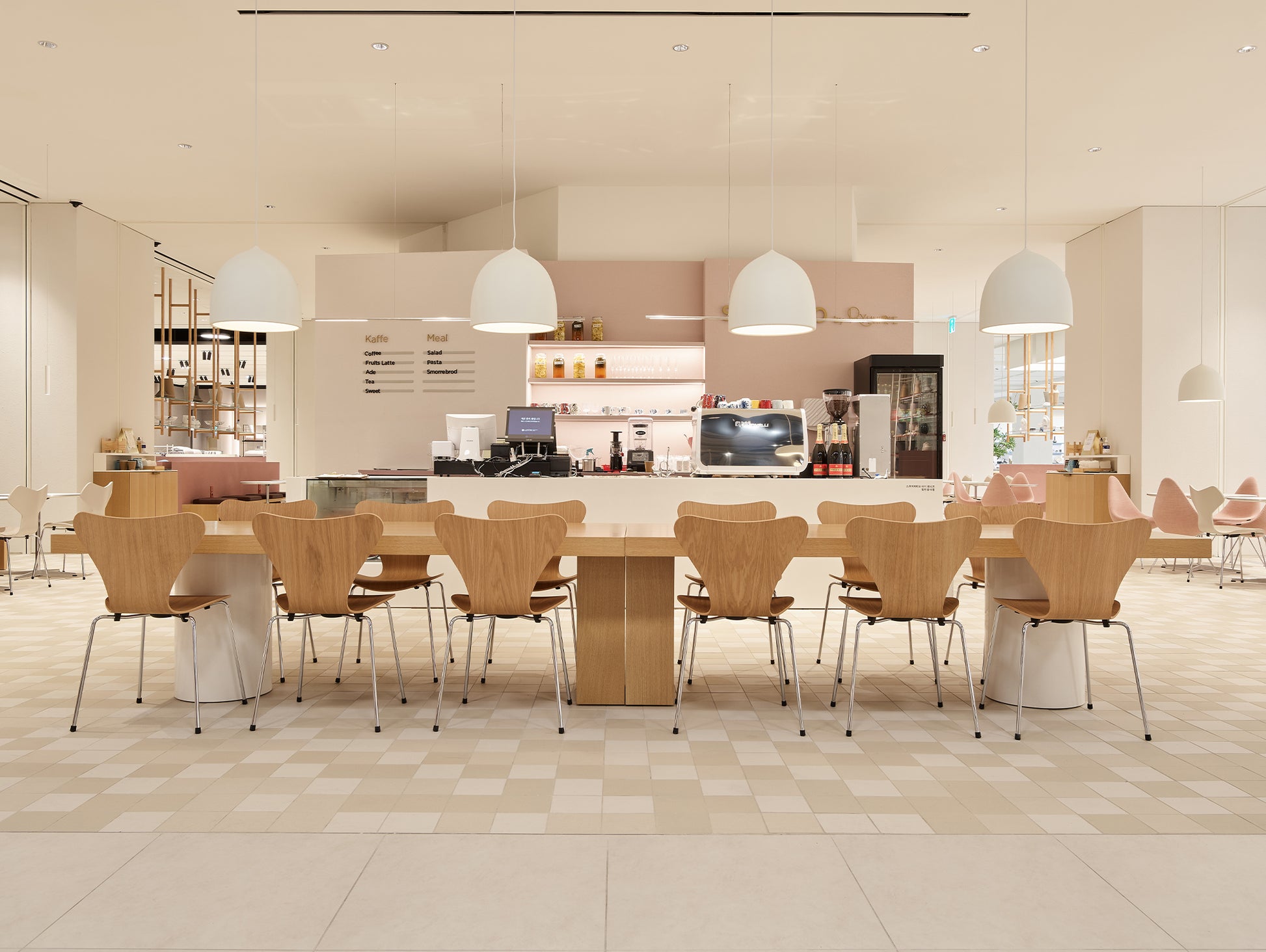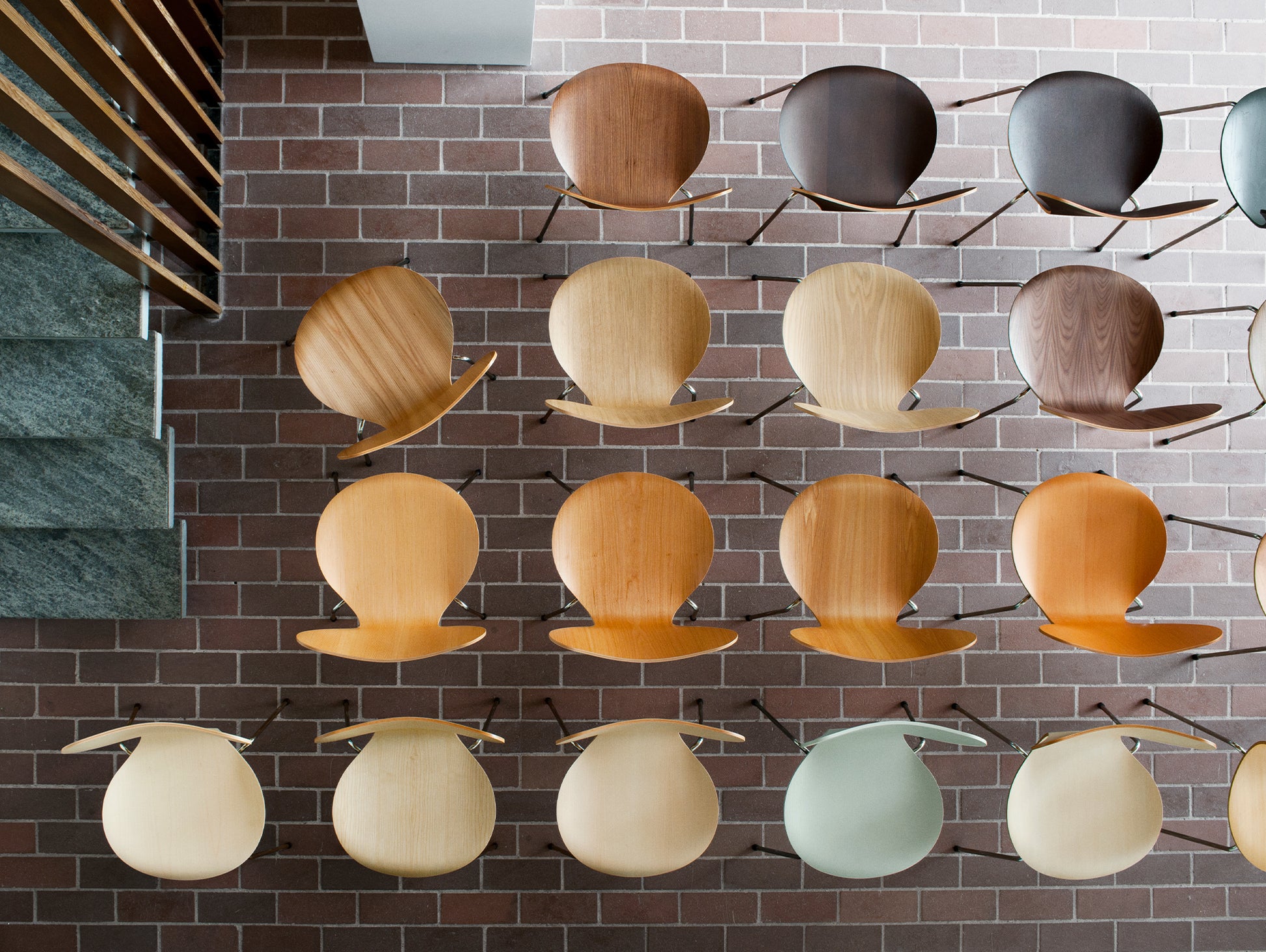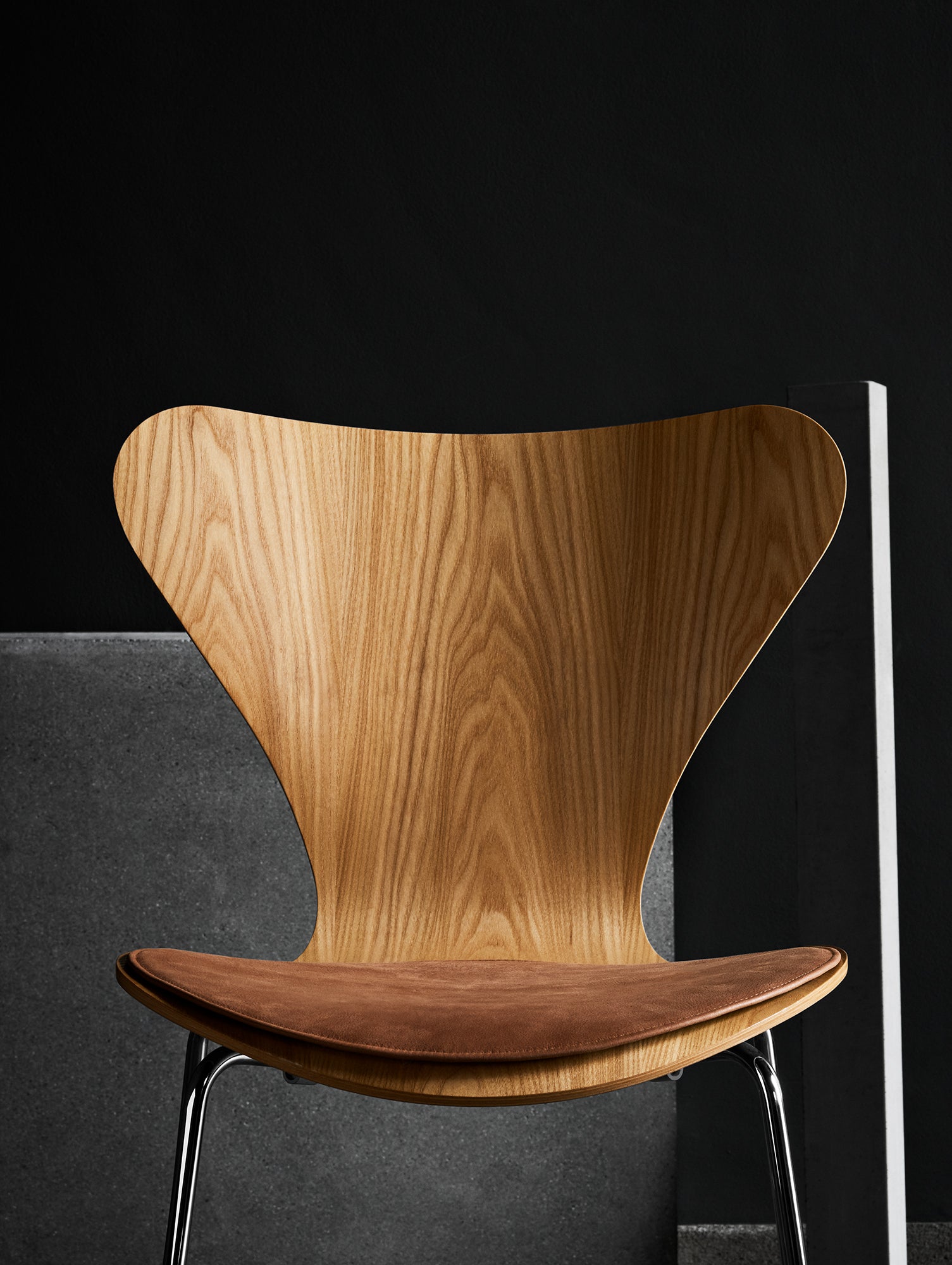 The shell of the Series 7 chair is crafted from pressure-moulded wood veneer, comprising seven inner layers and two outer layers on both the front and back. The inner veneer is always beech, while the outer veneer offers a selection of 10 natural types. The base, made from 14mm steel tubes, features legs discreetly mounted to a circular disc beneath the seat, enhancing the clean, minimalist aesthetic of Jacobsen's design. Thanks to its superior quality, durability, and flexible design, the chair offers maximum comfort despite its slender appearance. The Series 7 Chair is lightweight and robust, and can be stacked up to 12 chairs high in a compact tower.