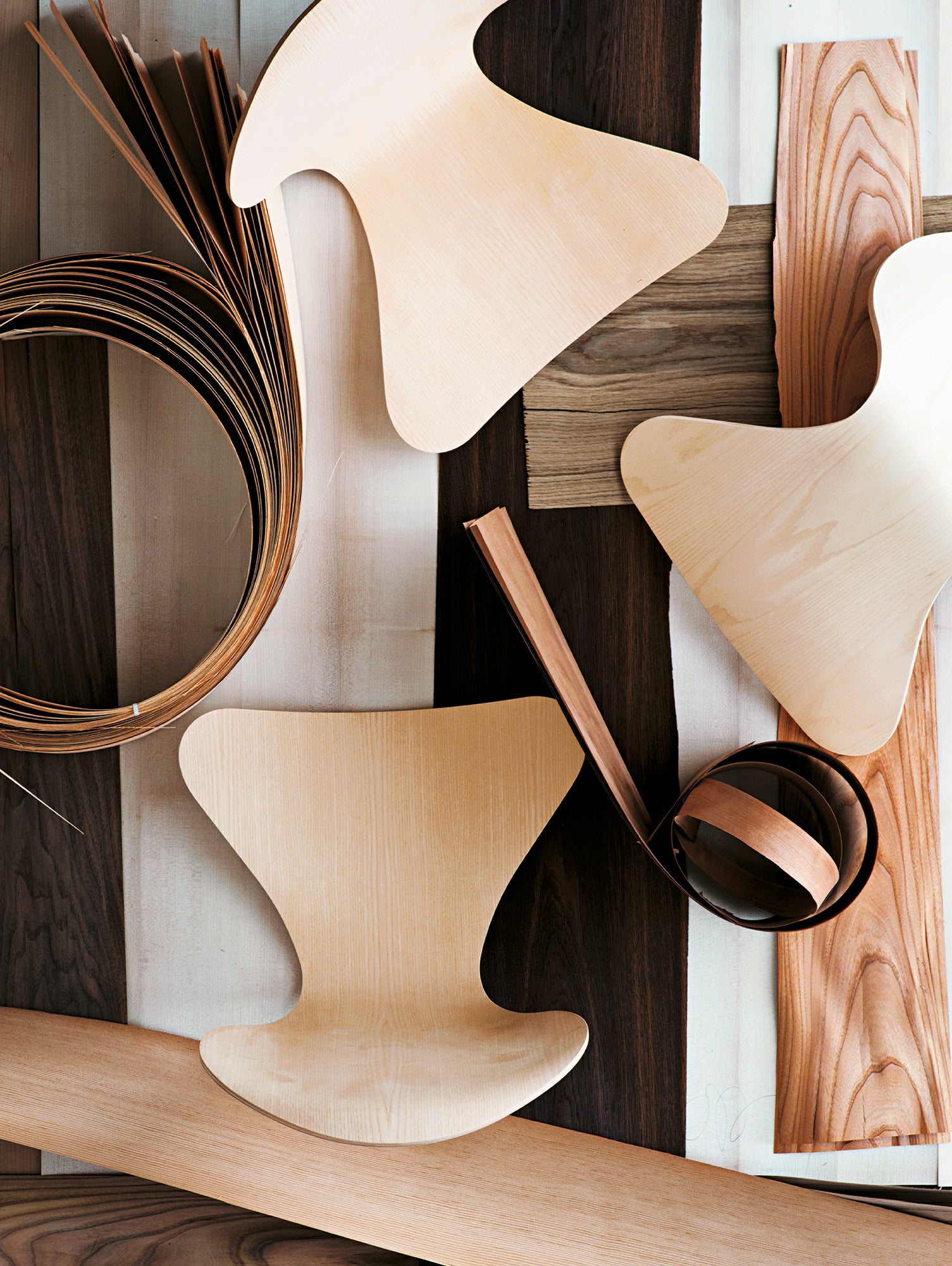 Shell - Pressure-moulded veneer, comprising 7 layers of inner veneer and 2 layers of outer veneer on both front and back. Available in PEFC-certified beech, oak, ash, maple, cherry, walnut, Oregon pine, and elm veneers. The veneer layers are glued together with water-based urea-formaldehyde glue. Un-upholstered chairs are coated with polyurethane lacquer, which prevents the emission of formaldehyde.