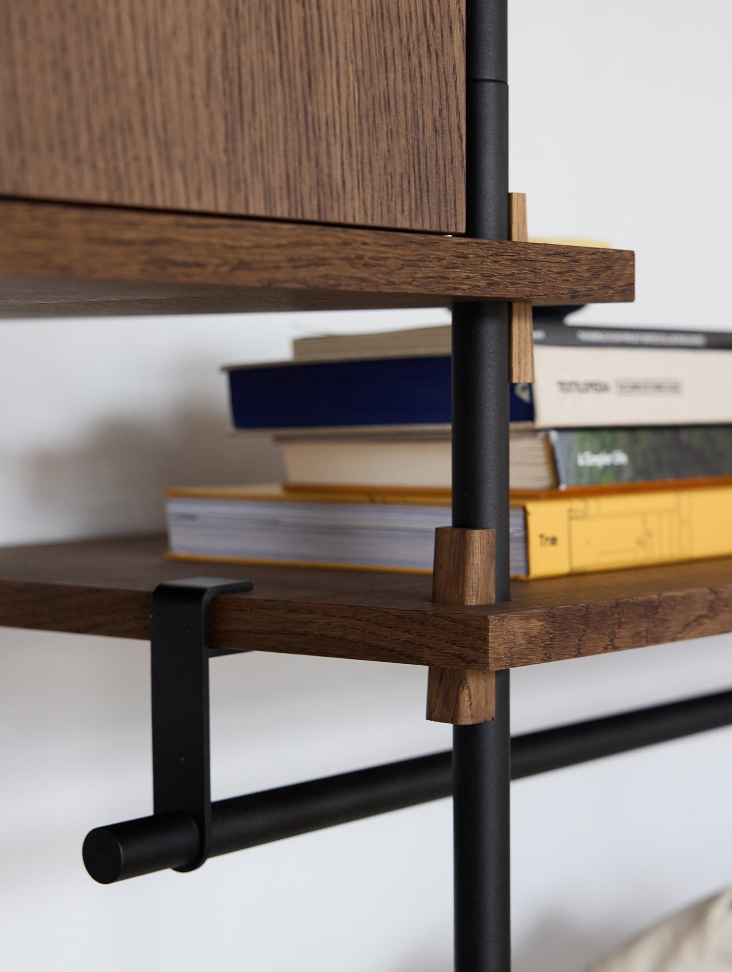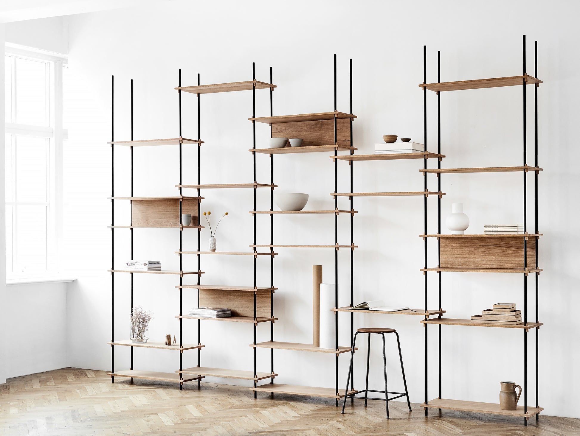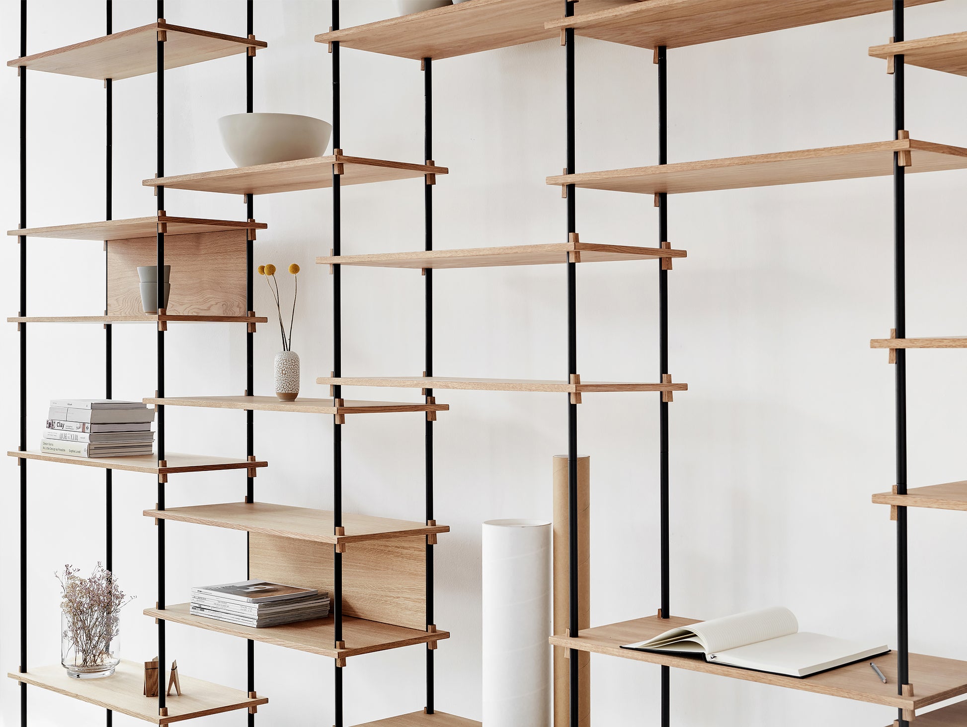 Shelving System by Moebe is made entirely from individual components, giving you infinite possibilities for how it can fit within your home or office space. Uprights are made from steel poles painted black or white, whilst shelves attach at any height of your choosing and are held in place with solid pieces of oak.