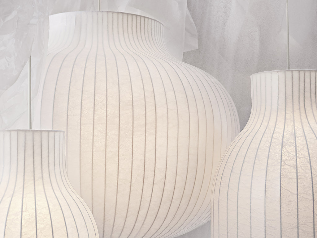 Designed in various sizes and shapes—three open and two closed—the Strand Pendant Lamp provides both diffused lighting through its cocoon materials and direct lighting through its top and bottom opening, hovering lightly in space, bringing comfort, harmony and a refined sensitivity into any room. The design can be used separately or in scattered clusters and clean formations whether it be a dining area, entrance hall, lobby space or living room.