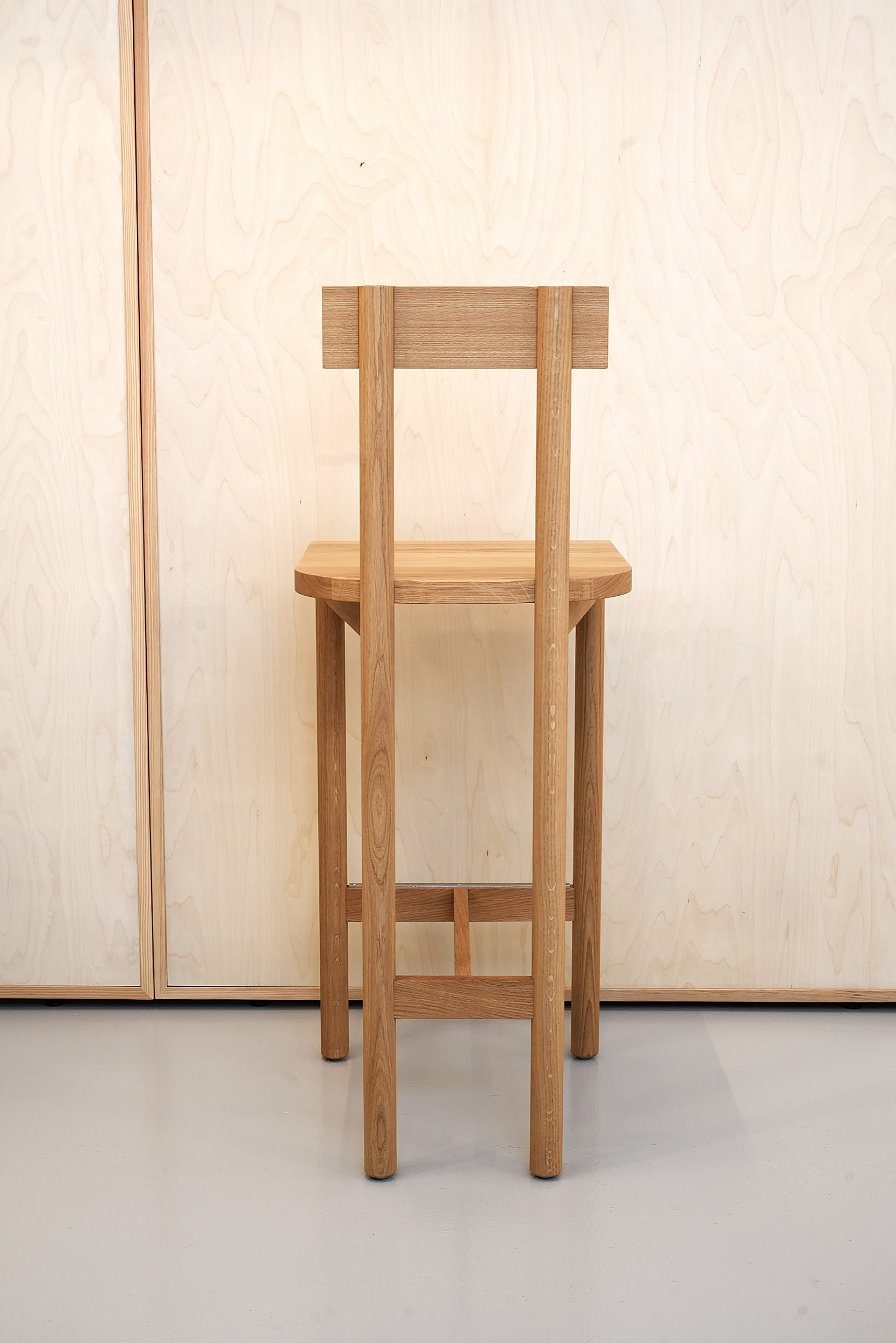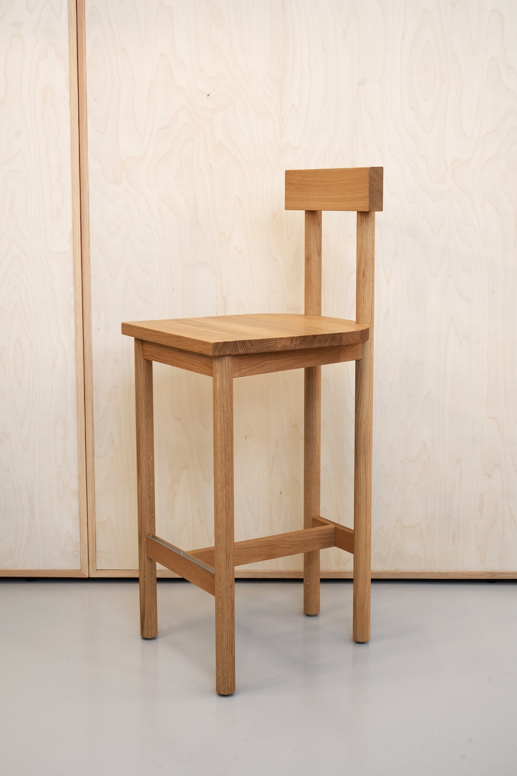 At the back of the stool, the cylindrical legs extend through the seat and slot neatly into semi-circular grooves which are milled into the solid backrest. Featuring no visible joints, screws or bolts, the Gamar Stool shows e15's expert craftsmanship and manifests the brands dedication to minimalism. The gently curved backrest ensures that this stool is suited for longer periods of sitting. The additional footrest provides extra comfort. Balancing a robust construction with deliberately simple aesthetics, the Gamar Stool is a versatile piece bringing the warmth of solid wood and uncomplicated design to its surroundings.