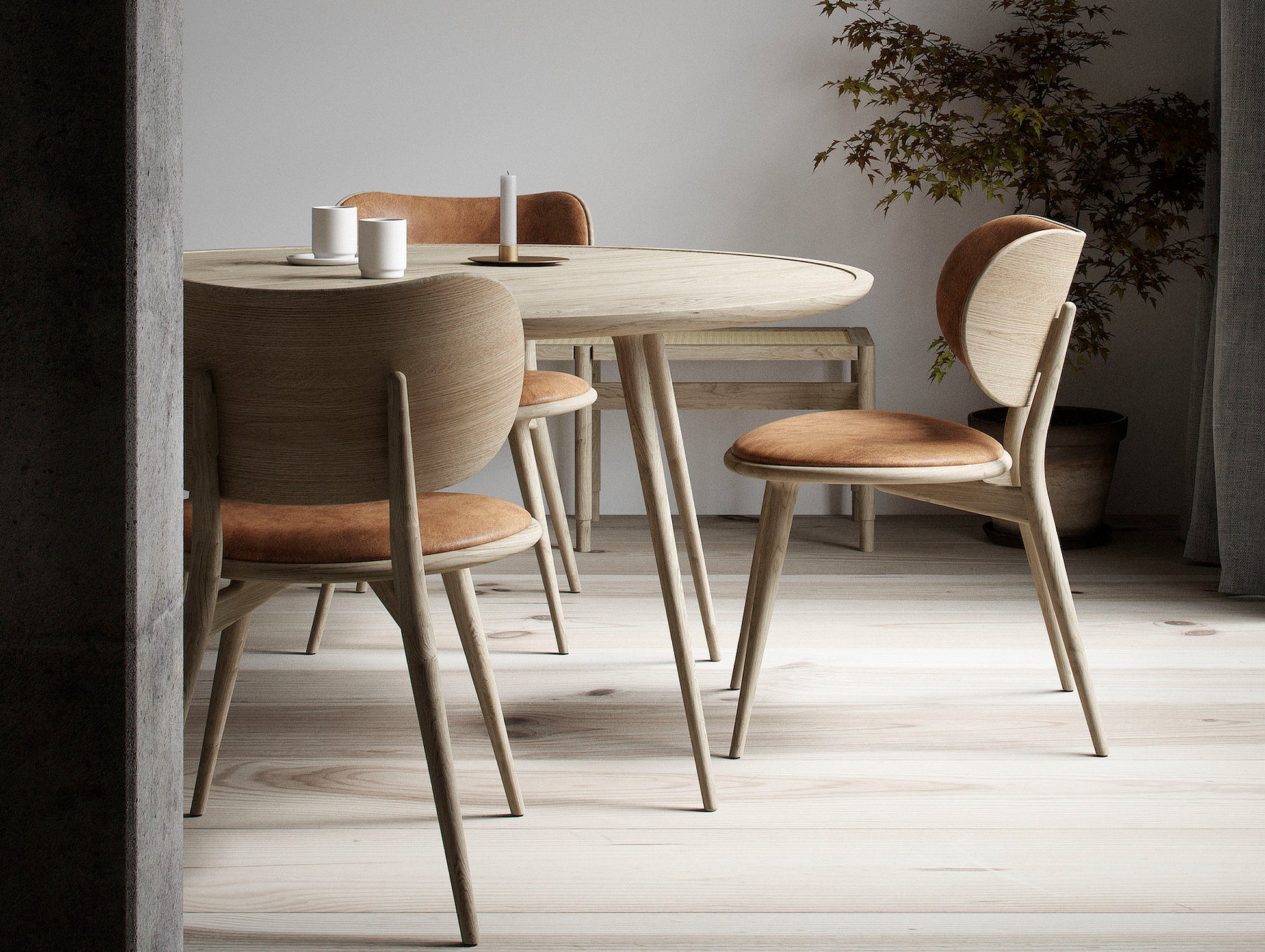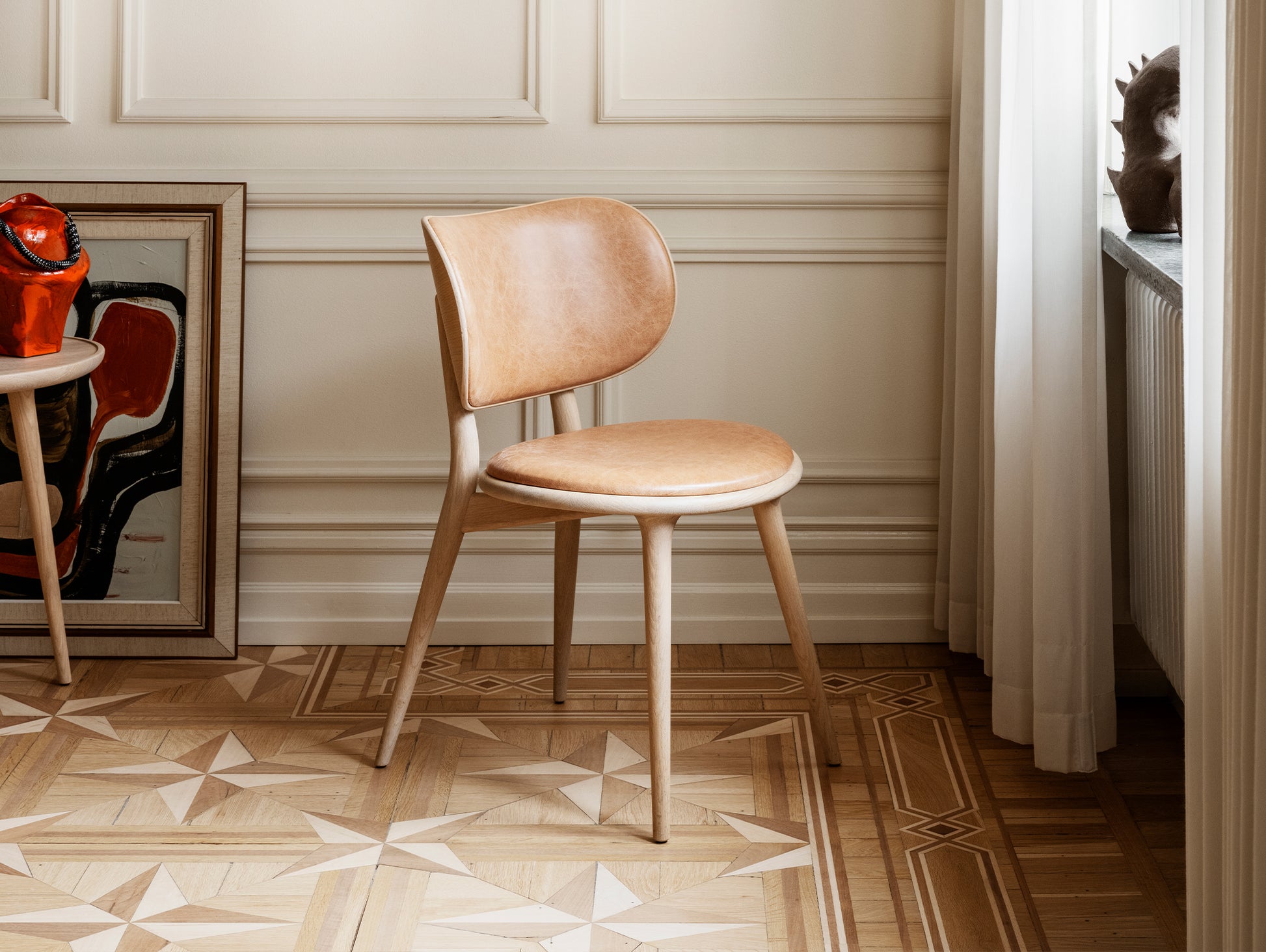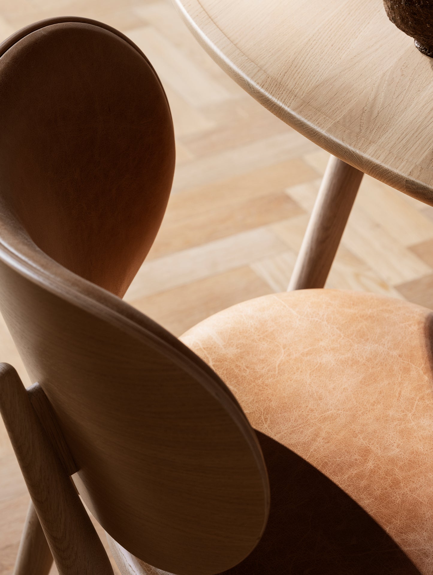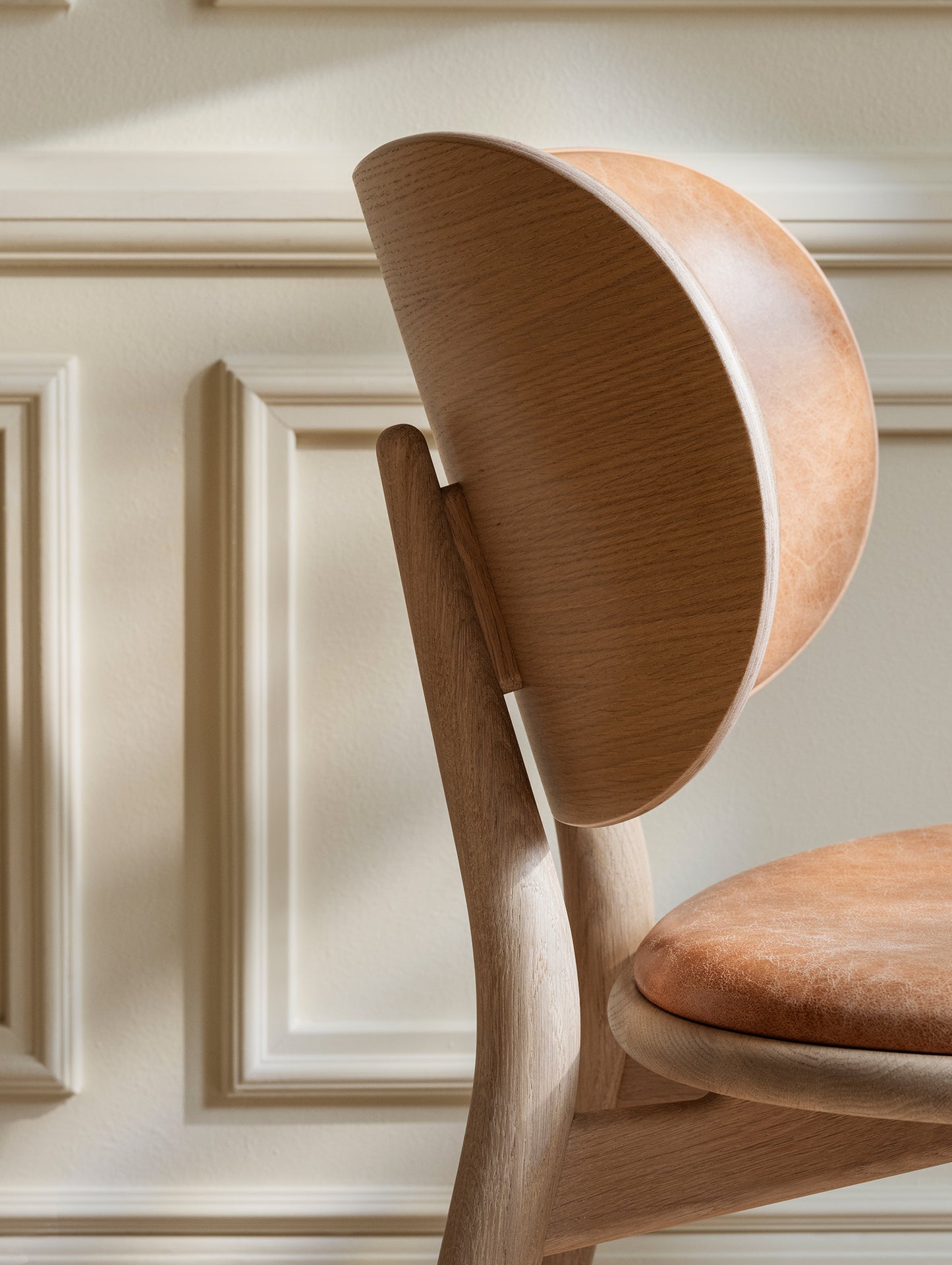 Constructed from sustainably sourced solid oak or beech wood using traditional woodturning methods: 'The Dining Chair' features a wrap-around steam-bent veneer backrest and genuine leather seat/back pads. Each chair is handmade and finished using the finest traditional craftsmanship skills, making it remarkably robust and an heirloom piece of furniture. With its organic yet minimalist style, the chair has a unique silhouette which emanates timeless style and quality.