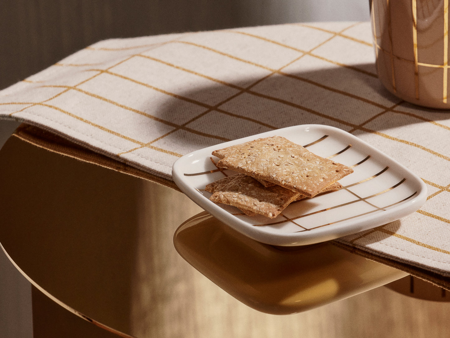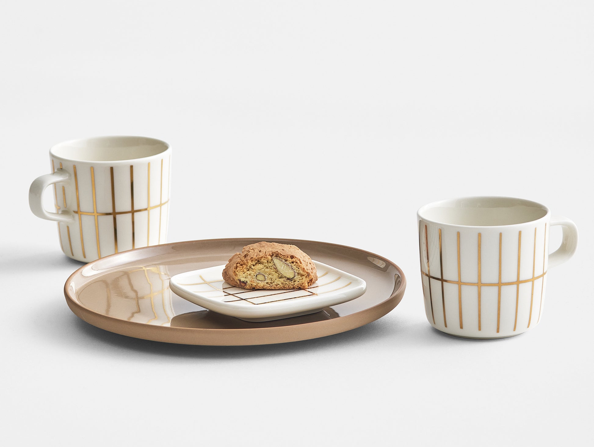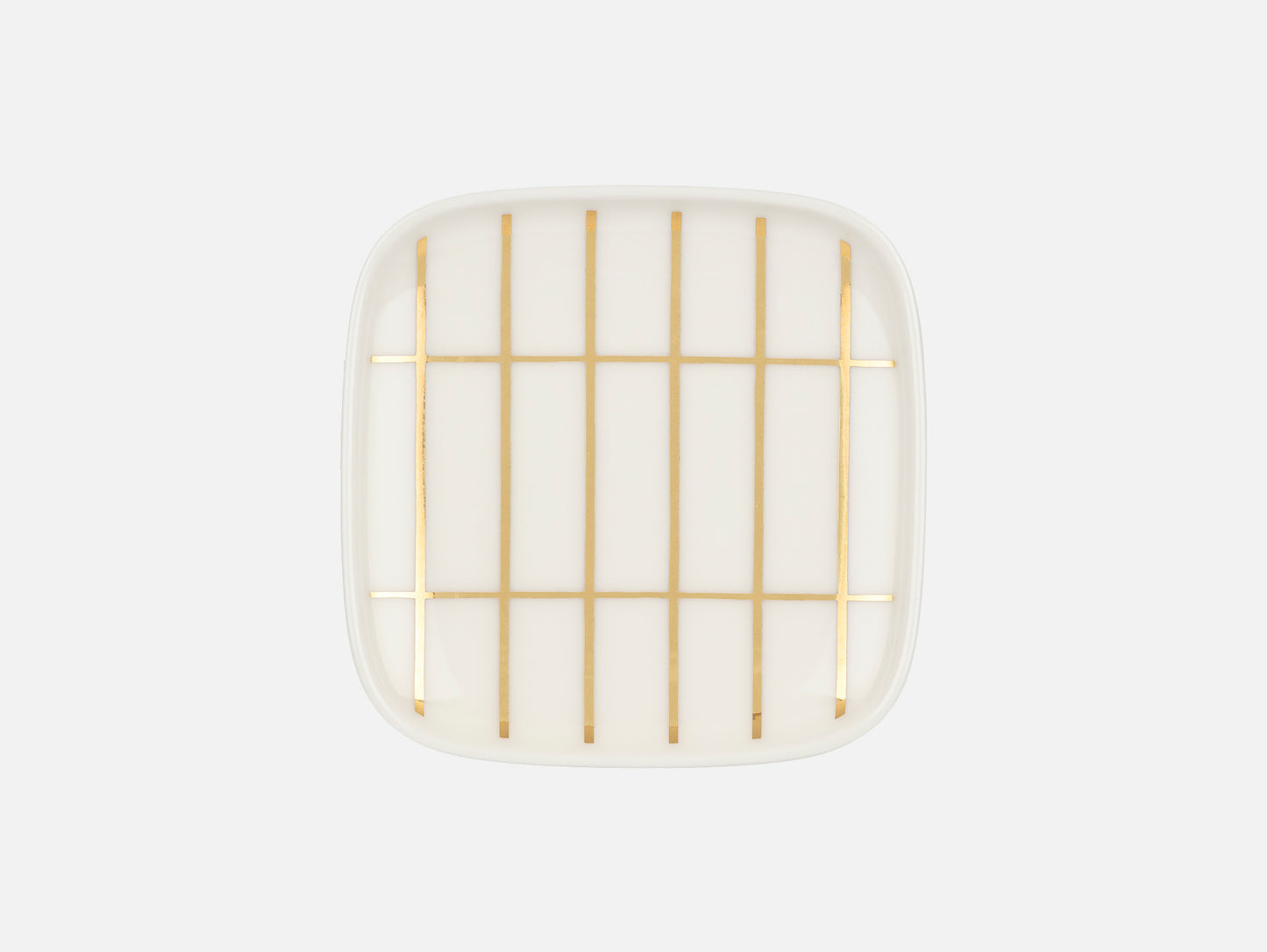 The Tiiliskivi (brick) pattern is adorned on this small square Marimekko Oiva plate in gold and white. The Tiiliskivi pattern was designed by Marimekko’s founder Armi Ratia in 1952. The pattern reflects her belief in the simple beauty of everyday life.