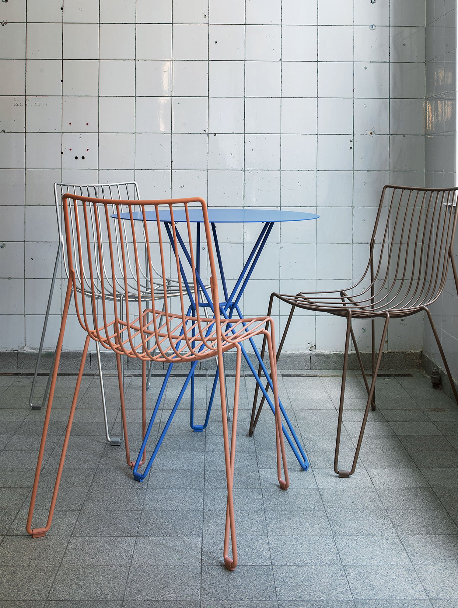 “The design for “Tio” was the end result of a few months of thinking, sketching and sculpting. My point of departure was to arrange a fan of wires into a comfortable seat and then connect them in a straightforward and logical frame, which minimised the amount of steel used. So really the appeal comes from pragmatic thinking, executed within the restraints of the materials characteristics and according to an industrial production process. Sounds clinical, but the result is something I find very pleasing. For those who find steel wires too hard, we have developed an upholstered cushion to give extra comfort during long dining sessions.” – says Chris Martin.
