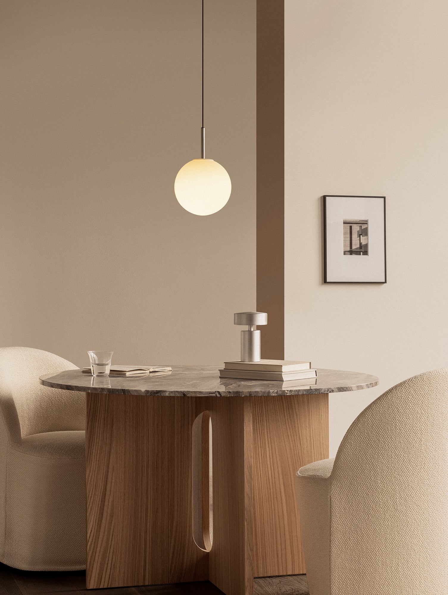 TR Pendant light from Audo Copenhagen is a minimal light fitting utilising (and including) the TR Bulb. The TR range is a clever solution for modern city living. Instead of focussing on the design of complex new fixtures, the series is all built around a simple opal glass sphere - the bulb itself. The TR bulb is a dimmable LED light source; its elegant, spherical form hides the lamp fitting, while the opal glass diffuser creates an even, harmonious, warm glow – preventing glare.