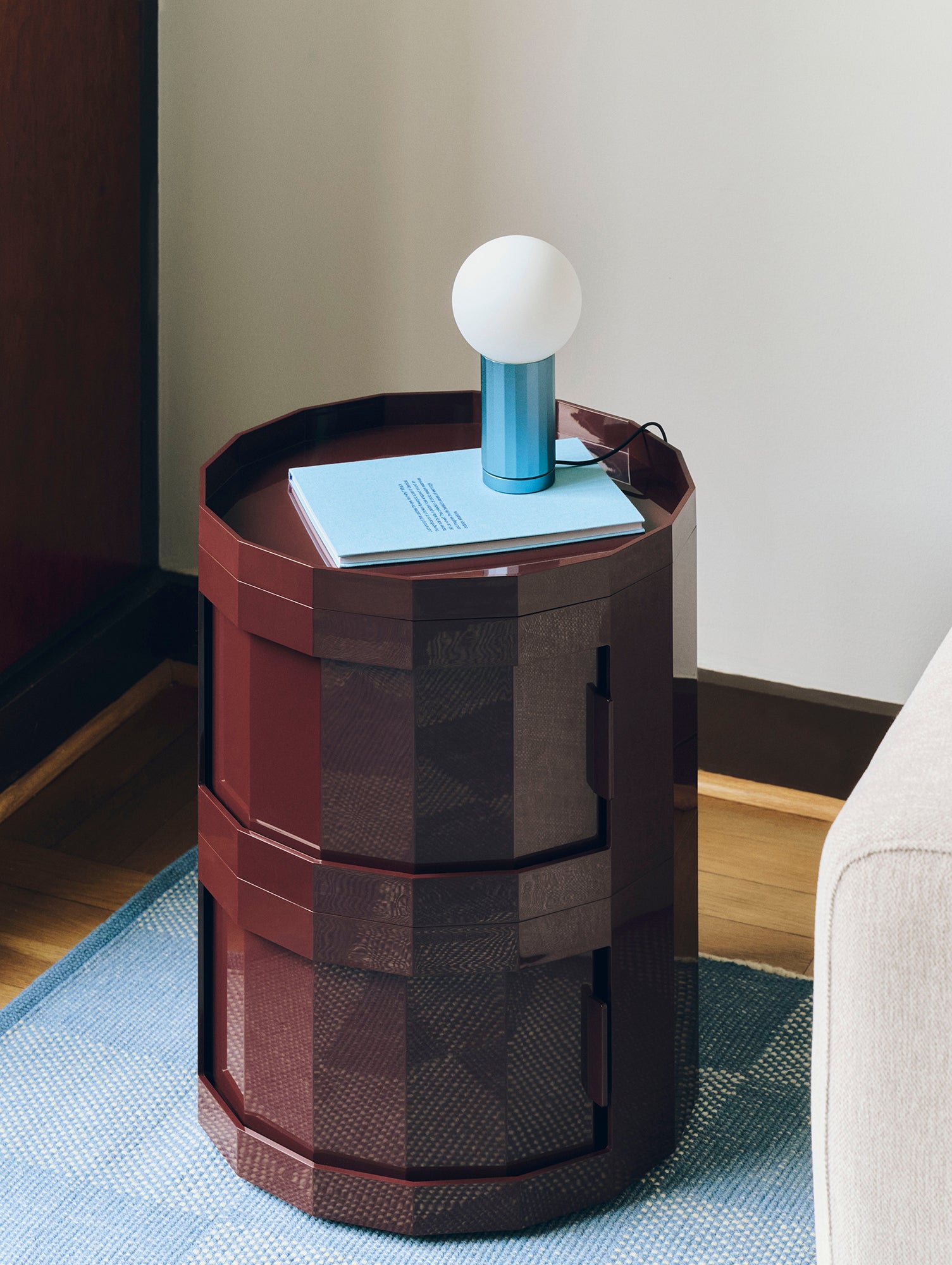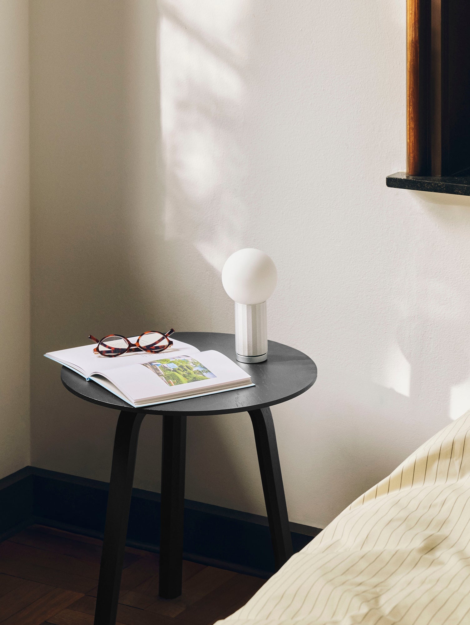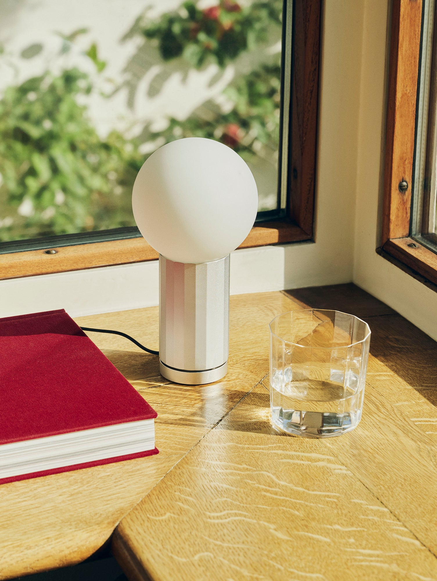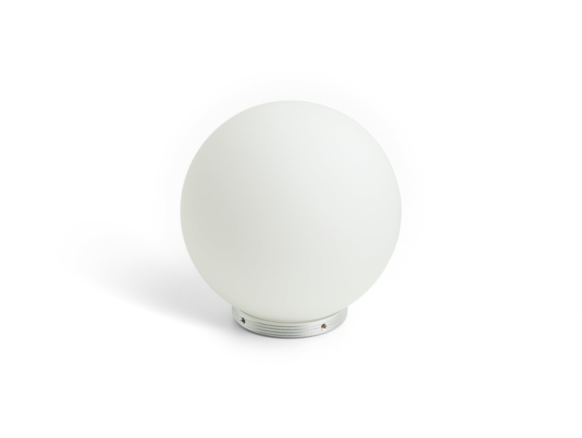 A beautifully unified piece of design made from aluminium and opal glass. The base is a faceted cylinder that works as both the light switch and the stem that holds the spherical glass light in place. Turning the base in a clockwise direction clicks the LED light on, with further rotation increasing the lumen output. This dimming movement built into the design, allows the user to intuitively brighten or dim the light.