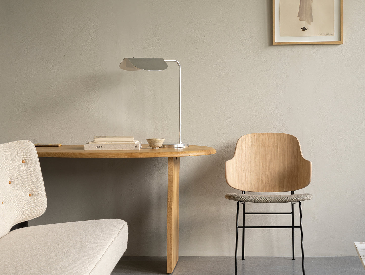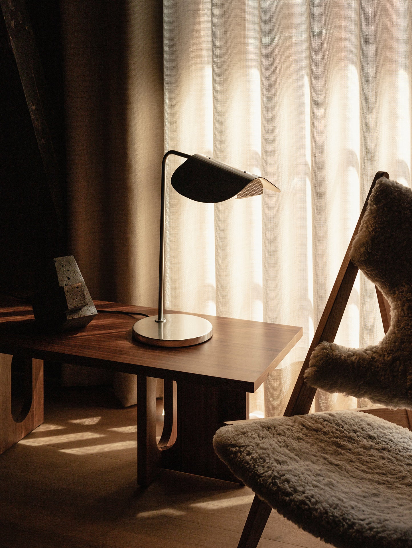Designed to resemble the wings of a flying bird, the folded metal shade creates playful shadows and engaging movement with the 360-degree rotating shade, allowing the light beam to be directed wherever it is needed. With its simple and minimal design, the Wing Table Lamp effortlessly blends into a range of settings and can be used in many rooms from domestic environments to commercial spaces.